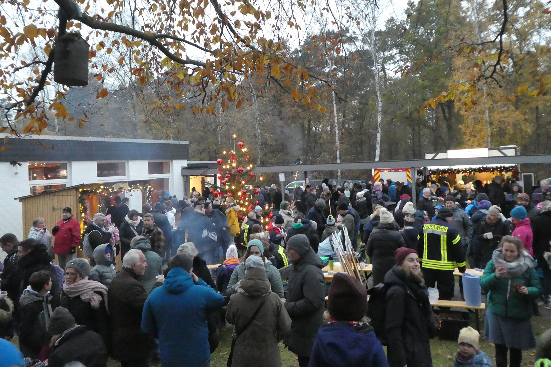 Bei passend winterlich trockenem Wetter, zu Beginn waren sogar vereinzelte Schneeflöckchen dabei, strahlte der große Weihnachtsbaum an der Martin-Luther-Kirche bunt in den Himmel. Die offenen Feuer für Stockbrot und Flammlachs verbreiteten heimelige Atmosphäre. Es duftete nach Glühwein, Puffer, Waffeln und Bratwurst. Viele Leckereien waren zu genießen. Kaffeeduft lockte in den Gemeindesaal, wo ein gigantisches Kuchen- und Tortenbuffet verzauberte. Im Kirchen-Vorraum boten Ehlershäuser Frauen traditionell selbst hergestellte Strickstrümpfe, Marmeladen, Plätzchen und mehr Weihnachtliches an.