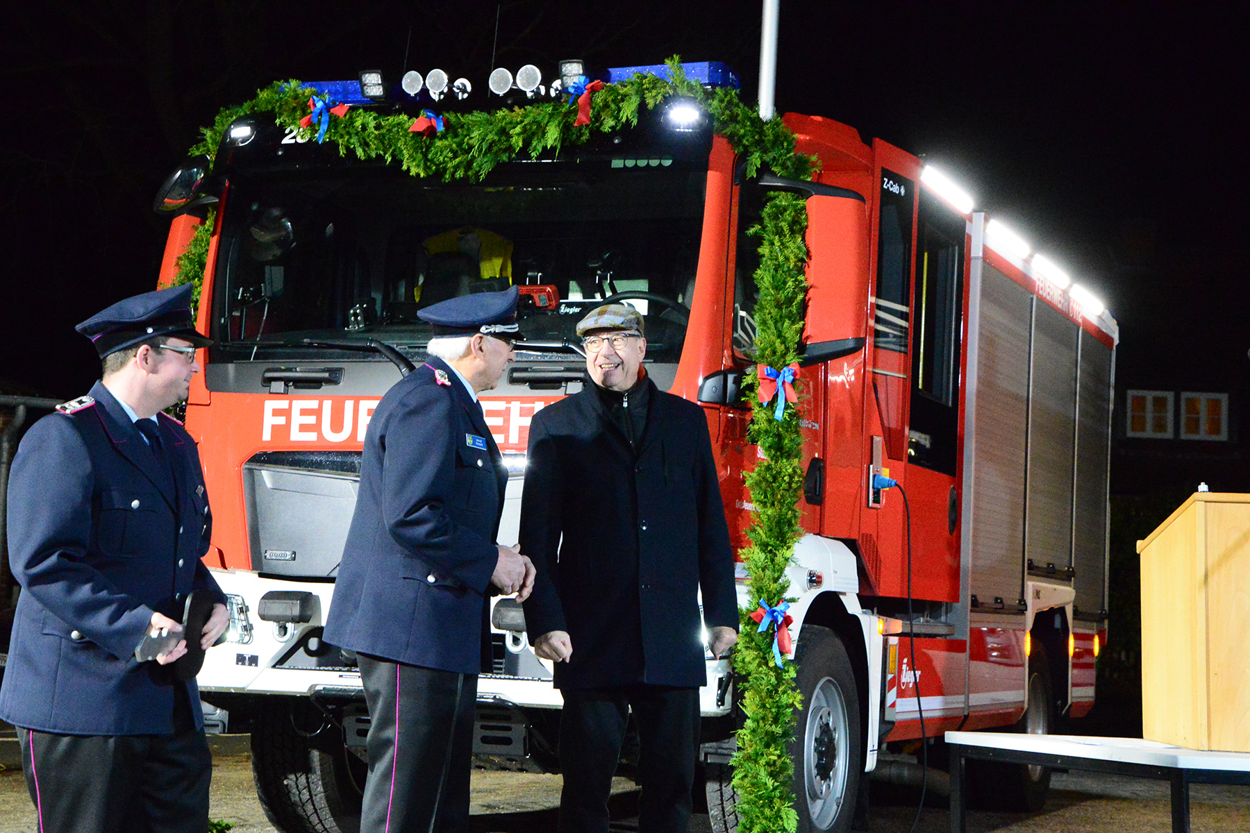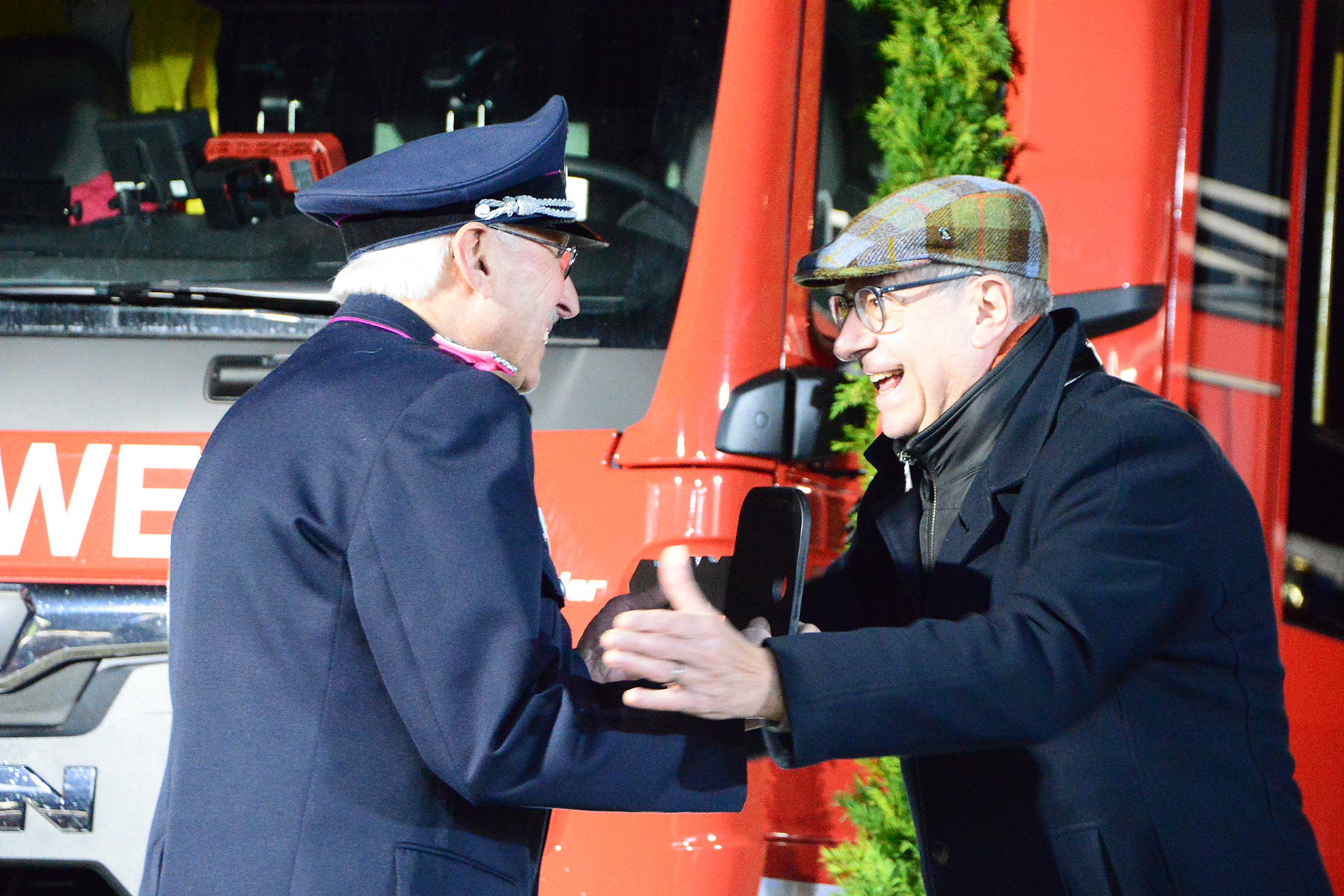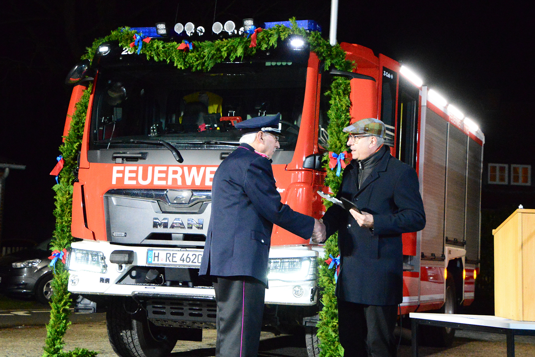 325.000 Euro hat die Stadt Burgdorf für das neue Löschfahrzeug ausgegeben. Burgdorfs Bürgermeister Armin Pollehn betonte, dass auch bei begrenzten städtischen finanziellen Mitteln die Feuerwehren gut ausgestattet werden. Nicht nur die angespannte Finanzlage der Stadt, sondern auch äußere Einflüsse wie unterbrochene Logistikketten und begrenzte Herstellerkapazitäten würden Fahrzeugbeschaffungen für die Feuerwehren schwieriger und teurer machen, so Pollehn, der den symbolischen Schlüssel des Fahrzeugs an Ortsbrandmeister Heinrich Könecke übergab.