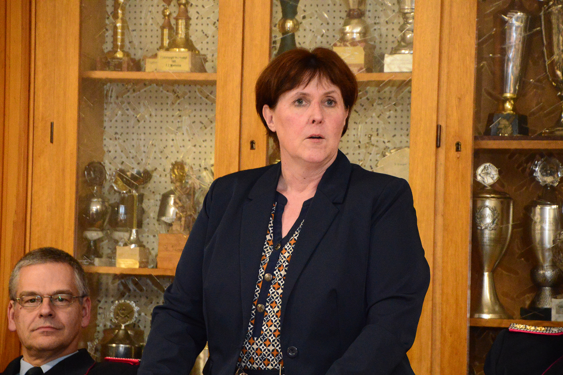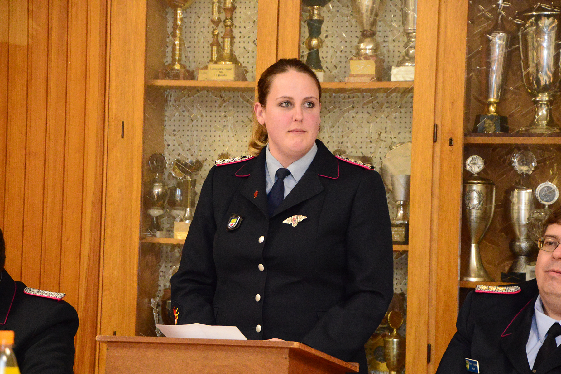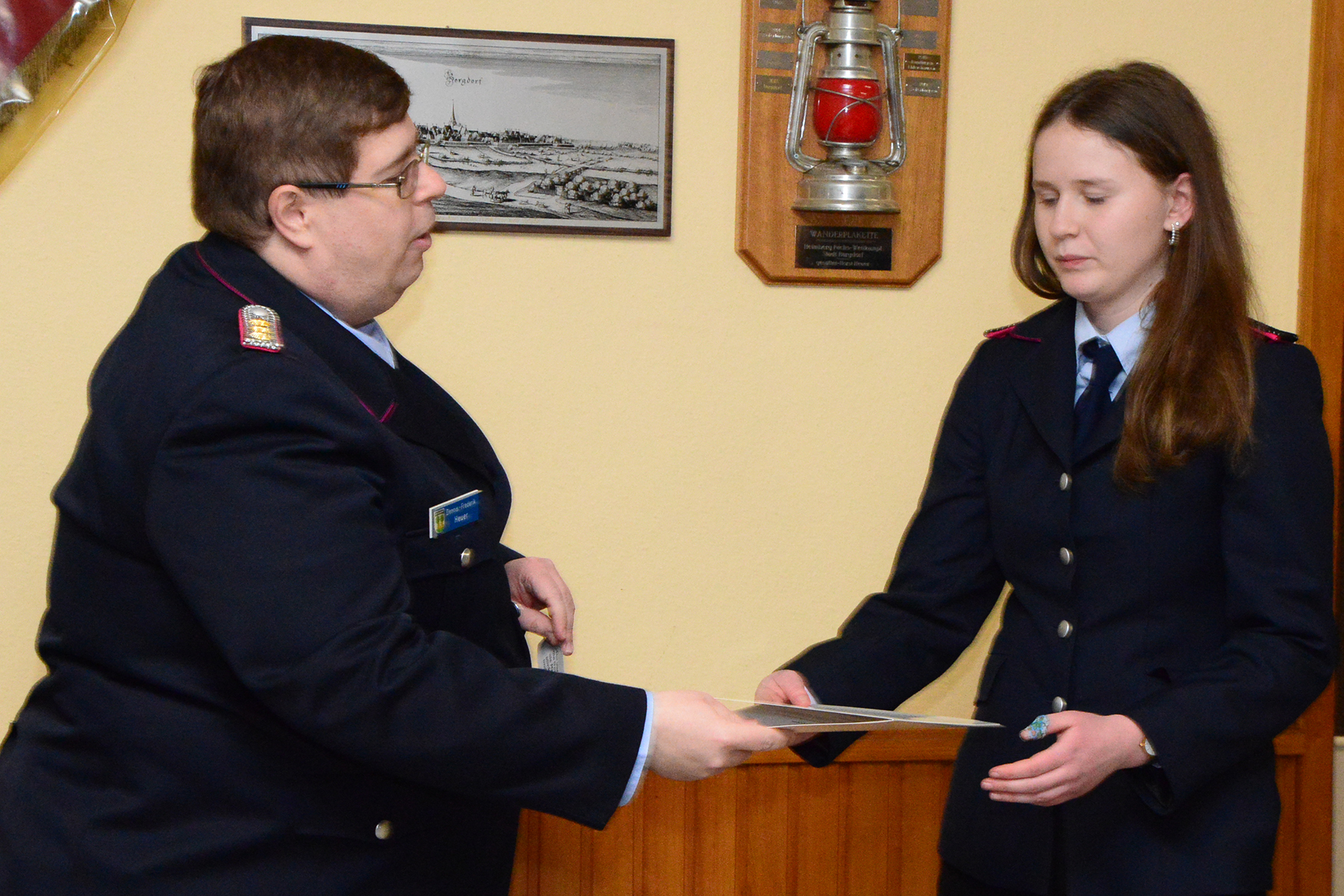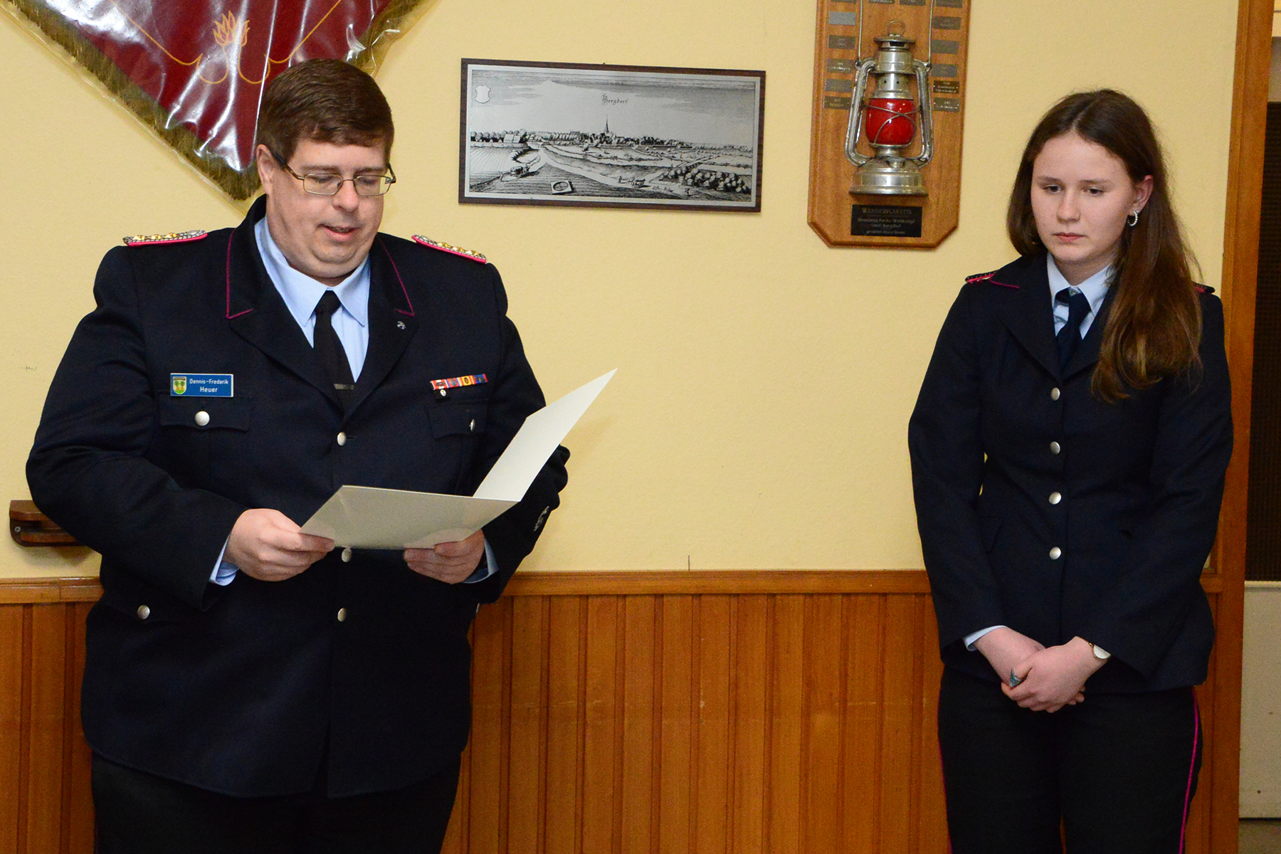 Finja Carlens legte zudem vor der Versammlung ihren Diensteid ab und erhielt ihren ersten Dienstgrad in der Feuerwehr: Sie wurde zur Feuerwehrfrau ernannt.