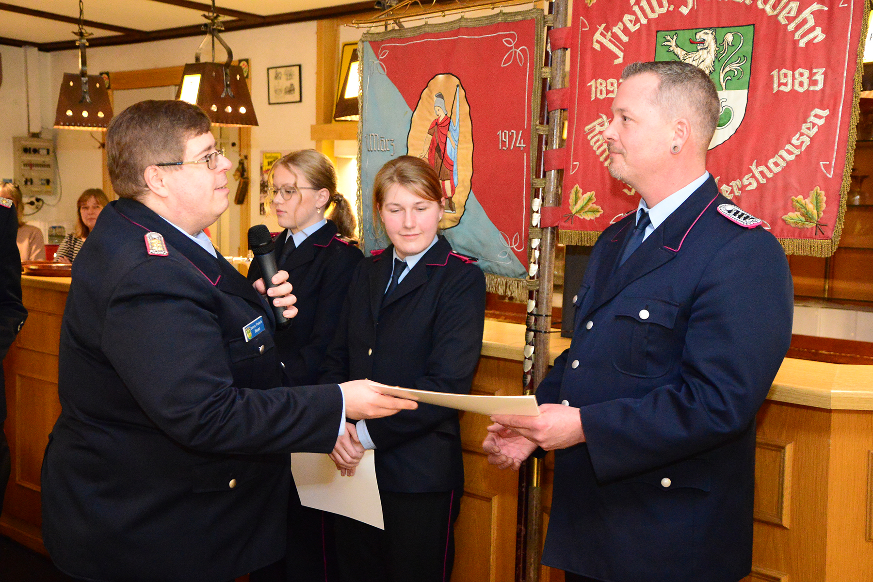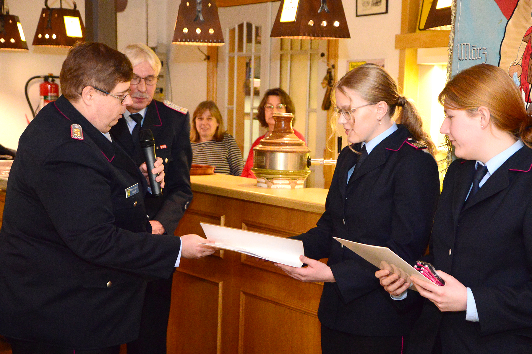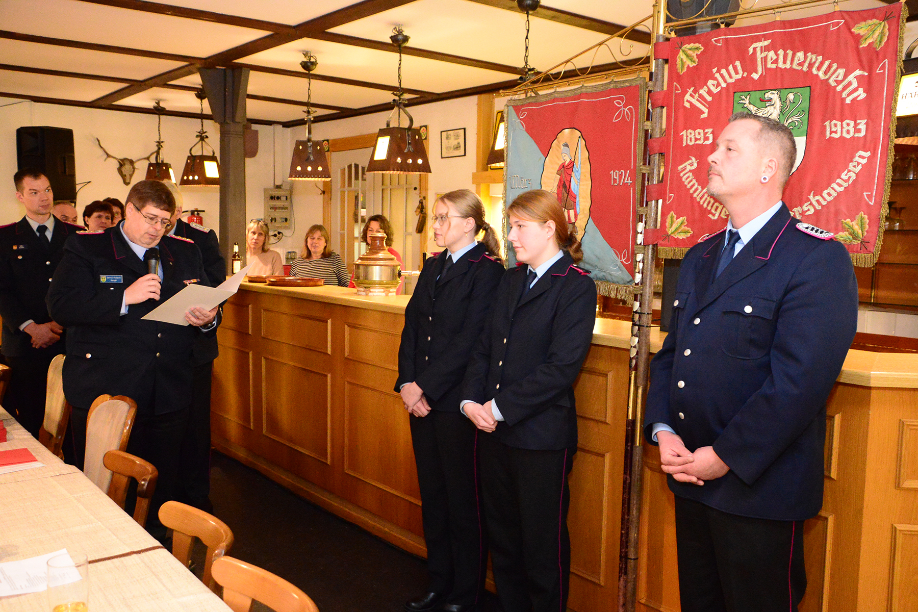 Ihren ersten Dienstgrad in der Feuerwehr erhielten Magdalena Reichmann und Mia Löffler, die nach Bestehen des 1. Teils der Truppmannausbildung den Dienstgrad Feuerwehrfrau erhielten. Zum Oberlöschmeister wurde Marcus Kage ernannt.