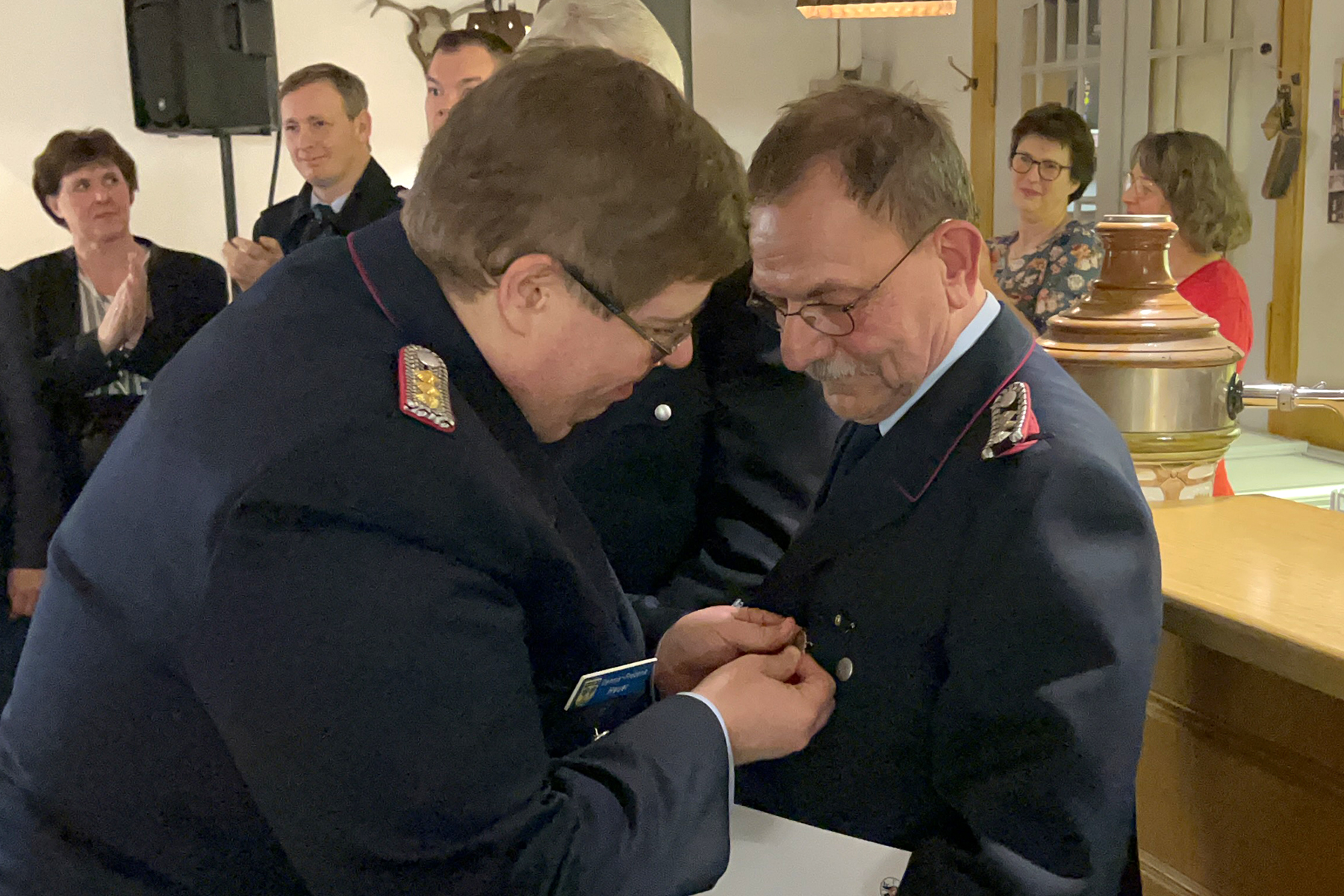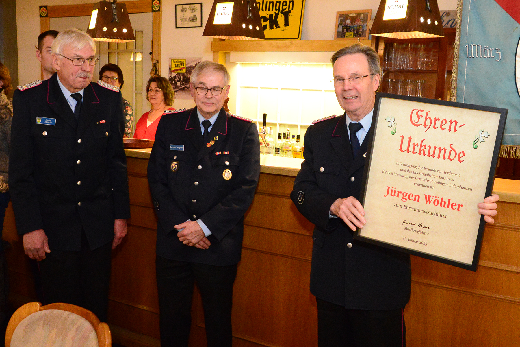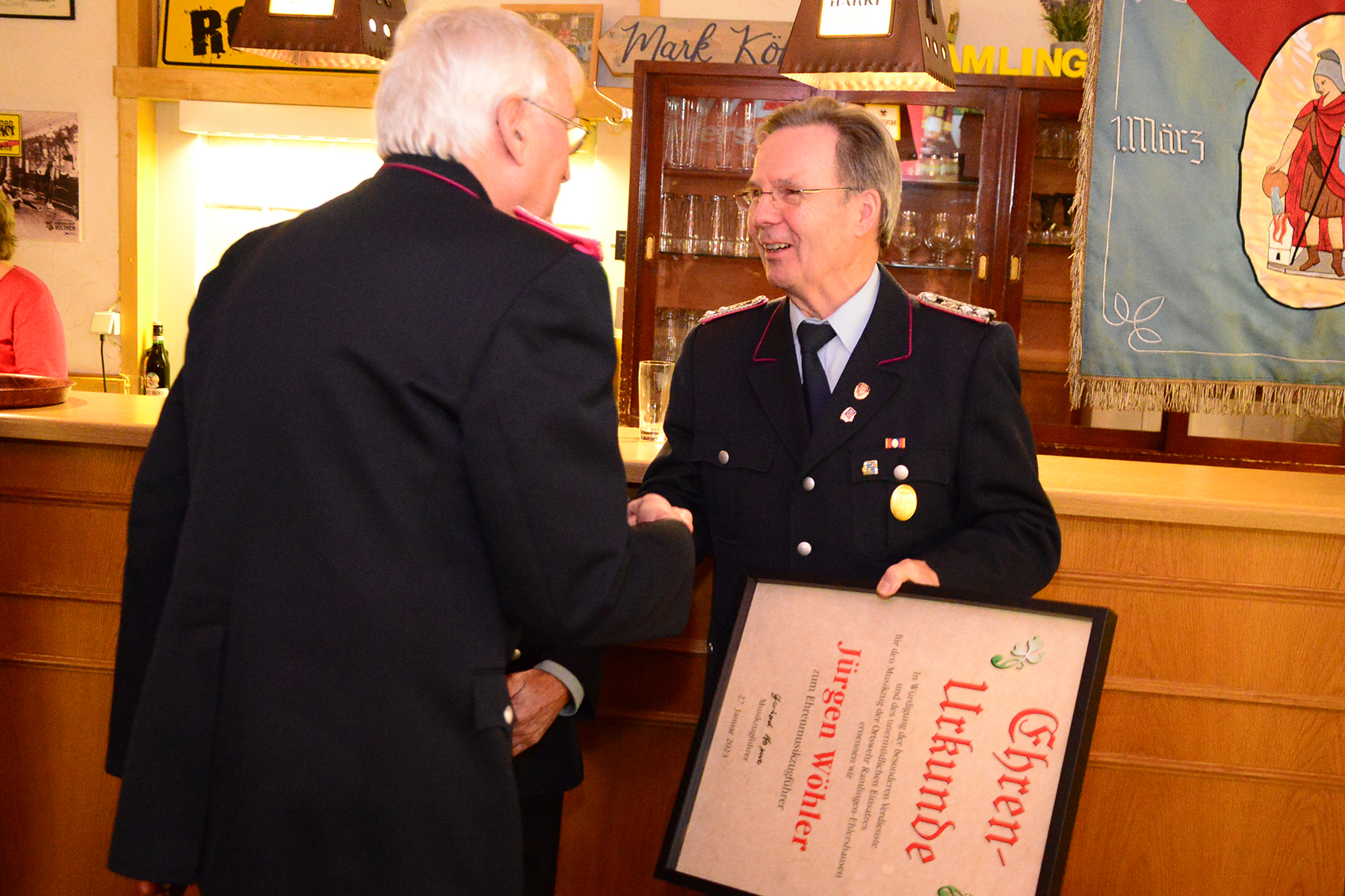 Besondere Ehre wurde zwei Mitgliedern der Ortsfeuerwehr zuteil: Die silberne Ehrennadel des Landesfeuerwehrverbandes Niedersachsen erhielt Bernd Lüdke. Zudem wurde der ehemalige Musikzugführer Jürgen Wöhler zum Ehrenmusikzugführer ernannt.