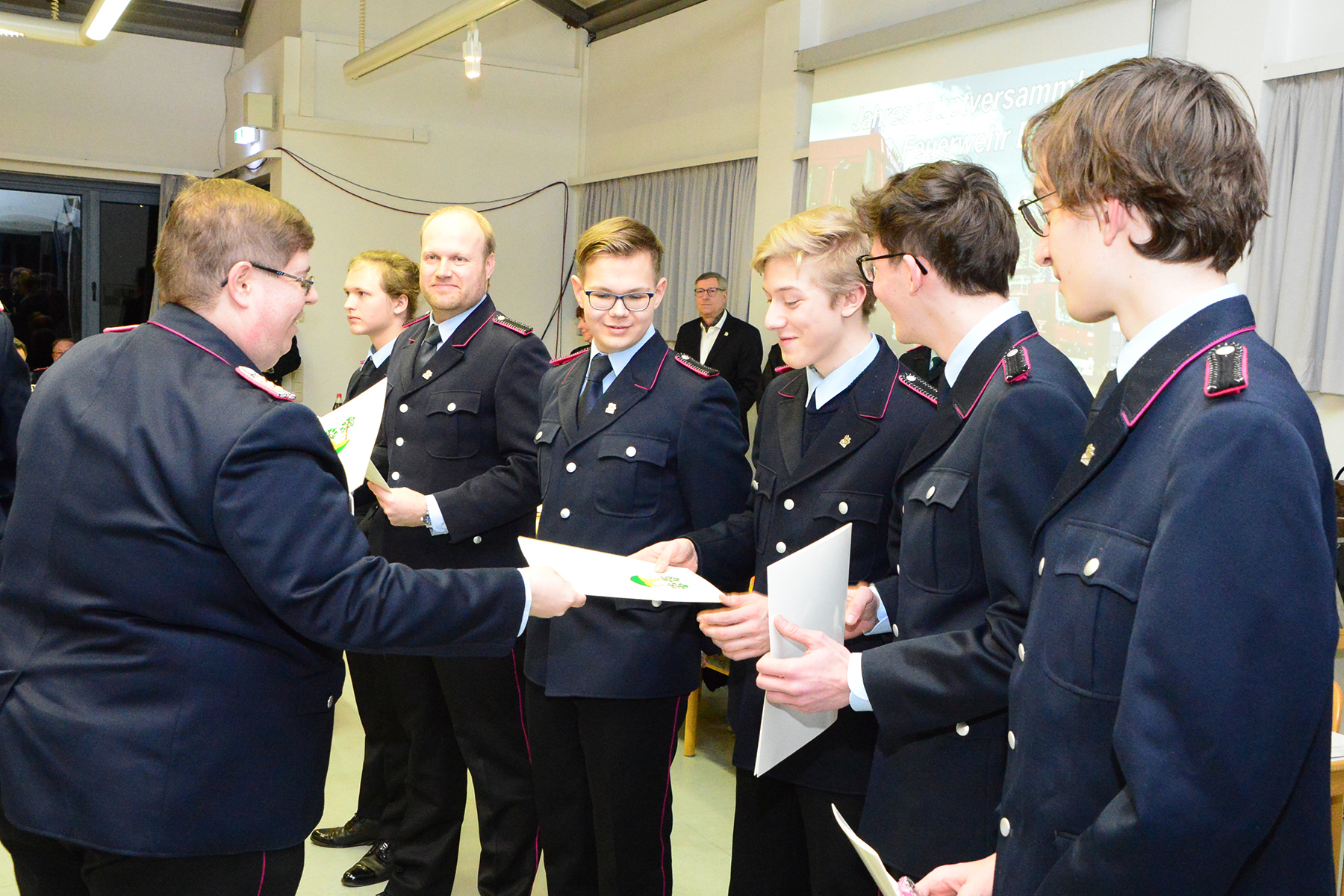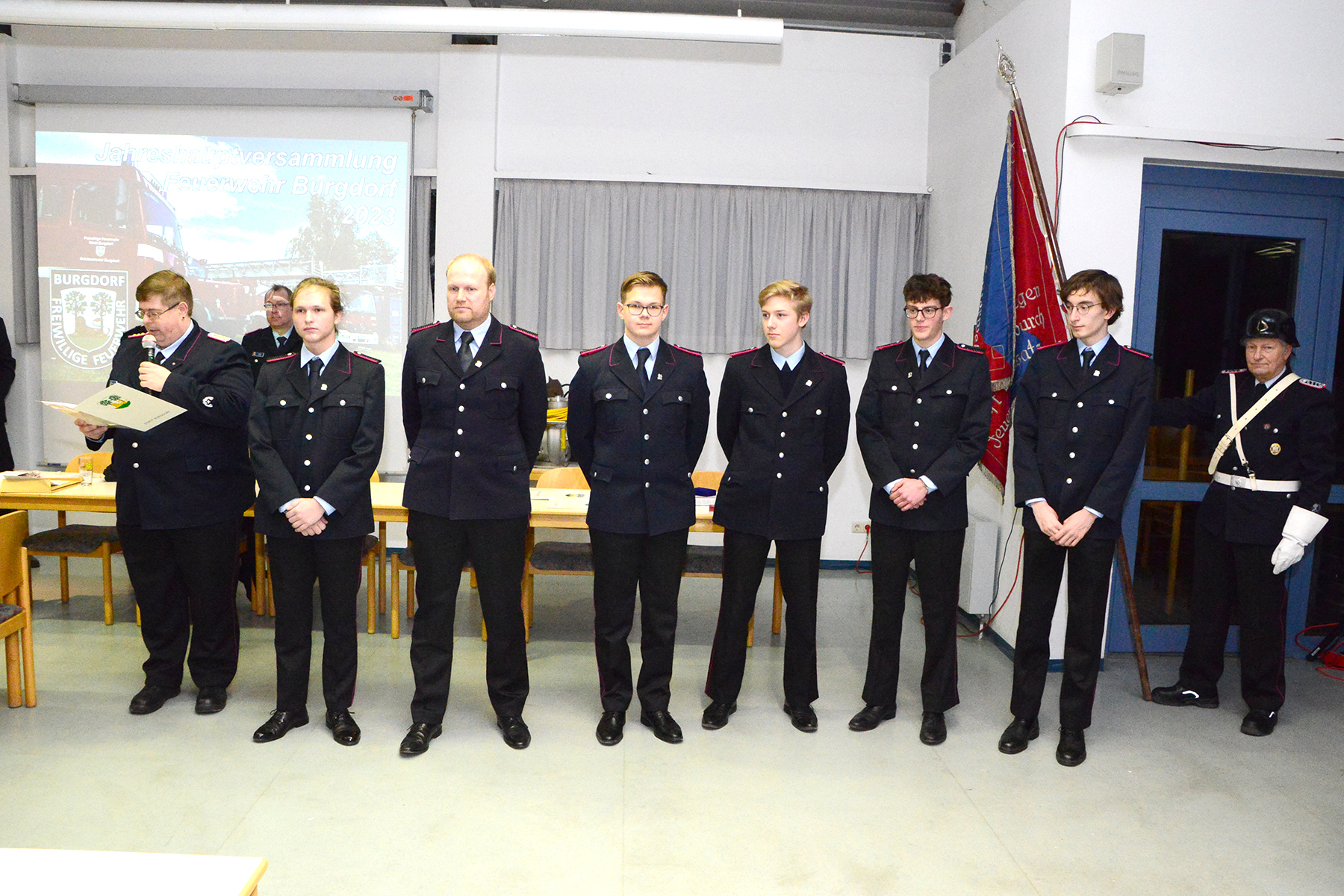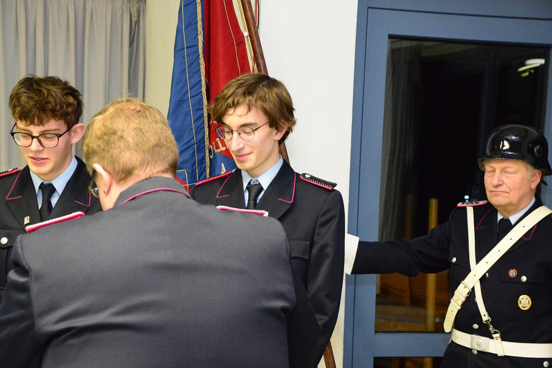 Nach Abschluss des 1. Teils der Grundausbildung konnten sechs neue Feuerwehrmänner verpflichtet werden, die auf der Standarte der Ortsfeuerwehr ihren Diensteid ablegten: Finn-Luca Bähre, Henri Bode, Simon Böhm, Christian Bronnert, Justus Sparacio und Sebastian von Görtz wurde sodann der Dienstgrad Feuerwehrmann verliehen.