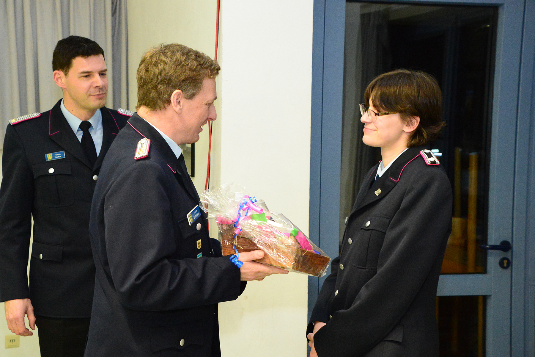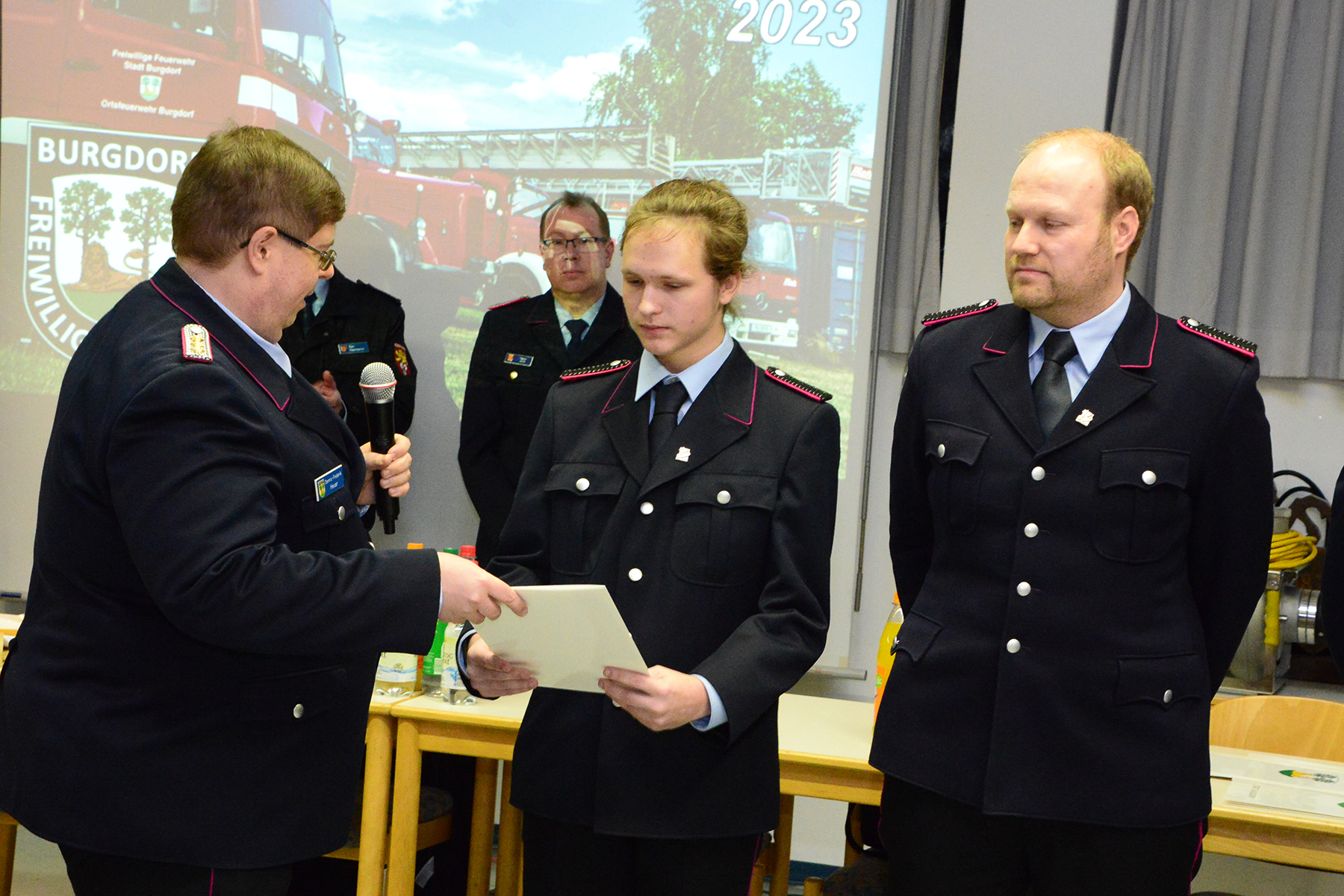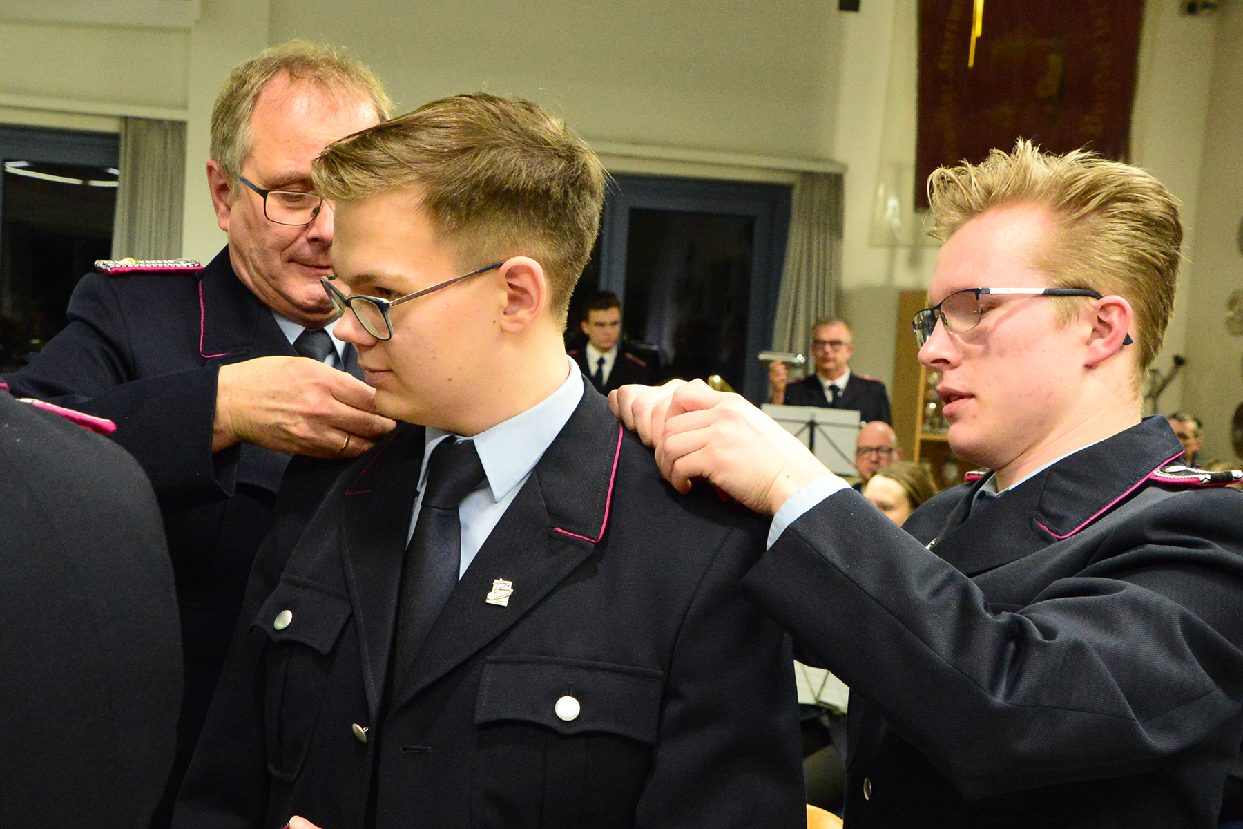 Nach Abschluss des 1. Teils der Grundausbildung konnten sechs neue Feuerwehrmänner verpflichtet werden, die auf der Standarte der Ortsfeuerwehr ihren Diensteid ablegten: Finn-Luca Bähre, Henri Bode, Simon Böhm, Christian Bronnert, Justus Sparacio und Sebastian von Görtz wurde sodann der Dienstgrad Feuerwehrmann verliehen.