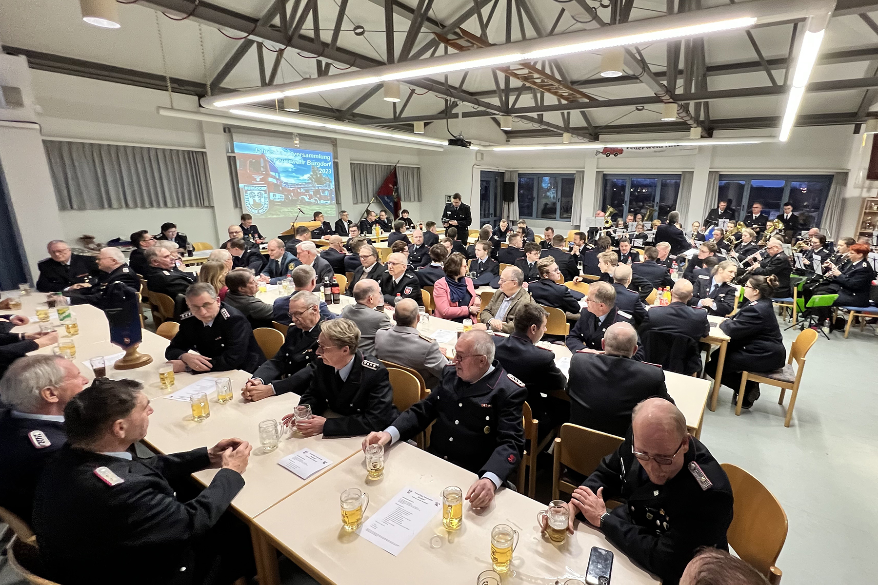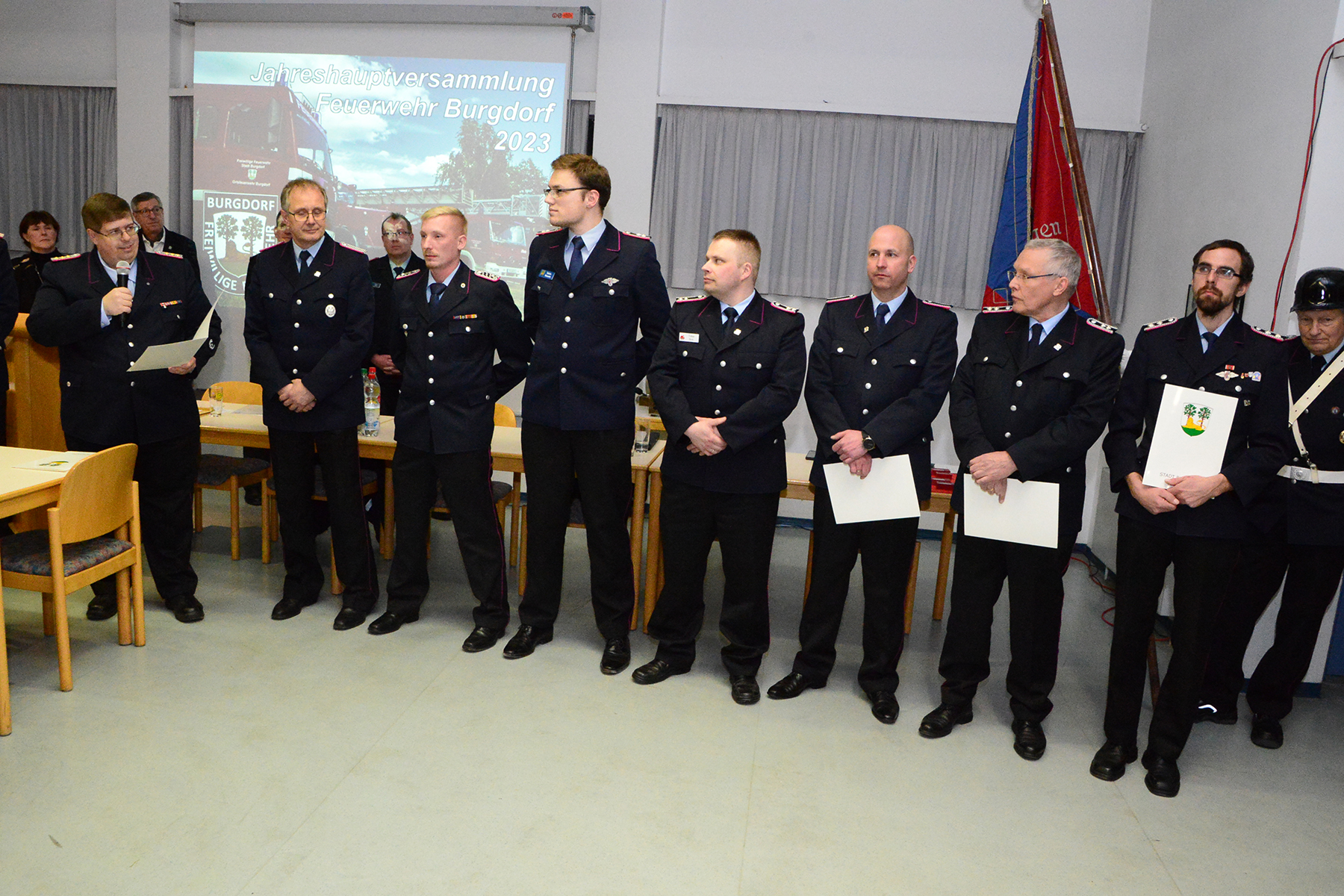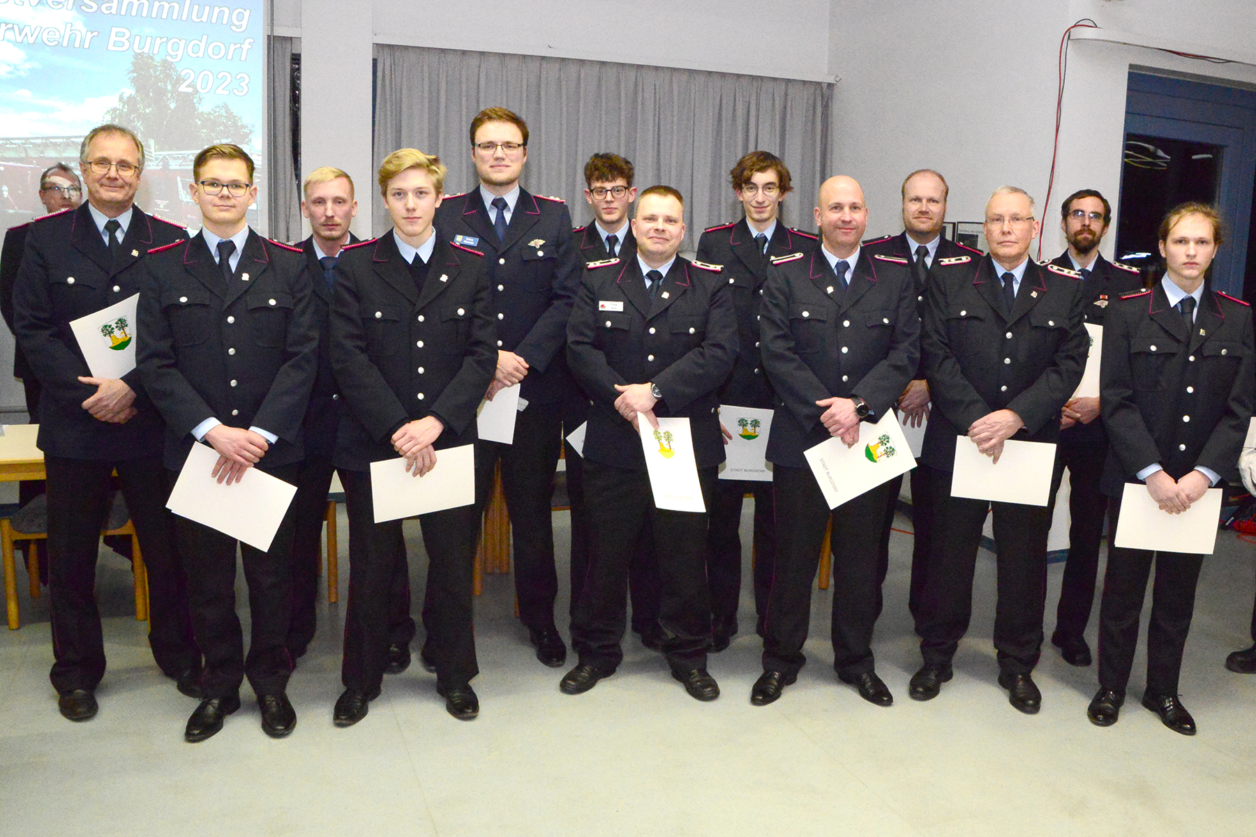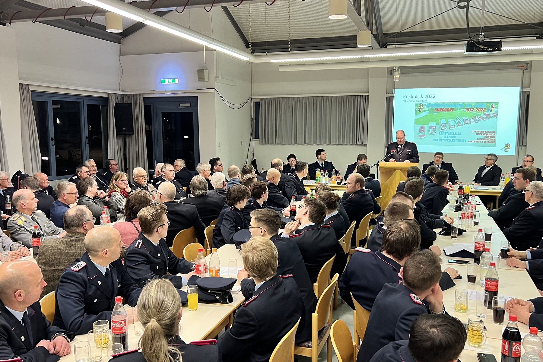 Rund 90 Gäste konnte Ortsbrandmeister Florian Bethmann zur Jahreshauptversammlung im Feuerwehrhaus in der Straße Vor dem Celler Tor begrüßen. Darunter Burgdorfs Bürgermeister Armin Pollehn, die Feuerwehrausschussvorsitzende Beate Neitzel, Mitglieder des Stadtrates, den Brandschutzabschnittsleiter Tobias Jacob und sein Stellvertreter Tim Herrmann, Stadtbrandmeister Dennis-Frederik Heuer sowie Vertreter von Polizei, DRK und THW.