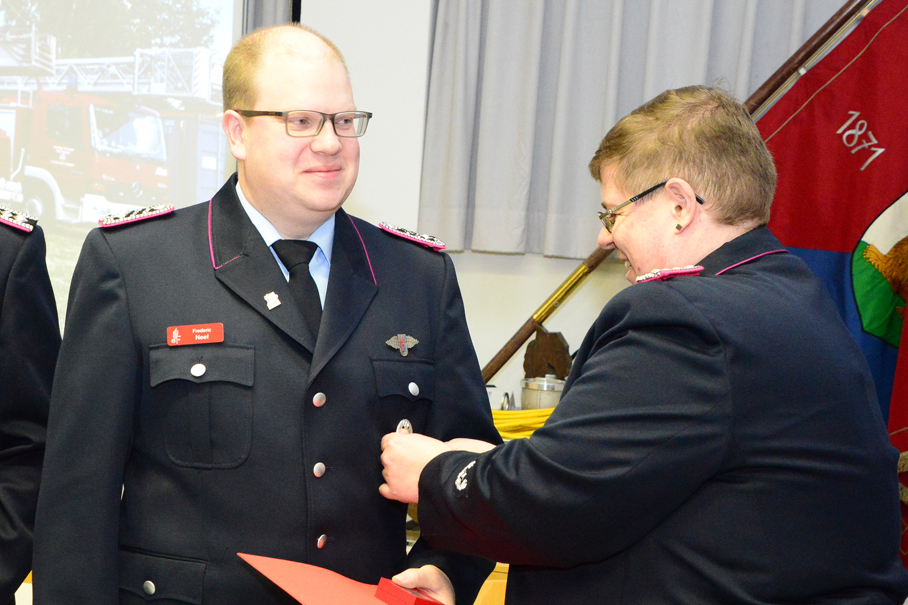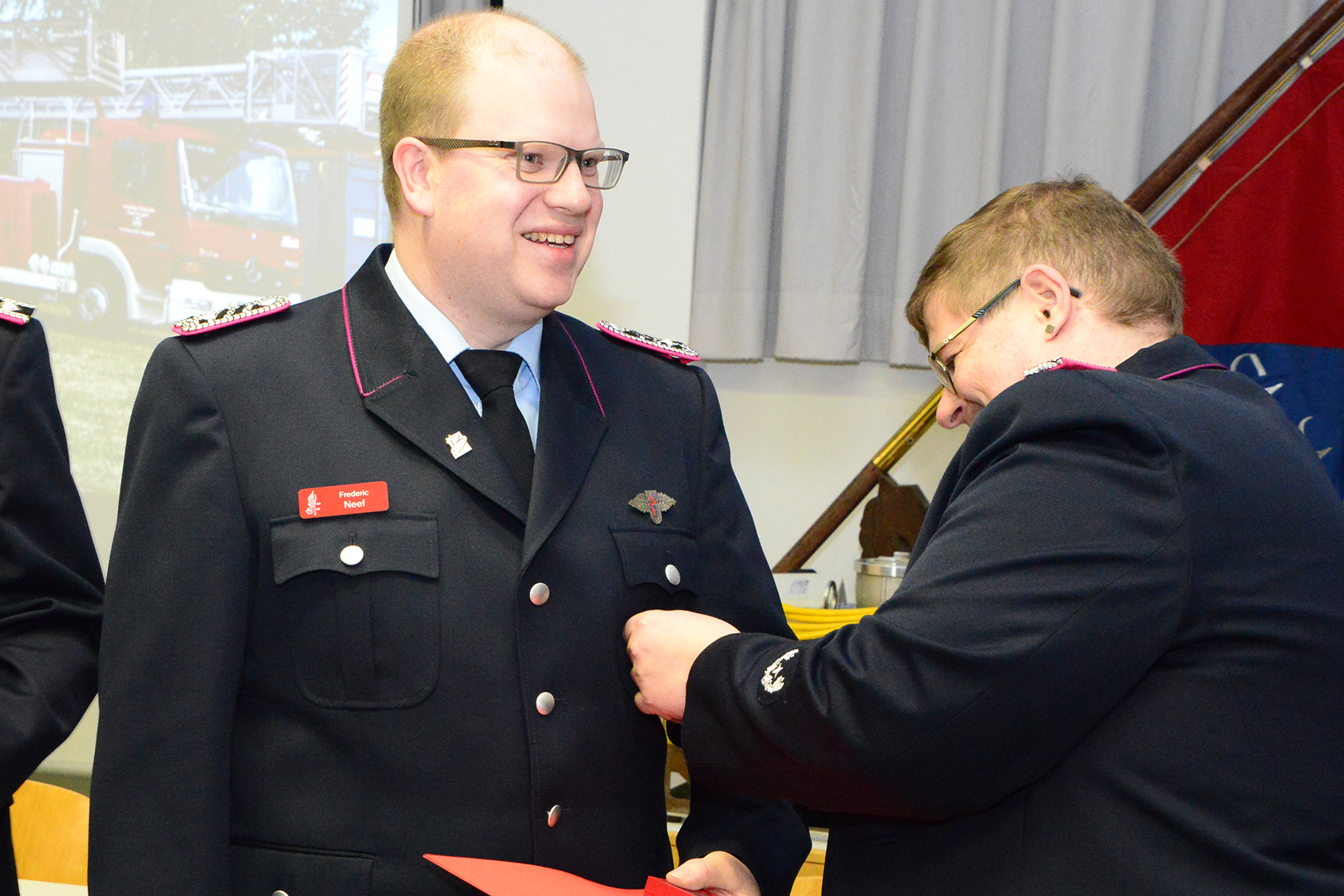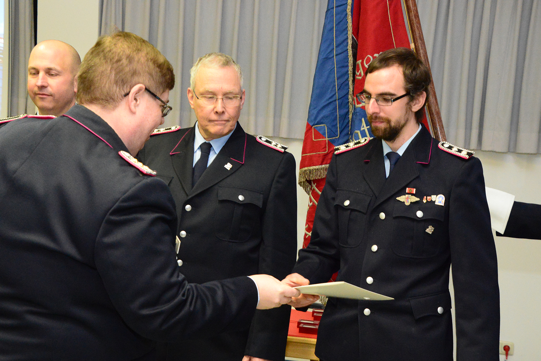 Aufgrund erfolgreich absolvierter Lehrgänge und erforderlicher Dienstzeit konnten auch wieder neue Dienstgrade verliehen werden. Zum Oberfeuerwehrmann wurde Björn Knoche ernannt. Den Dienstgrad 1. Hauptfeuerwehrmann erhielten Marcel Drietchen und Florian Schäfer. Löschmeister dürfen sich nun Tobias Wessels und Tobias Heck nennen. Den Rang eines Hauptlöschmeisters bekleidet nun Tim Nadarzy und zum Oberbrandmeister wurde Klaus Wickboldt ernannt.