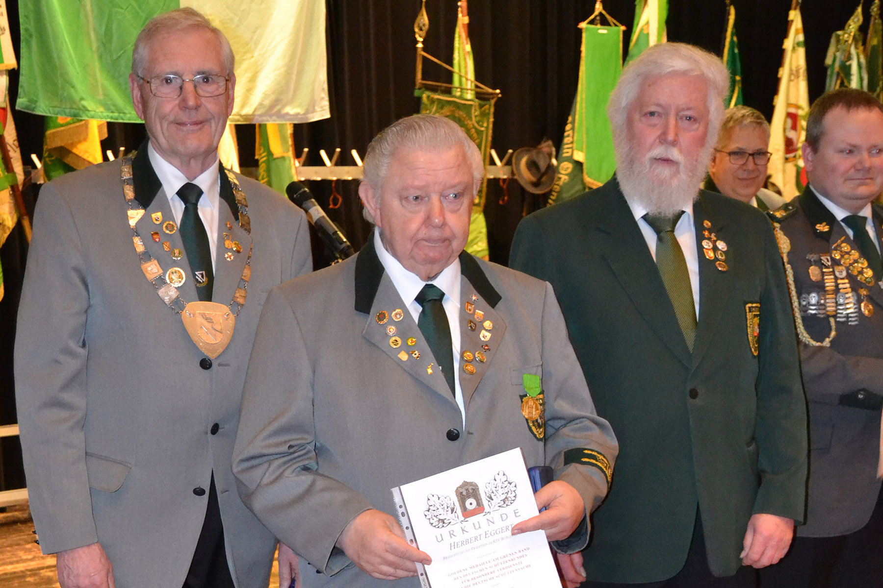Dann wurde es still in der Aula und Werner Bösche las eine Urkunde vor: "Goldene Medaille am Grünen Band des Deutschen Schützenbundes für besondere Verdienste um die Deutsche Schützensache“. Völlig überrascht wurde Herbert Eggert, 1. Vizepräsident des KSV Burgdorf, mit dieser Auszeichnung von Werner Bösche. Sein unermüdlicher ständiger Einsatz für das Schützenwesen wurde würdevoll anerkannt und mit stehendem Applaus belohnt.