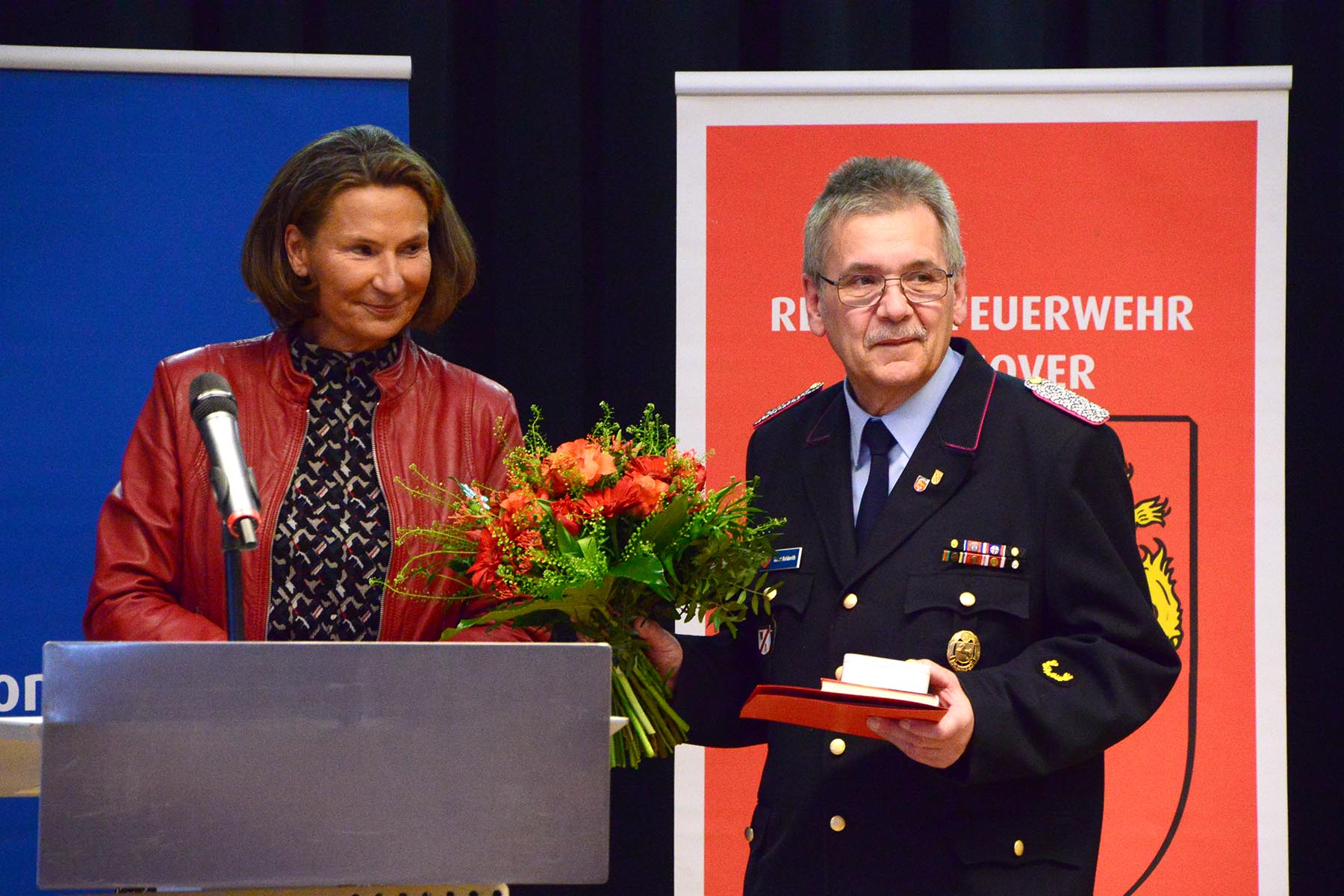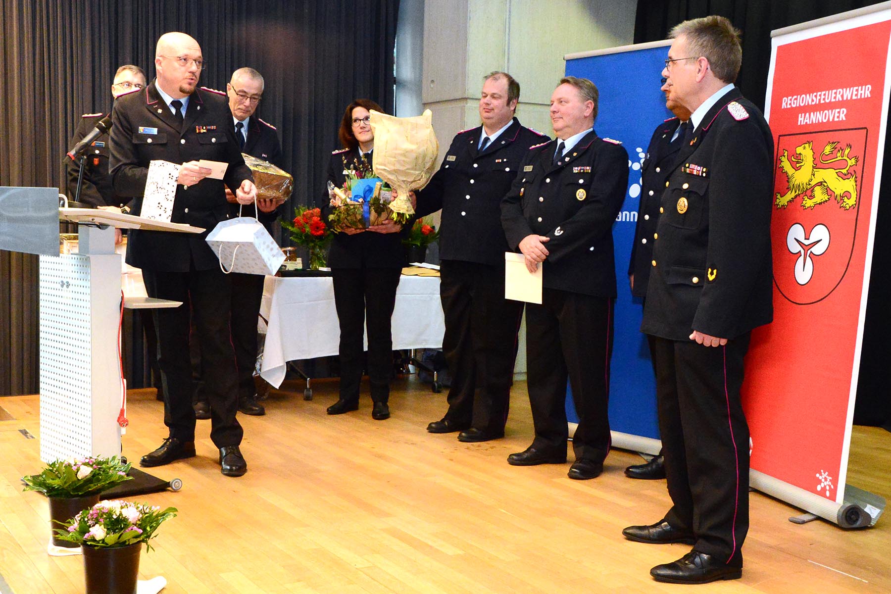 Er habe sich nie als Abschnittsleiter bei Einsätzen in den Vordergrund gestellt, betonte Horst Holderith. Vielmehr "habe ich mich immer als Kamerad gesehen und habe nie eingreifen müssen", erklärte er. Er dankte auch den Mitarbeitern der Region Hannover. Man sei zwar nicht immer einer Meinung gewesen, doch am Ende sei es immer zu einem guten Ergebnis gekommen. Er dankte auch den jetzige wie auch vergangenen Stadt- und Gemeindebrandmeistern "für das, was wir in den vergangenen Jahren geschaffen haben". Besonders dankte er seiner Familie während seiner 51-jährigen ehrenmatlichen Tätigkeit in der Feuerwehr wie der die 12-jährigen Tätigkeit als Abschnittsleiter. "Ohne die große Unterstützung wäre das nicht machbar gewesen", so Horst Holderith vor allem in Richtung seiner Frau Cornelia. Sie erhielt aus den Händen des stellvertretenden Regionsbrandmeisters Eberhard Schmidt einen Blumenstrauß. Wichtig seien die vier "F", wie Regionsbrandmeister Karl-Heinz Mensing betonte: Familie, Firma, Freunde und Feuerwehr. "Wenn das nicht in Einklang steht, haben wir ein Problem", so der Regionsbrandmeister.