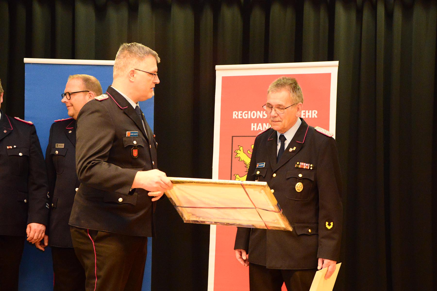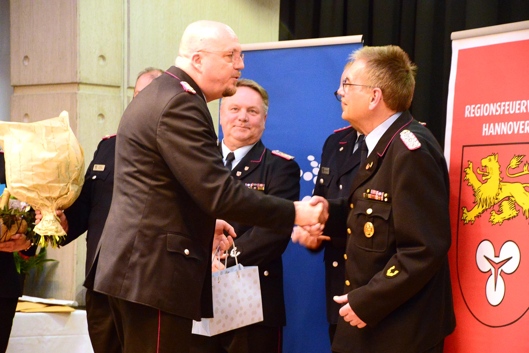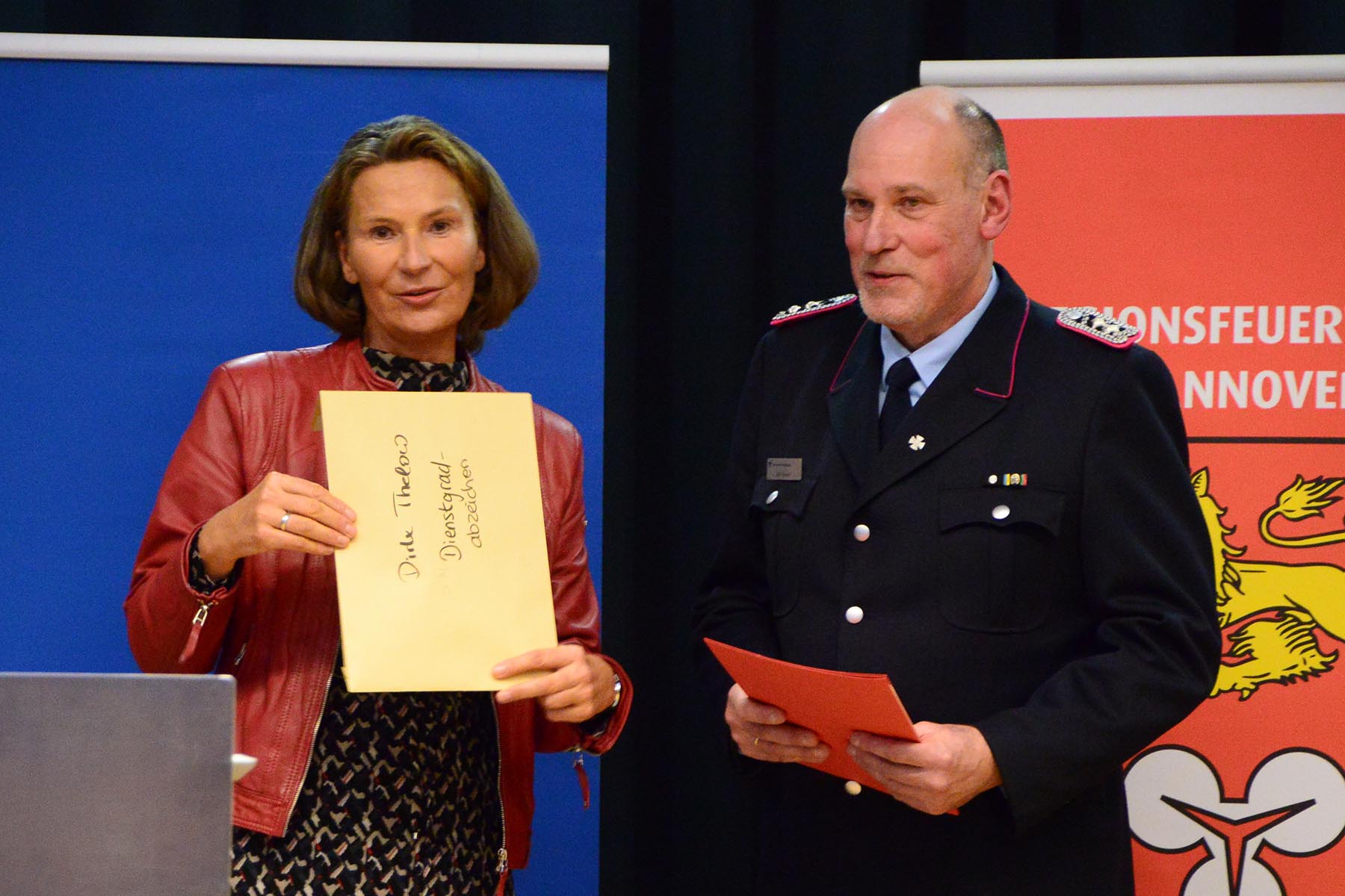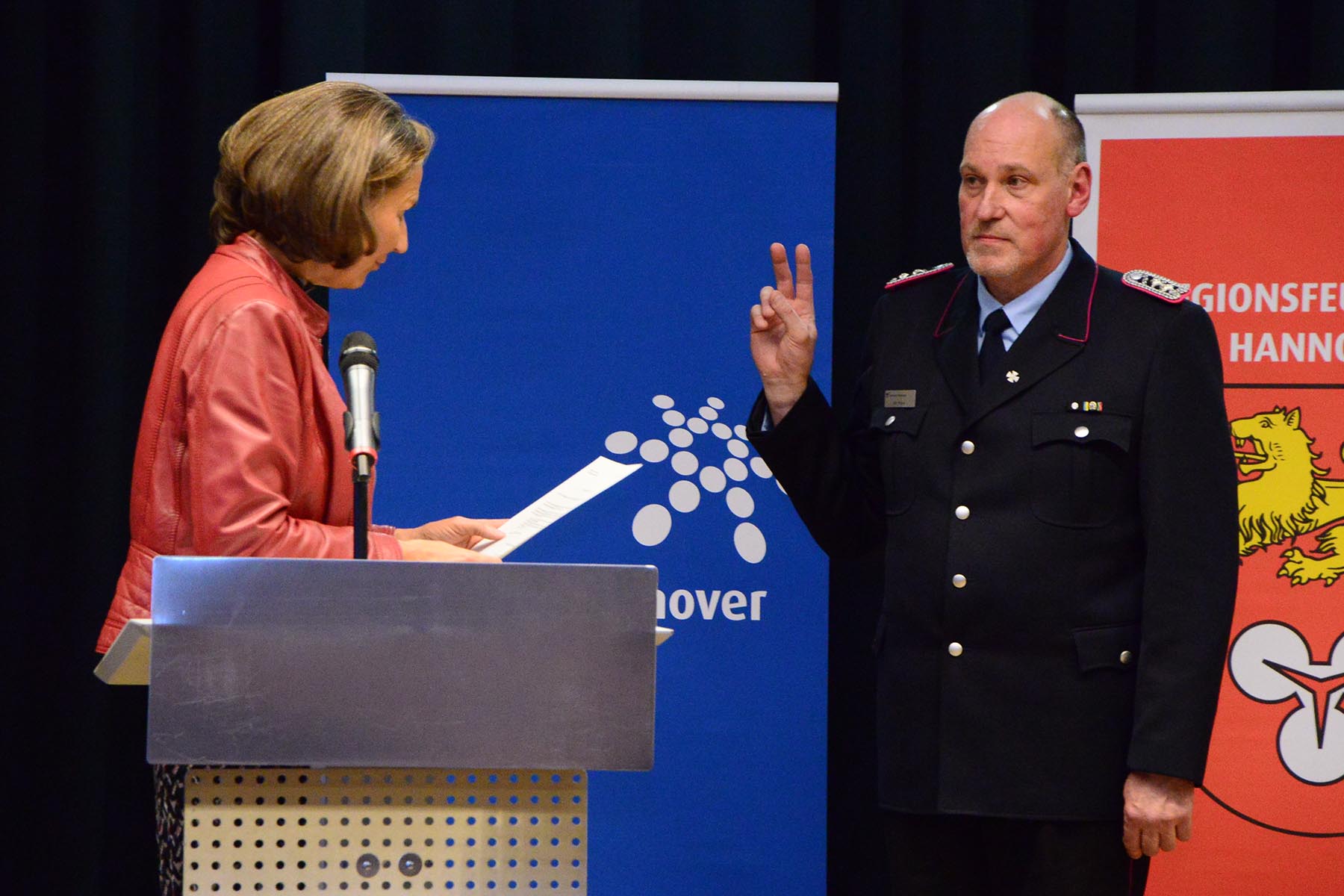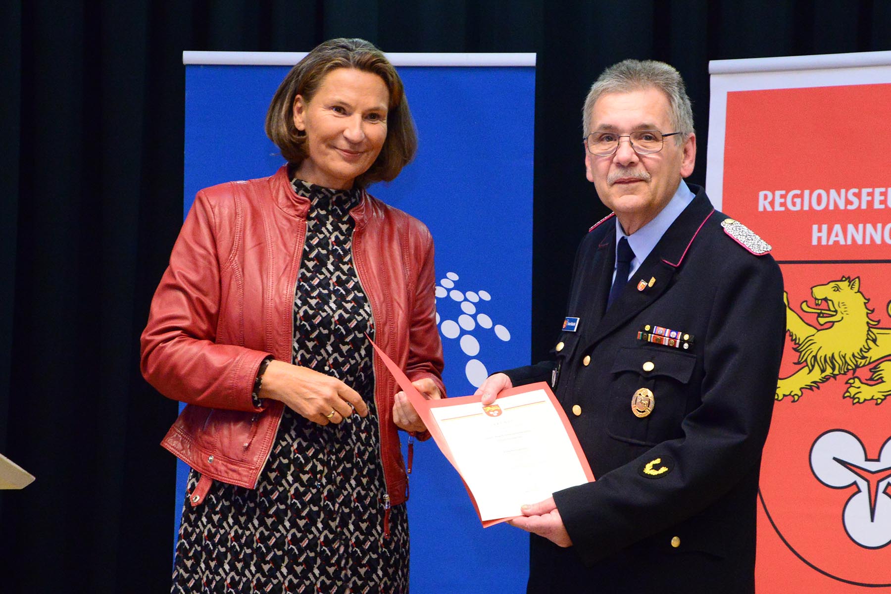 Nach dem Abschied des Amtsinhabers überreichte sie im Namen des Regionspräsidenten die Ernennungs- und Beförderungsurkunde an seinen Nachfolger. Volker Kluth, bereits seit sechs Jahren stellvertretender Abschnittsleiter, wird am 1. April das Amt des Abschnittsleiters übernehmen und erhielt seine Ernennungsurkunde sowie die Beförderungsurkunde zum Abschnittsbrandmeister. Ebenfalls ab 1. April steht ihm Dirk Thelow, Mitglied der Ortsfeuerwehr Gailhof (Gemeinde Wedemark), als Stellvertreter zur Seite. Dirk Thelow legte seinen Amtseid ab und erhielt zudem seine Urkunde zum Vollzugsbeamten. Beide sind für sechs Jahres ins Amt gewählt.