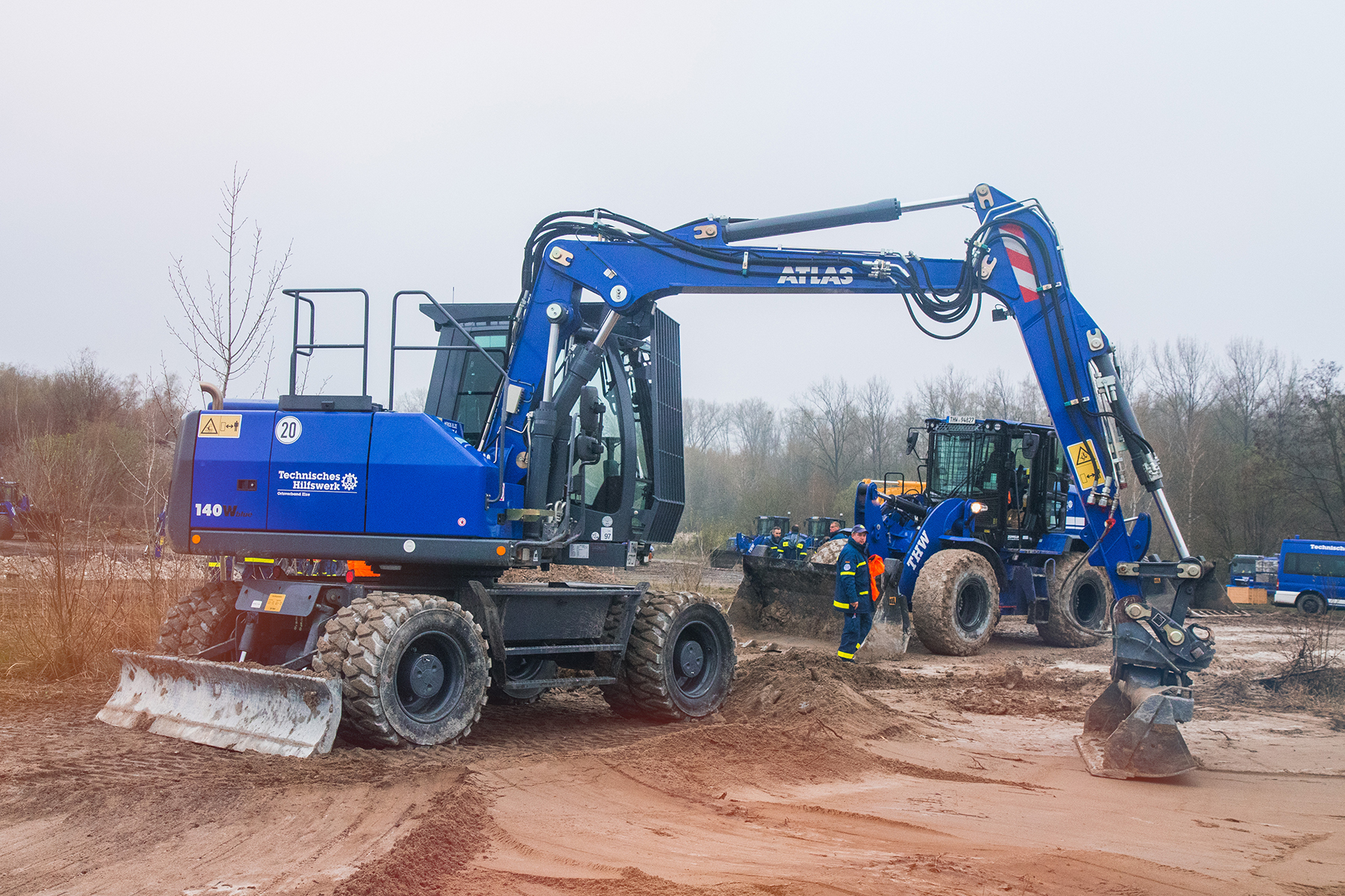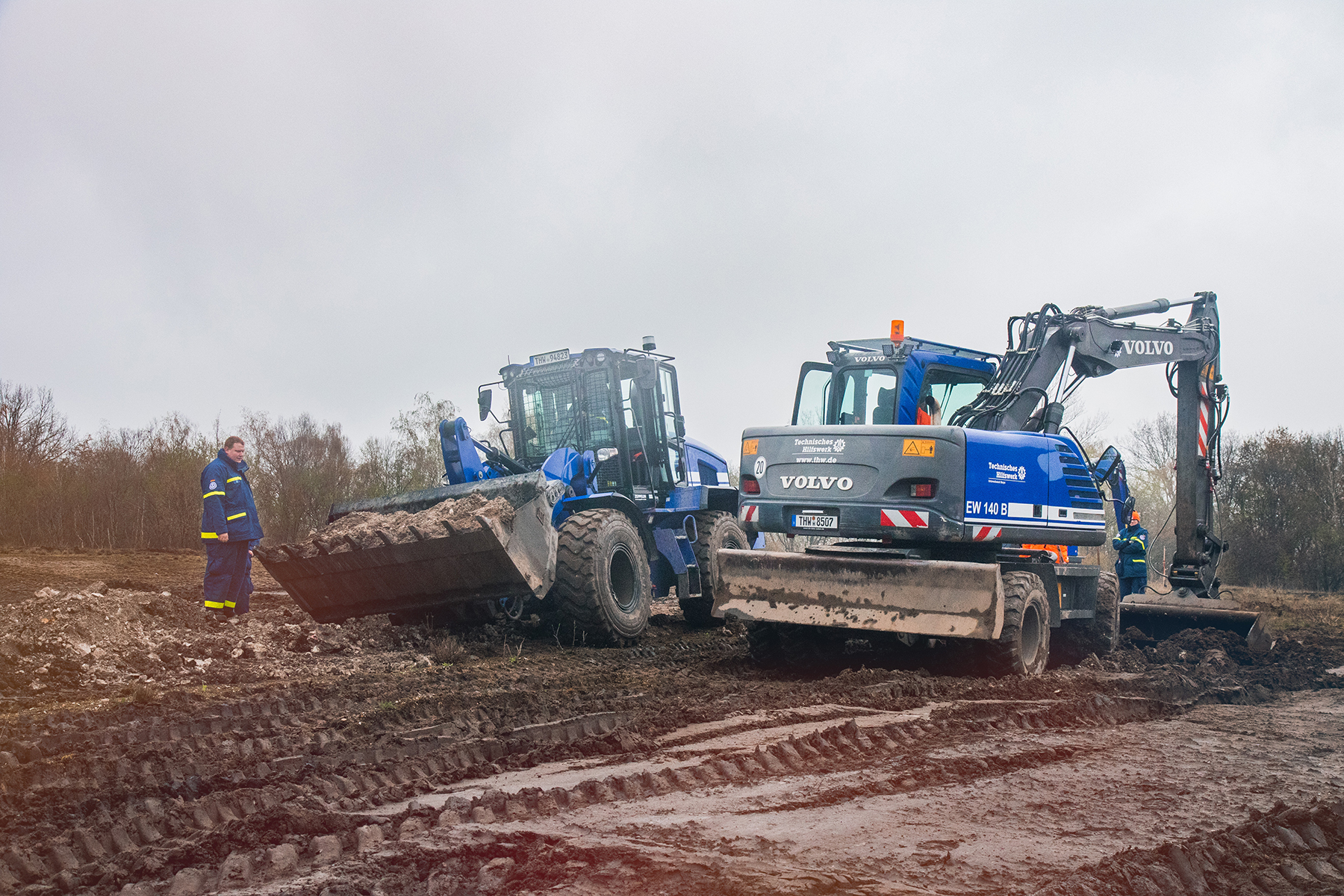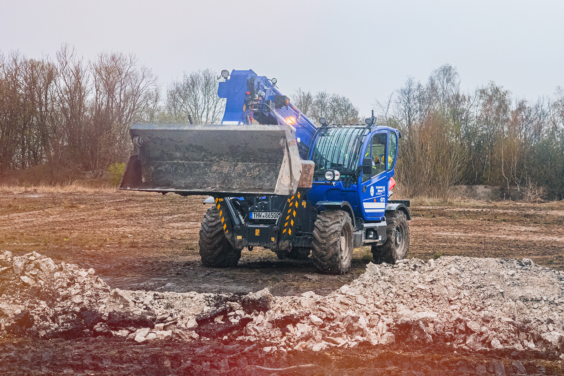 Die ehrenamtlichen Helferinnen und Helfer trafen sich auf zwei Arealen der Unternehmen Holcim und Papenburg, die ihre Firmengelände für den guten Zweck zur Verfügung stellten. Je fünf Radlader und Bagger, vier Telelader und eine Planierraupe hatten die beteiligten Ortsverbände teils von weither mitgebracht. Mit den Baumaschinen schoben die Fahrerinnen und Fahrer Material beiseite und planierten anschließend einen Behelfsweg. Neue Zuwegungen zu schaffen ist nach Explosionen wichtig, aber auch, wenn Wassermassen Straßen unterspült und fortgerissen haben.