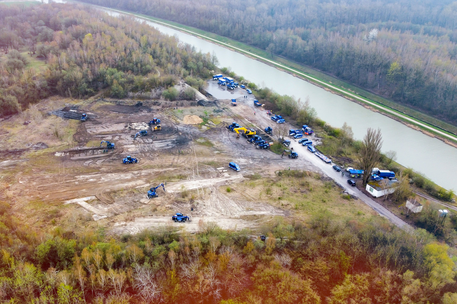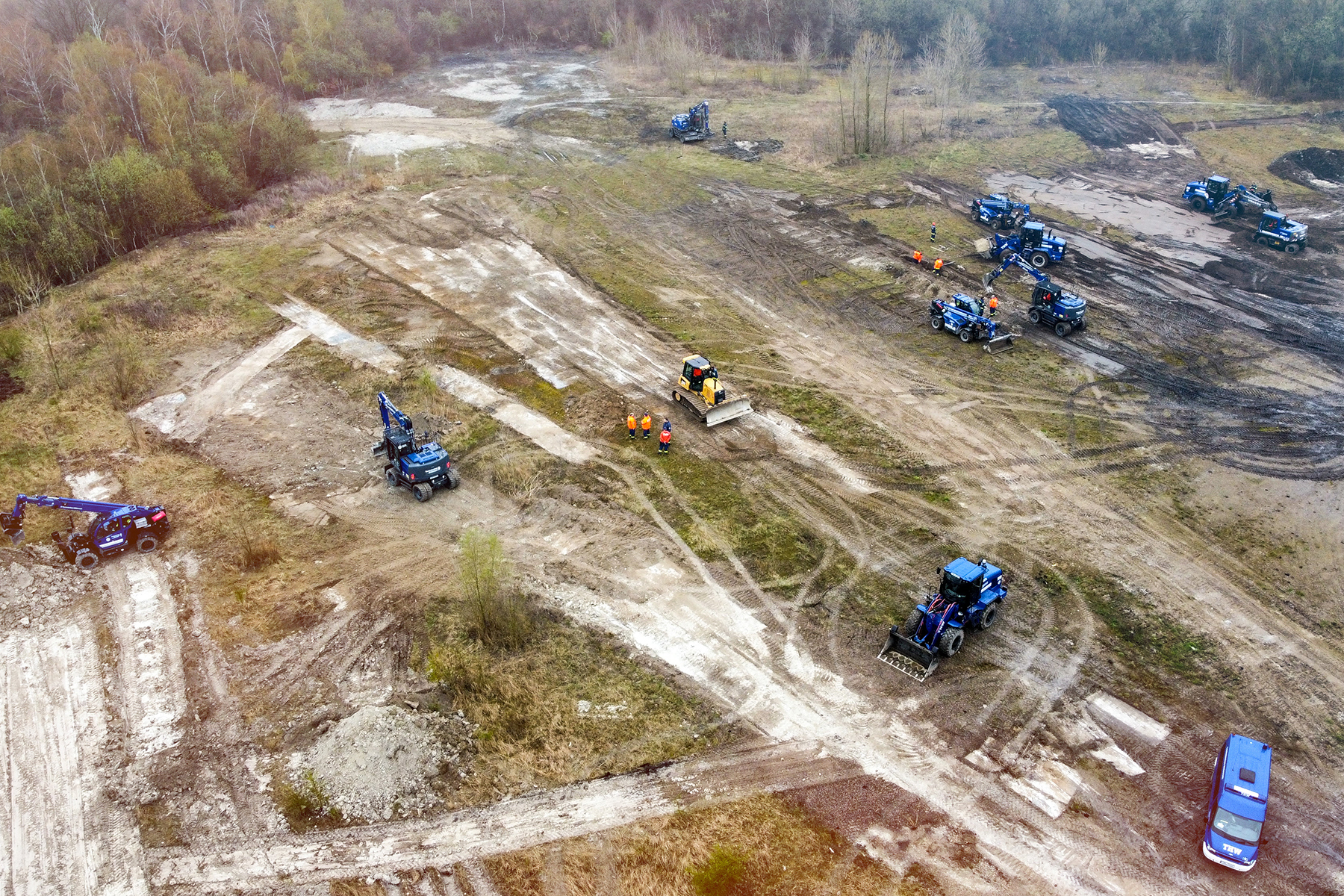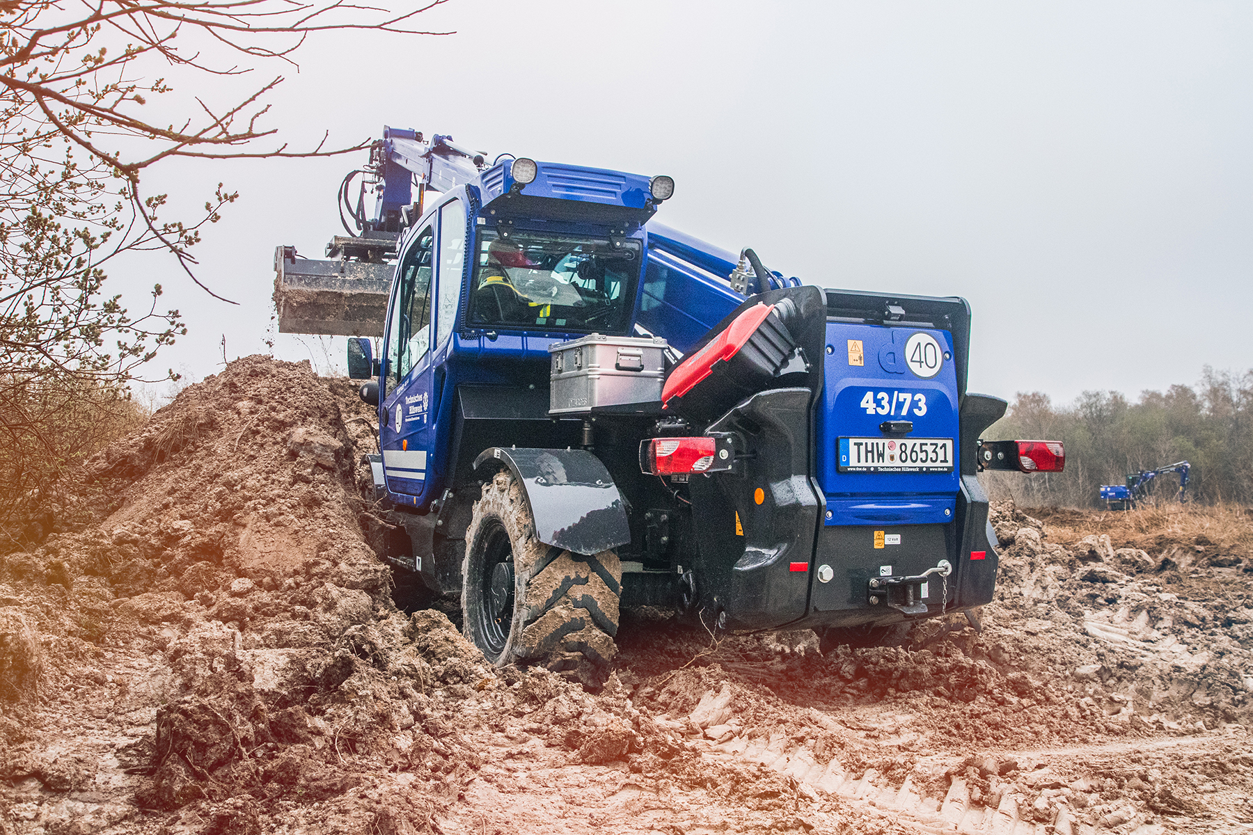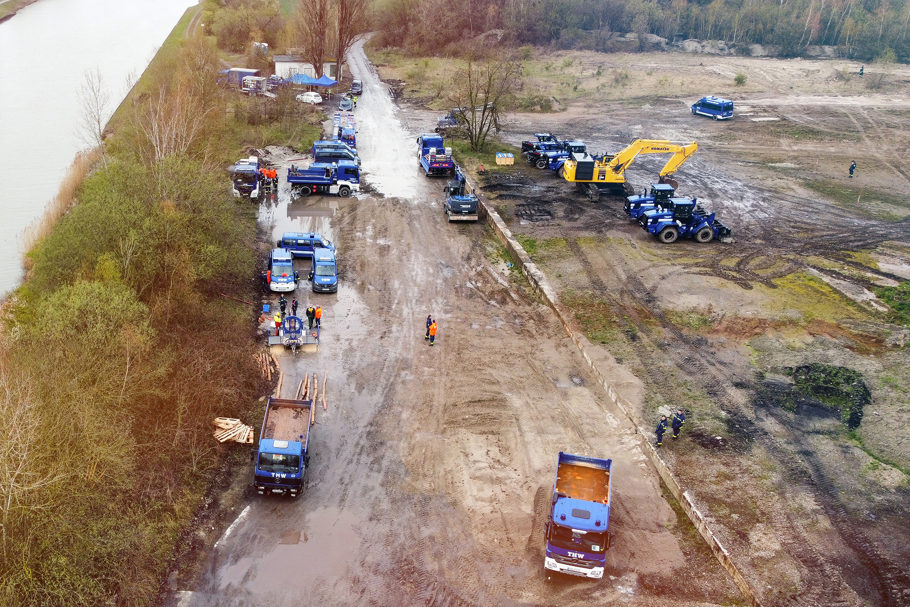 Die ehrenamtlichen Helferinnen und Helfer trafen sich auf zwei Arealen der Unternehmen Holcim und Papenburg, die ihre Firmengelände für den guten Zweck zur Verfügung stellten. Je fünf Radlader und Bagger, vier Telelader und eine Planierraupe hatten die beteiligten Ortsverbände teils von weither mitgebracht. Mit den Baumaschinen schoben die Fahrerinnen und Fahrer Material beiseite und planierten anschließend einen Behelfsweg. Neue Zuwegungen zu schaffen ist nach Explosionen wichtig, aber auch, wenn Wassermassen Straßen unterspült und fortgerissen haben.
