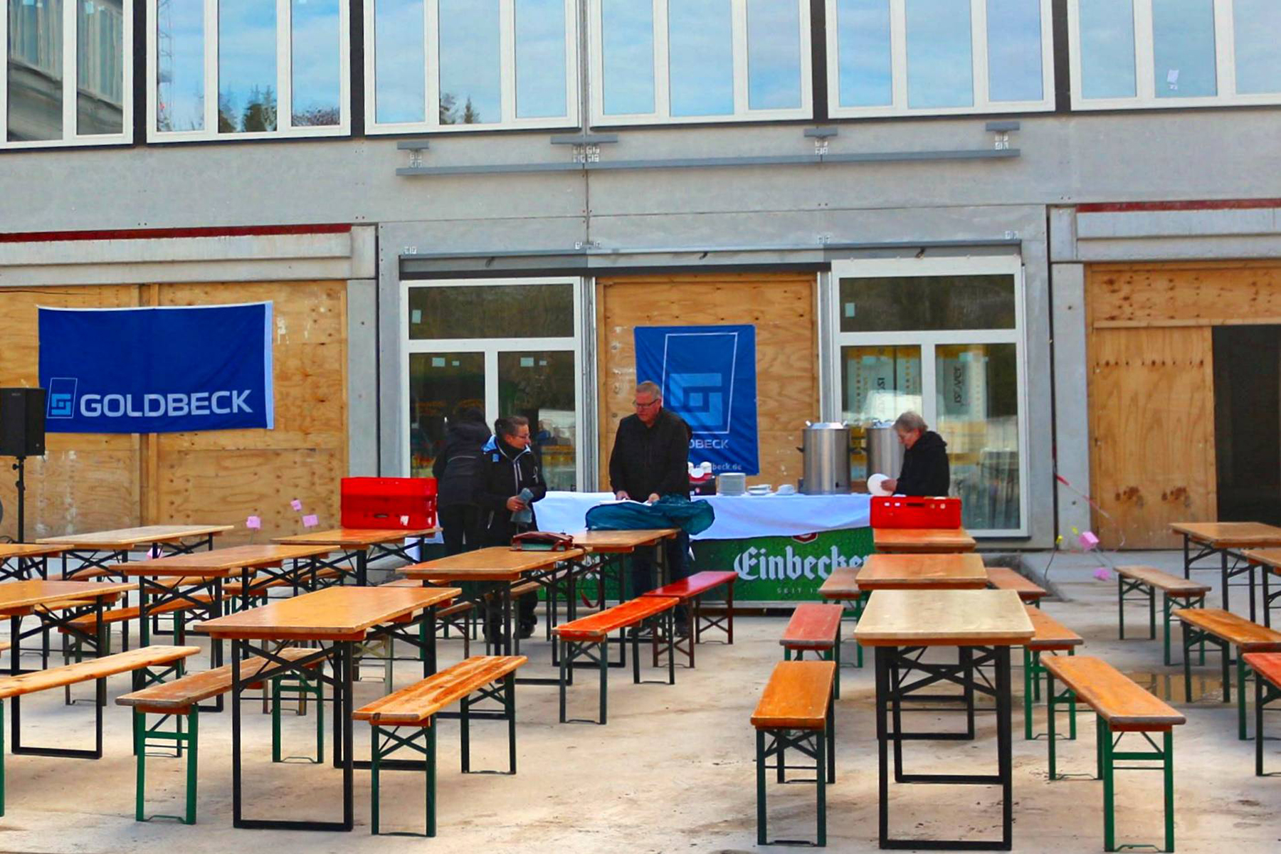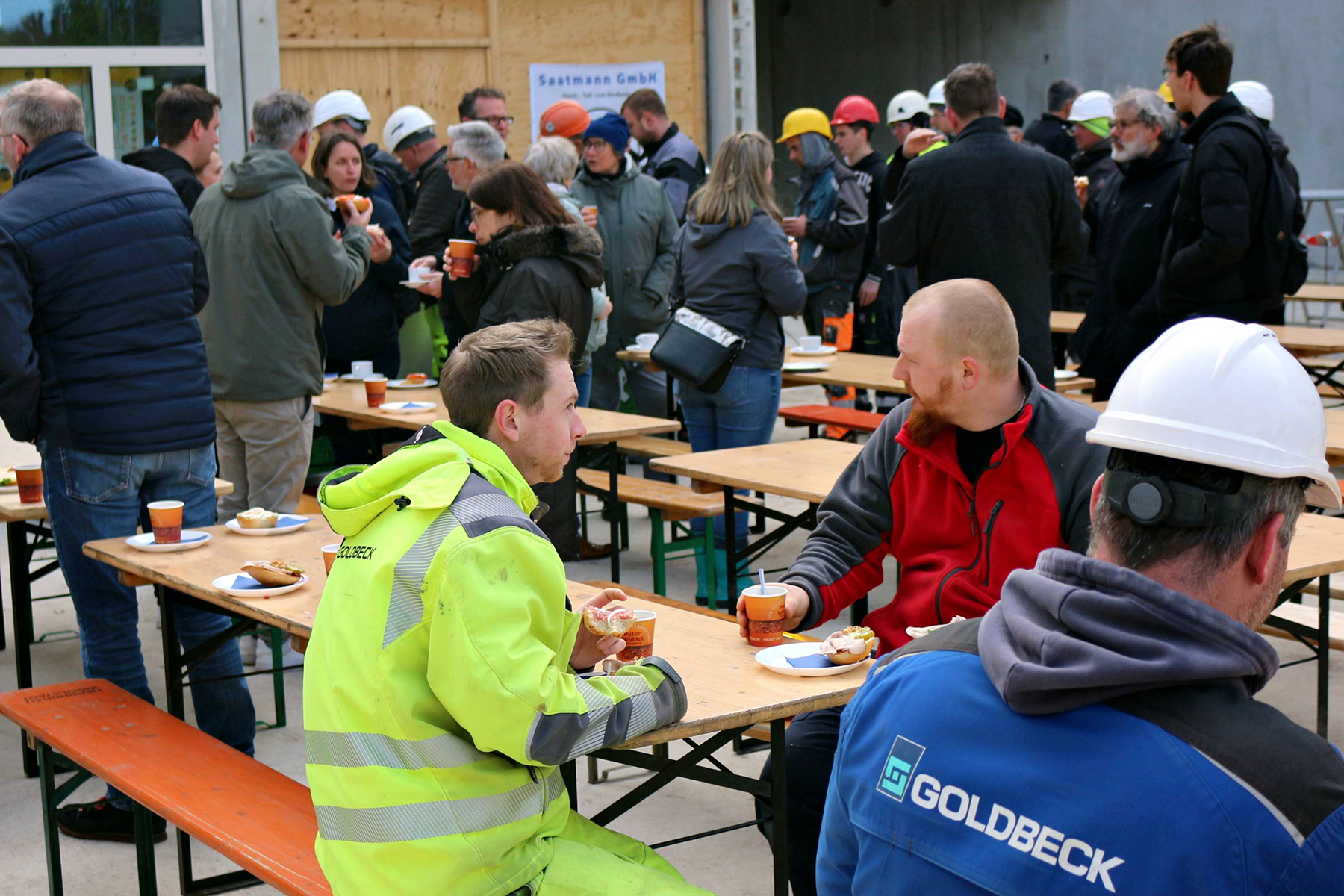 Rund sechs Monate nach der Grundsteinlegung sei mit dem Richtfest die nächste Etappe geschafft, so Pollehn, der die "hervorragenden Leistungen" aller Handwerker und Planungsbeteiligten hervorhob: "Und weil wir aus diesem großen Anlass keine ‚hartherzigen Bauherren‘ sind, laden wir alle Anwesenden zum anschließenden Richtschmaus ein."