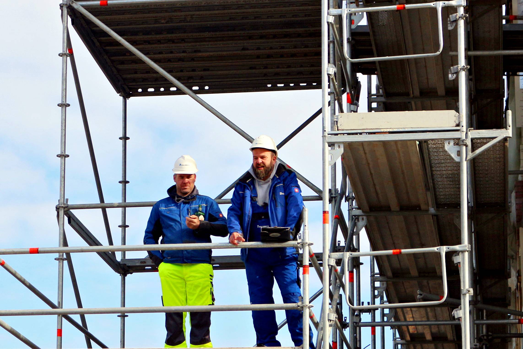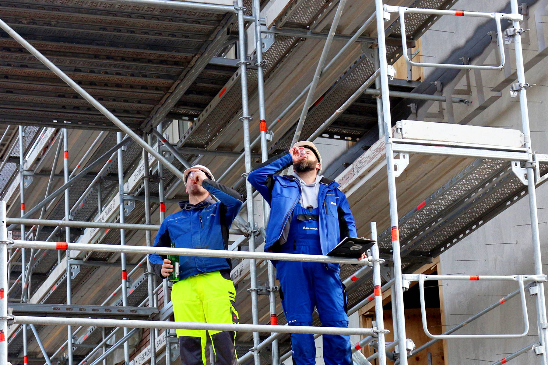 Den Grußworten von RBG-Schulleiterin Saskia Waveren-Matschke folgte der traditionelle Richtspruch, der hoch oben auf dem Außengerüst von Goldbeck-Richtmeister Mario Erdmann ausgebracht und mit Hochprozentigem begossen wurde.