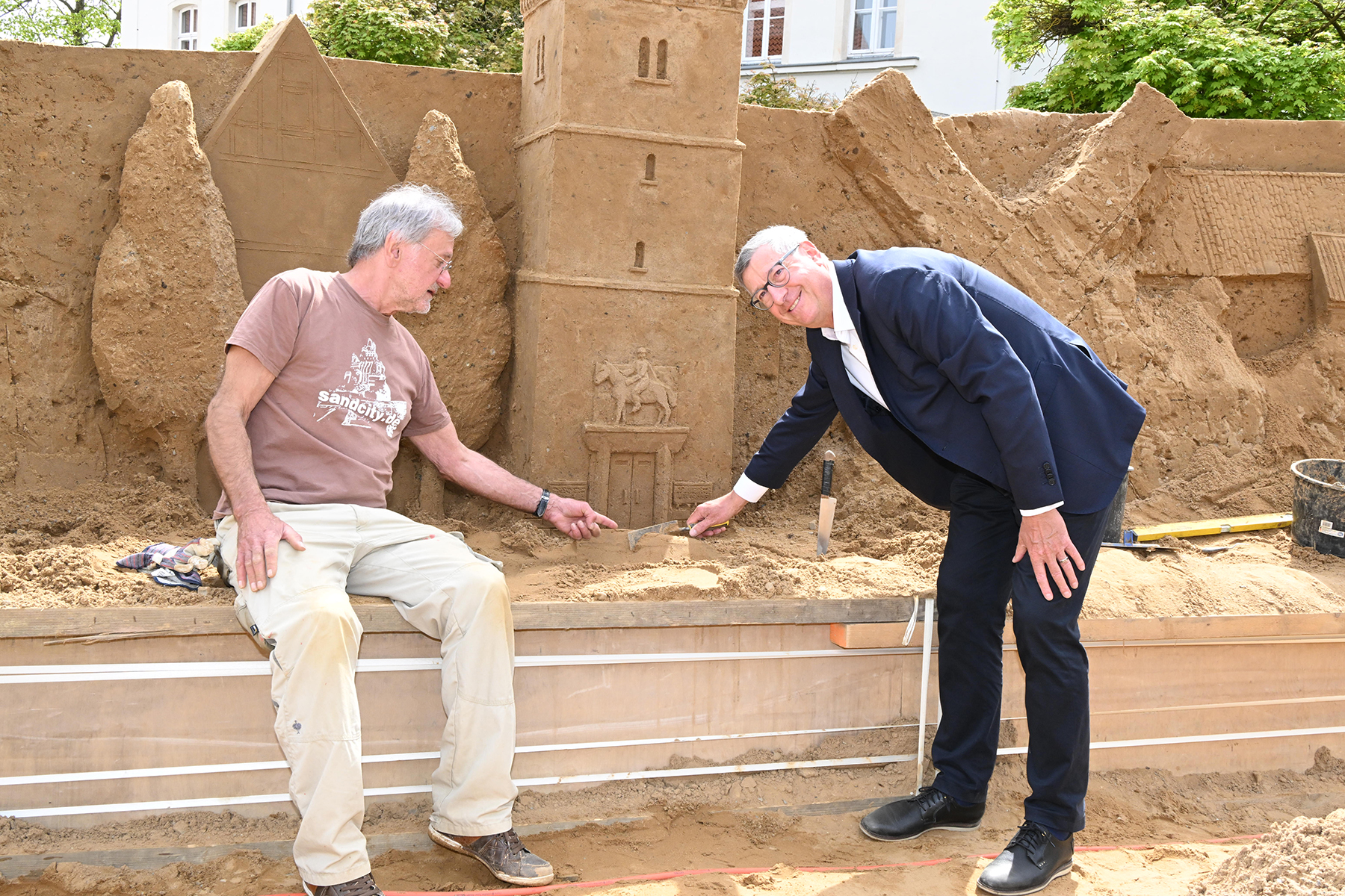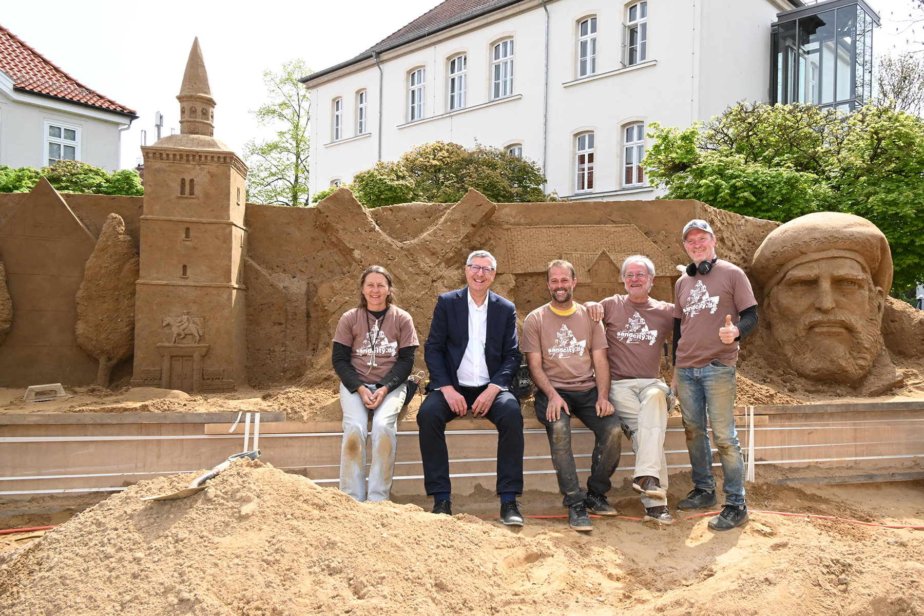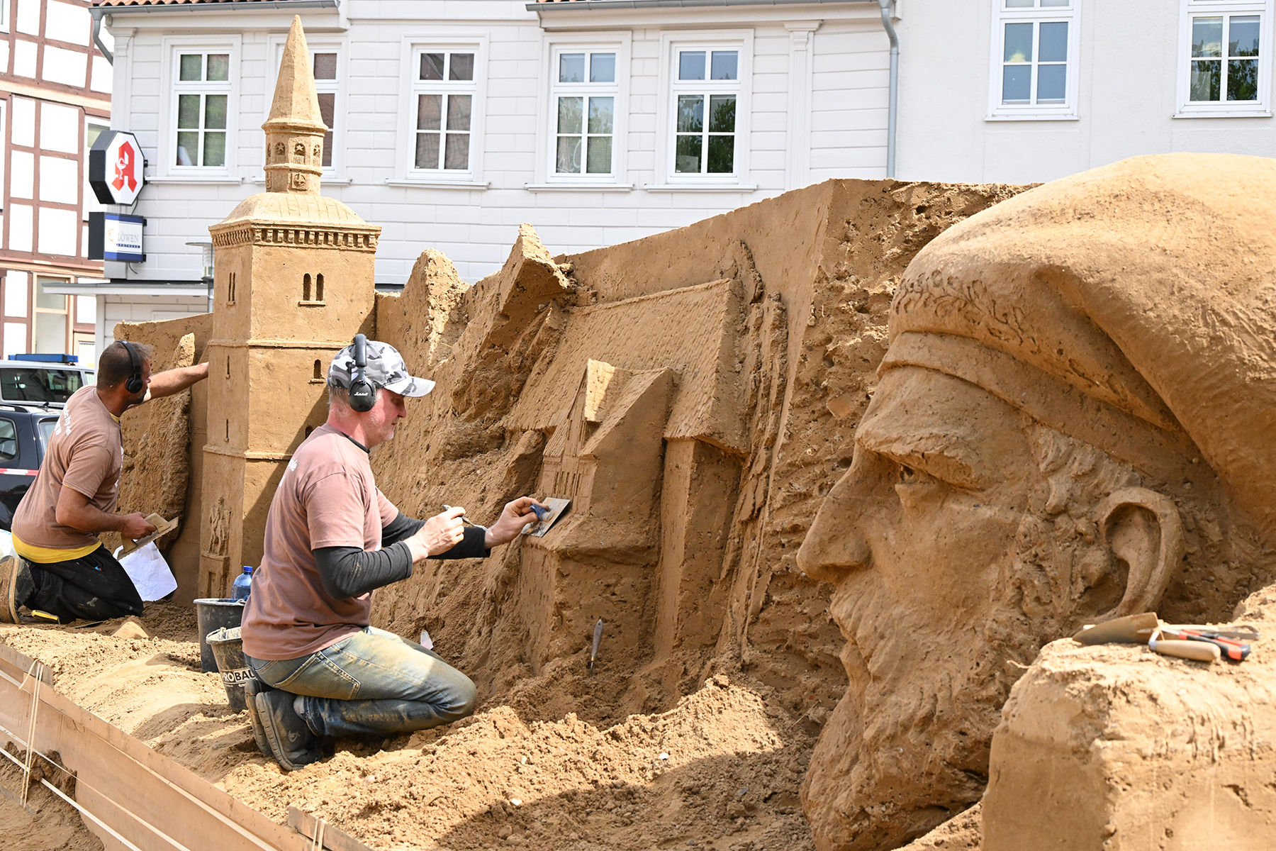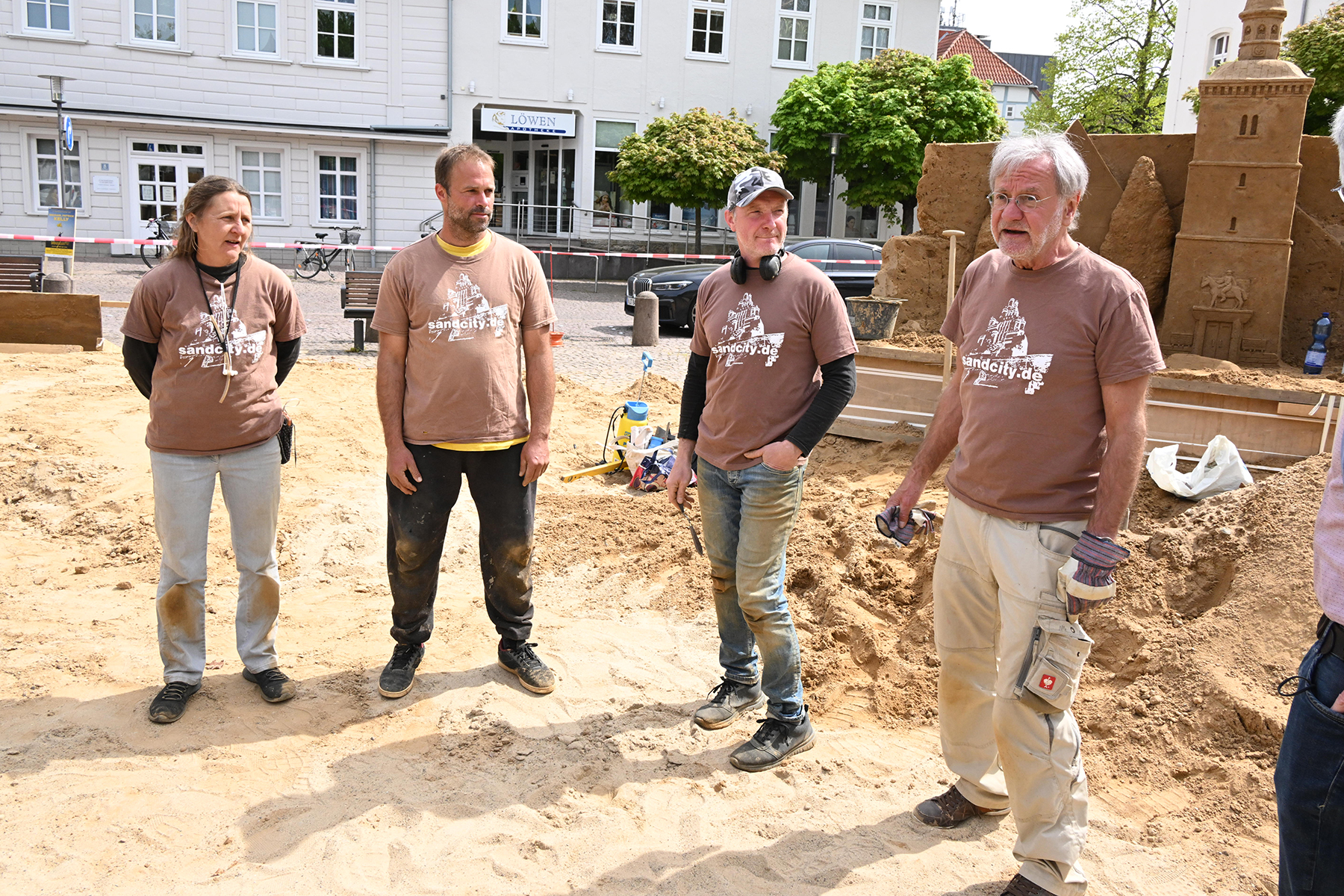 Burgdorf wird um eine – wenn auch kurzezeitige – Attraktion reicher: Auf dem Spittaplatz entsteht seit vergangenen Montag eine zwei Meter hohe und zehn Meter breite Sandburg. Diese zeigt Burgdorfer Motive wie das (nicht eingerüstete) Rathaus I, das Schloss, die St.-Pankratius-Kirche, die Sorgenser Mühle und den Schwarzen Herzog. Auch die Hochbrücke wird zu Teilen zu sehen sein. Am heutigen Donnerstag, 4. Mai, lud der Veranstalter, Stadtmarketing Burgdorf, zusammen mit Sponsoren und Bürgermeister Armin Pollehn zum "Richtfest" ein. Sie konnten sich von einem deutlichen Baufortschritt an dem Kunstwerk überzeugen.