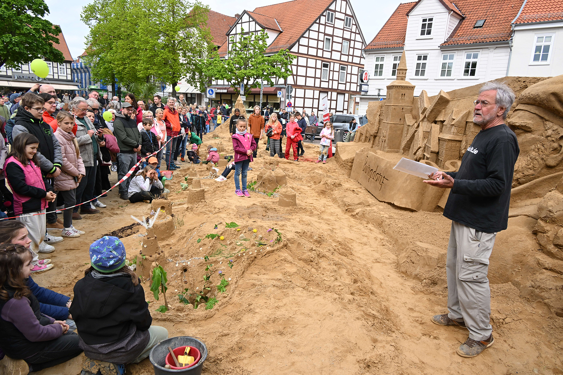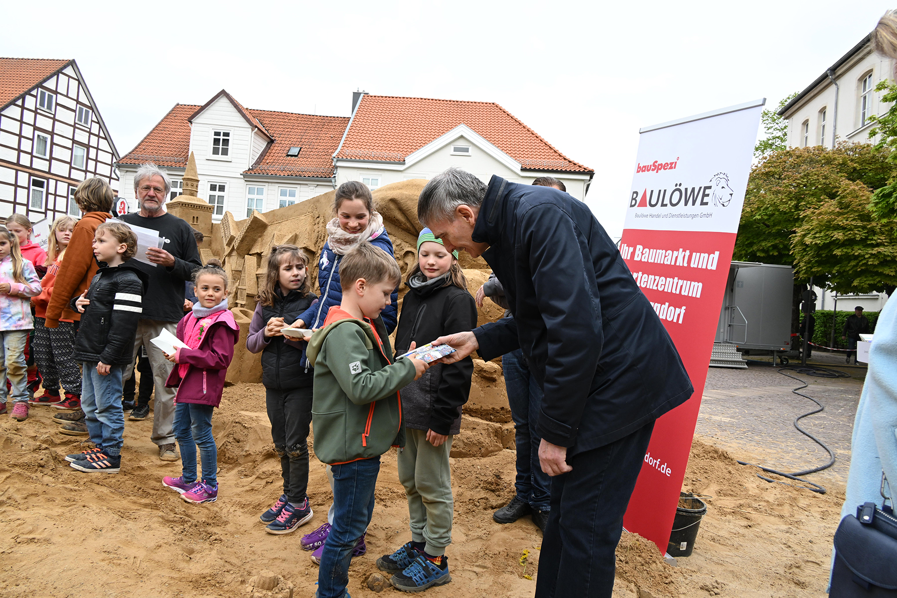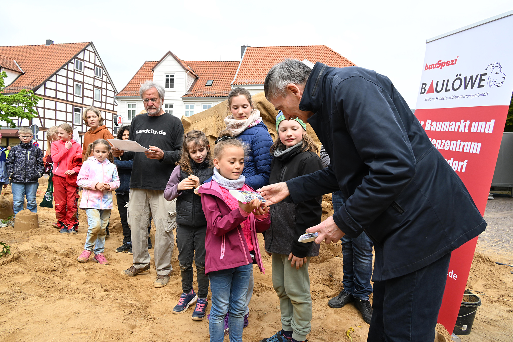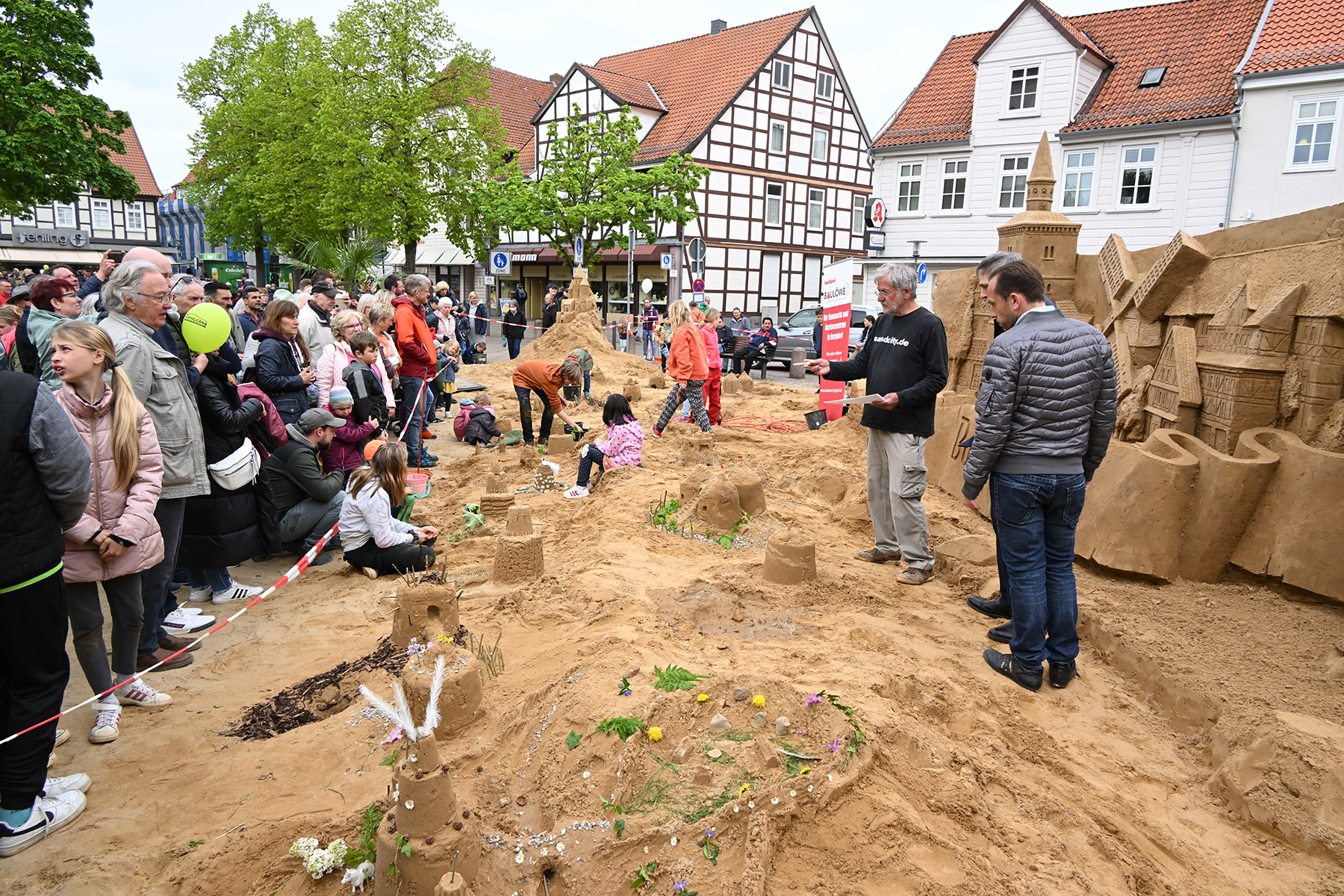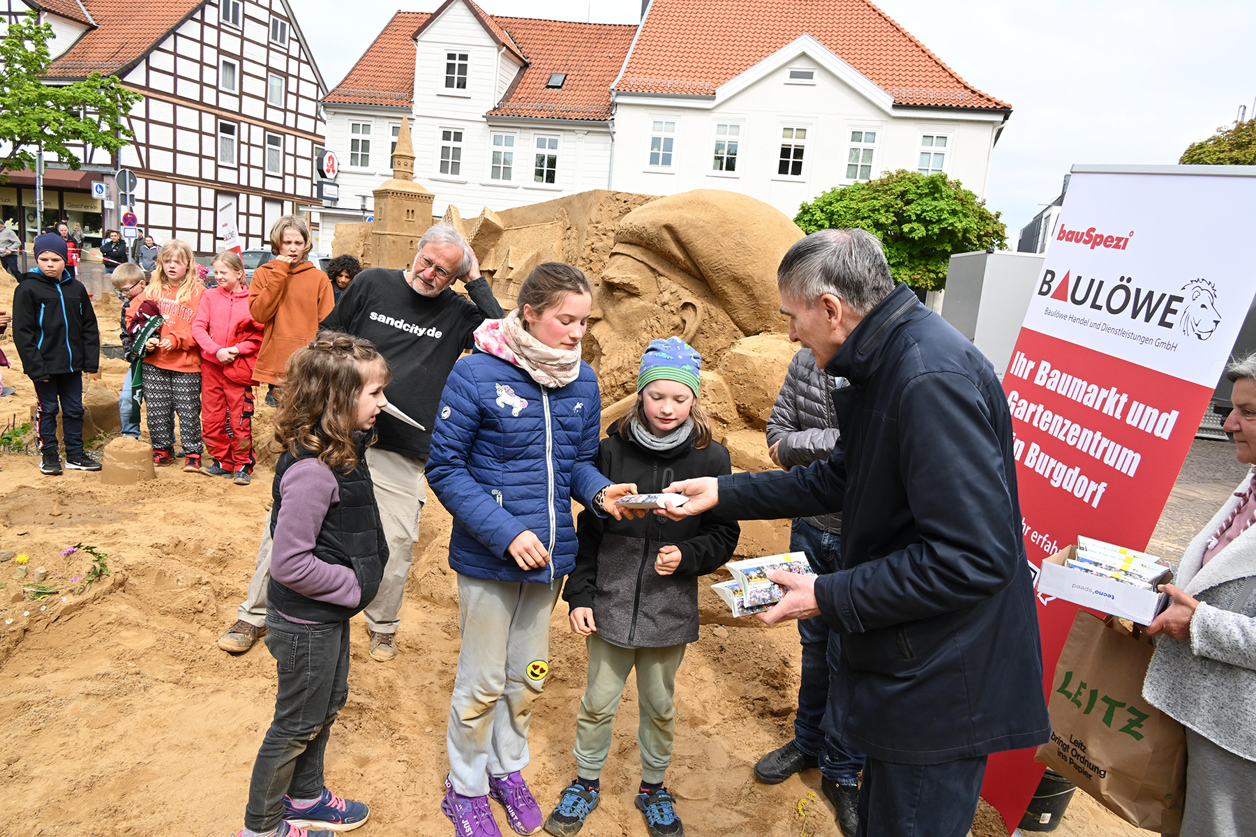 In die Fußstapfen eines Sandburgenbauers konnten heute 23 angemeldete Kinder-Teams treten. Sie durften vor der Kulisse Burgdorfs größter Sandburg selbst einmal eine eigene Burg bauen. Und die Kinder zeigten eindrucksvoll, was in ihnen steckt. "Ihr seid alle Gewinner", urteilte Benno Lindel, der zusammen mit einer Jury die Sandburgen im Vorfeld begutachtet hatte.