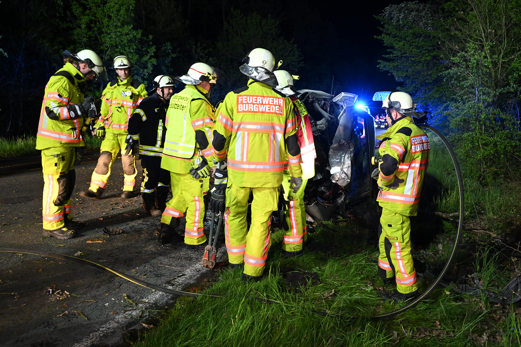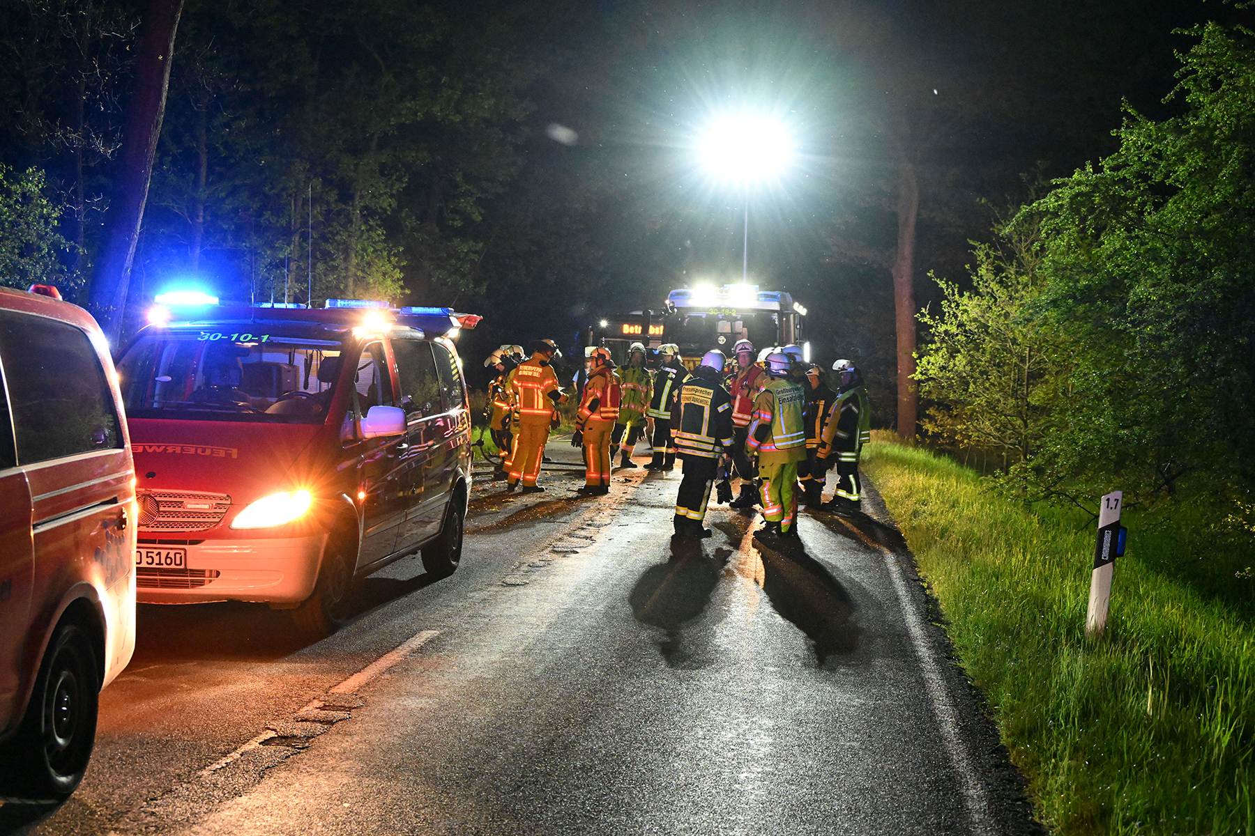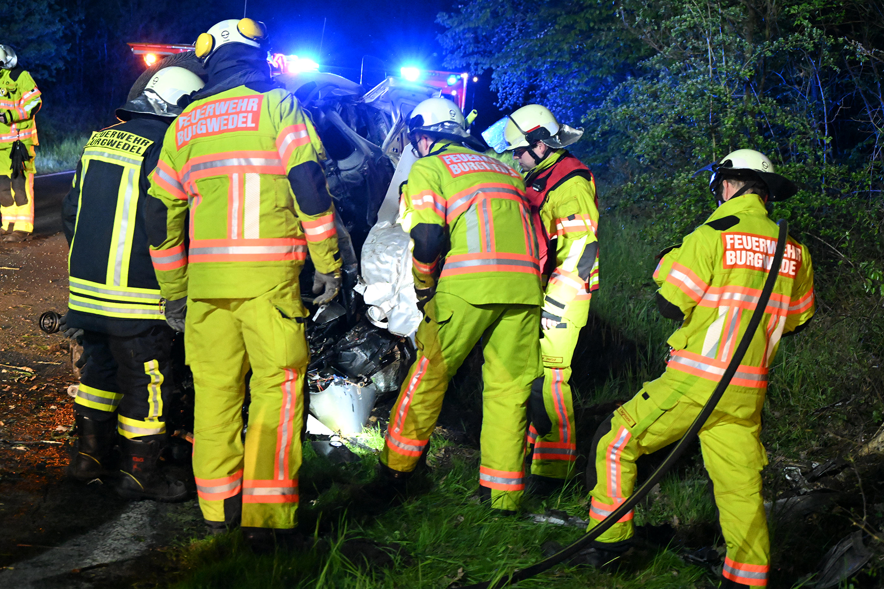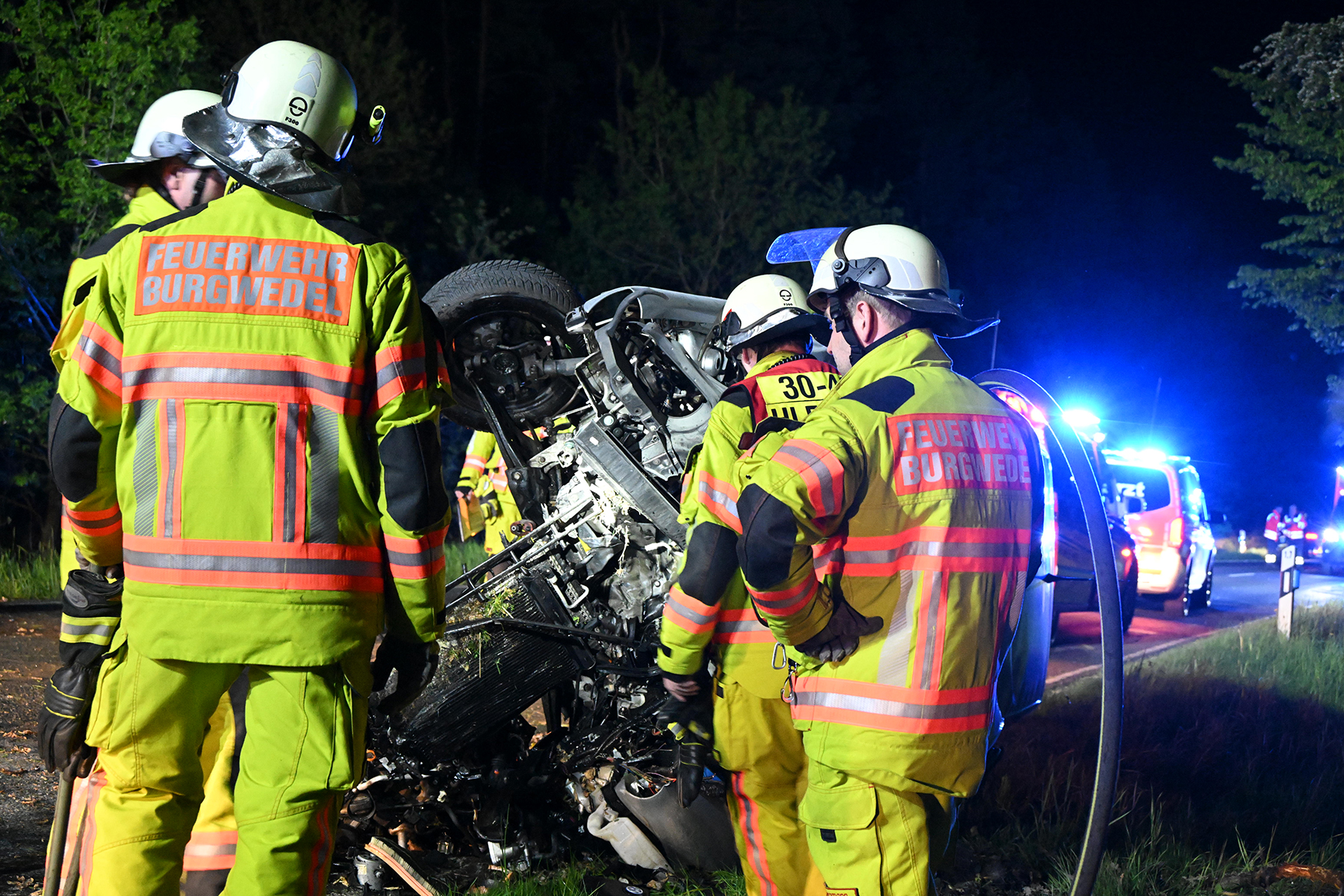 Aufgrund des Notrufs alarmierte die Regionsleitstelle die Freiwillige Feuerwehren aus Oldhorst und Großburgwedel. Die ersteintreffenden Feuerwehrkräfte fanden kein nennenswertes Feuer mehr im Motorraum vor. Sie löschten den Bereich mit Wasser ab und kontrollierten diesen mit einer Wärmebildkamera. Anschließend stellten sie den Brandschutz sicher und befreiten die Fahrbahn zum Teil von Trümmern.