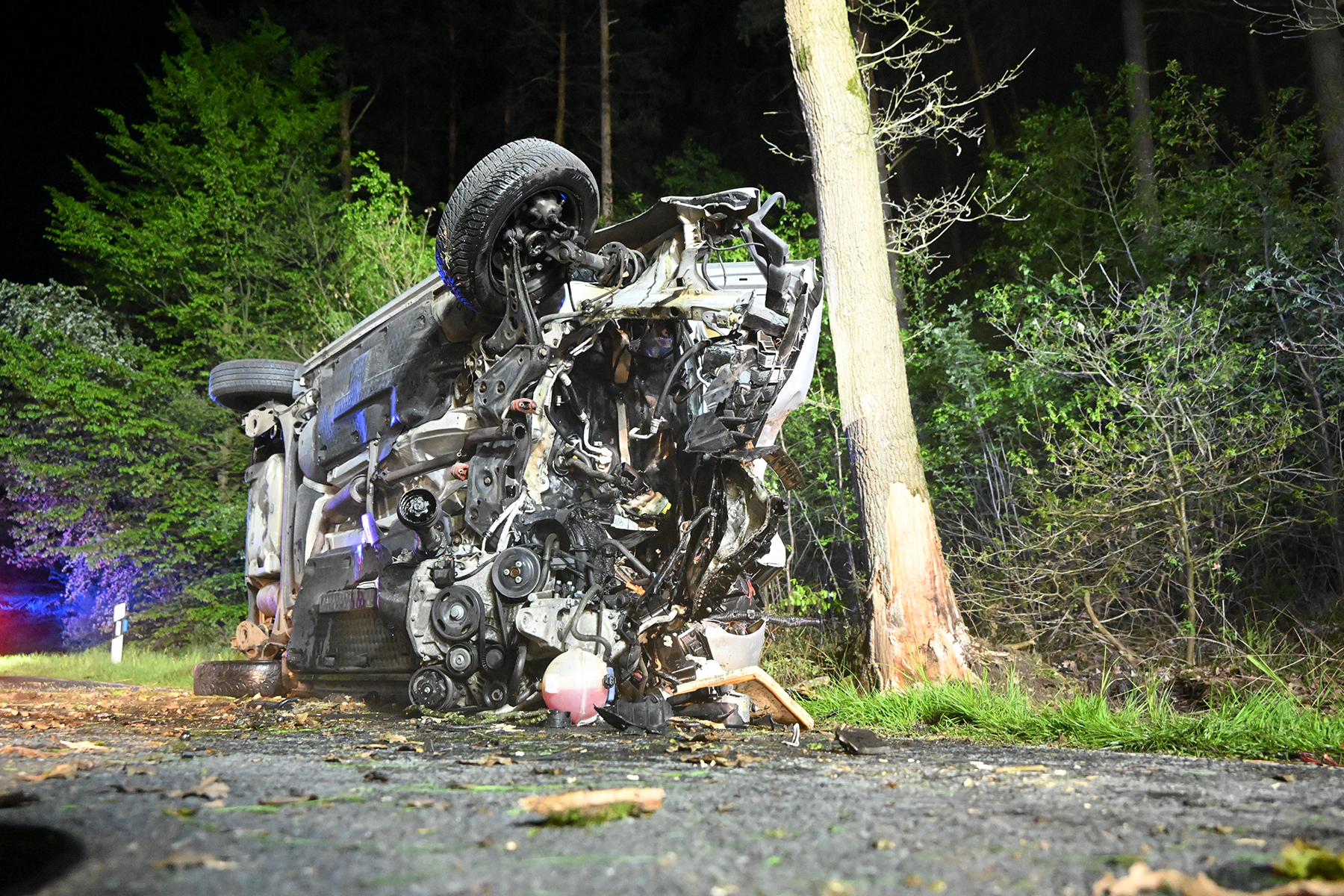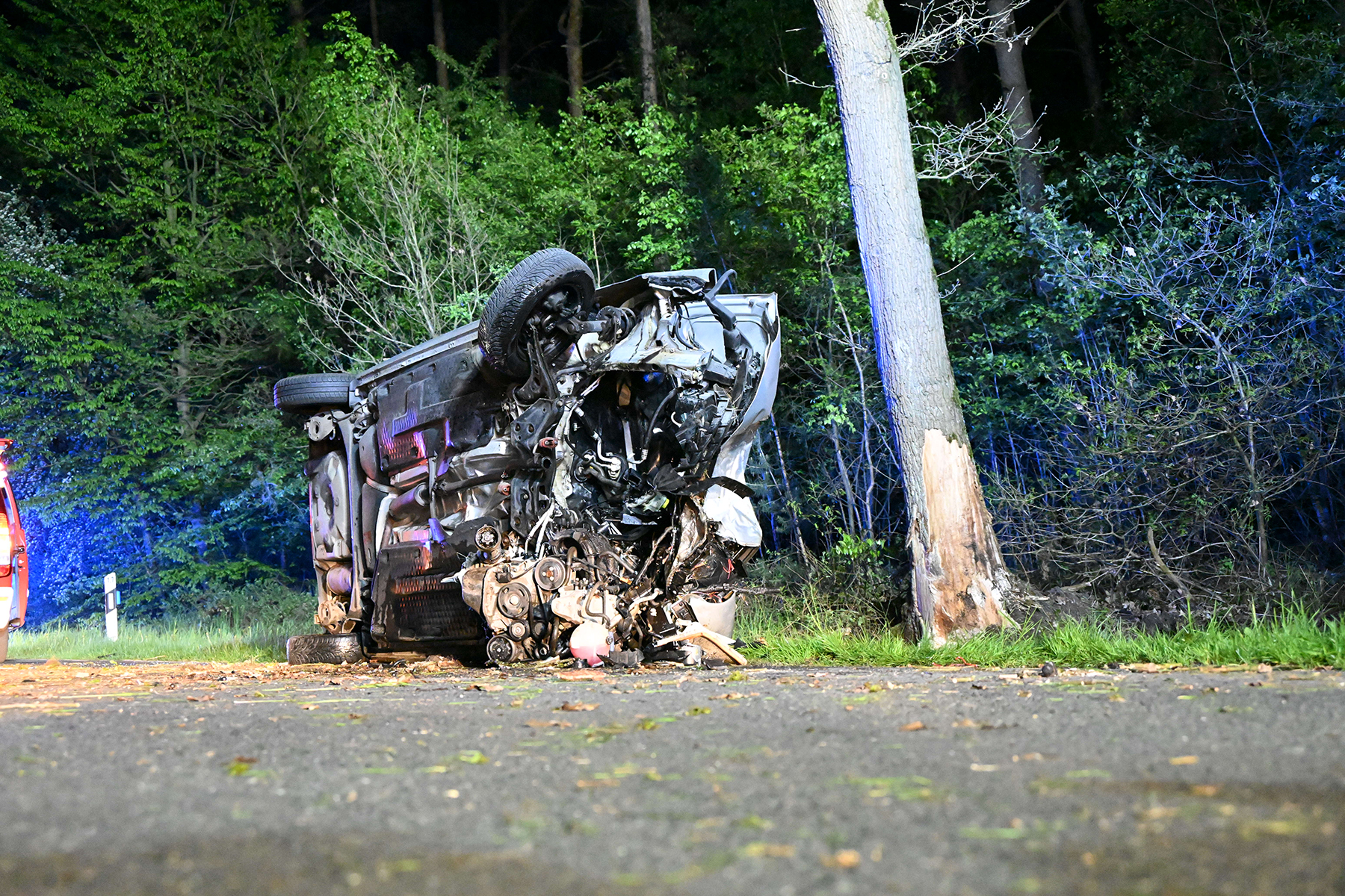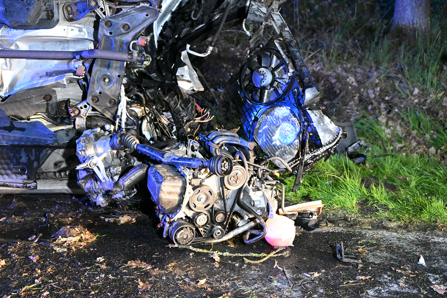 Der Fahrer war aus unbekannter Ursache nach rechts von der Fahrbahn abgekommen und frontal mit einem Baum kollidiert. Durch die Wucht des Aufpralls wurde der Polo auf die Fahrerseite geschleudert, auf der er zum Liegen kam. Auch der Motorblock wurde aus seiner Verankerung gerissen und lag neben dem Fahrzeug. Ein Rad wurde zudem durch den Aufprall abgerissen.