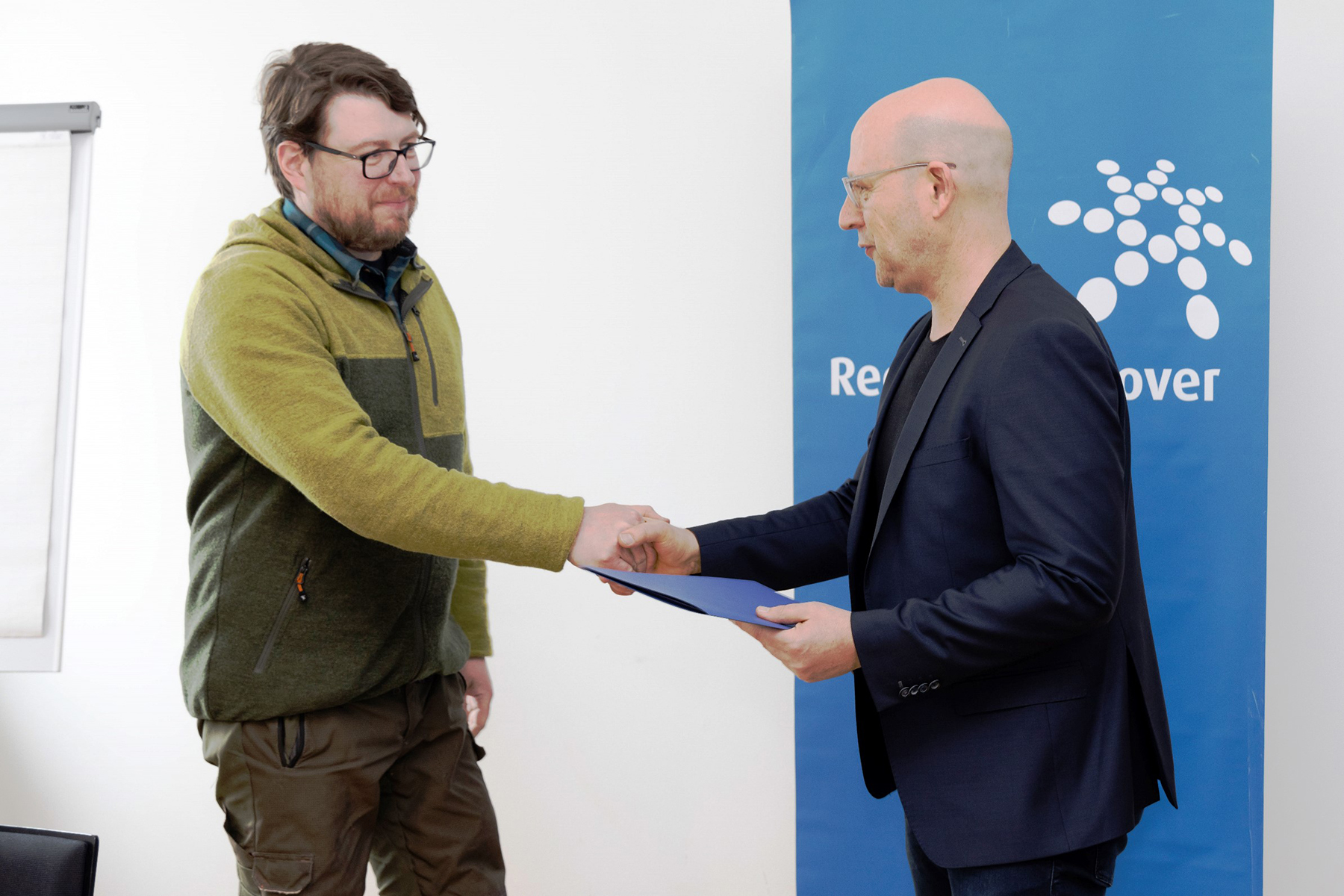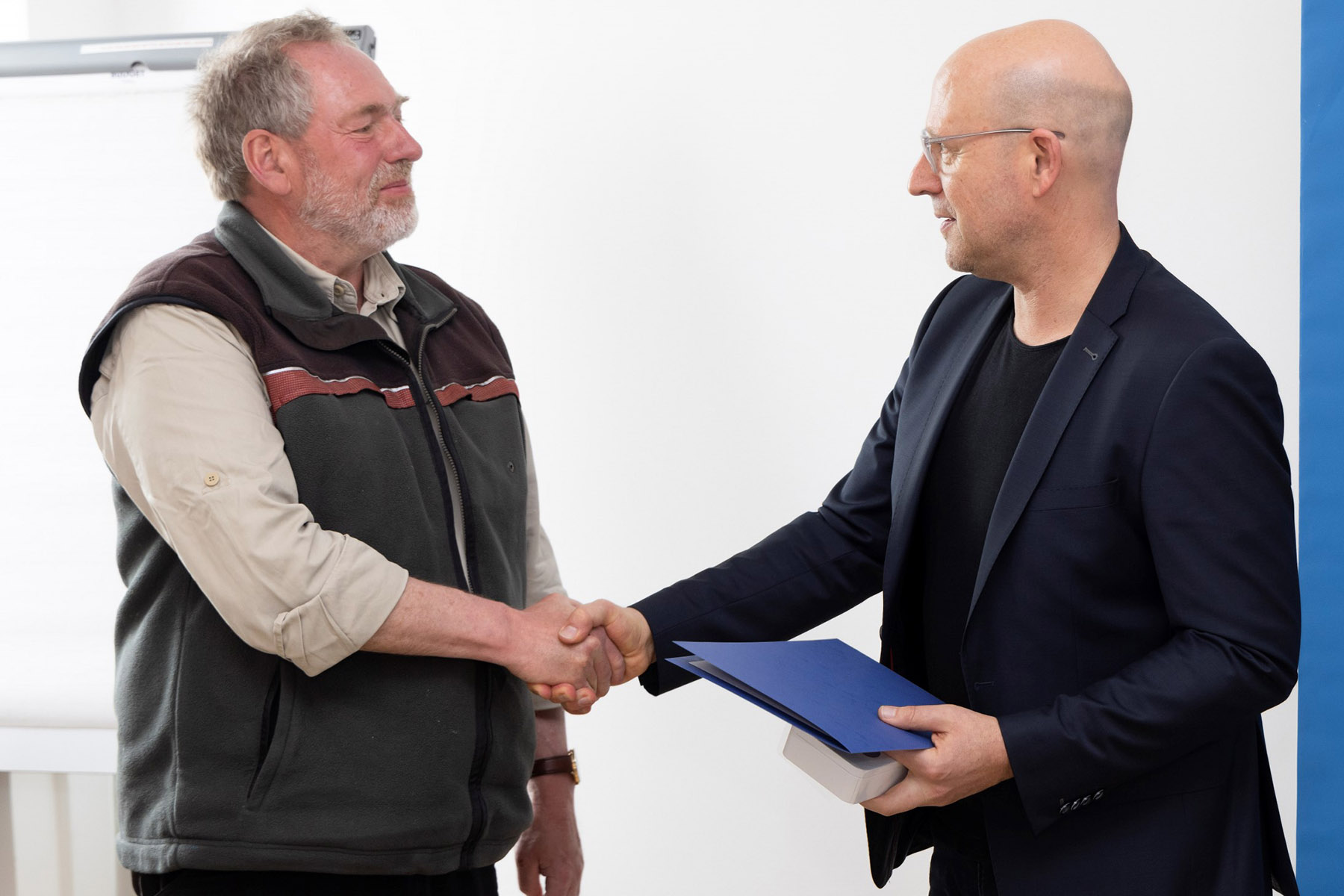 Jens Palandt überreicht die Urkunde an Johanna Hagemann, die zur ehrenamtlichenn Waldbrandbeauftragten für Lehrte ernannt wurde. / Foto: Region Hannover, Iris Terzka