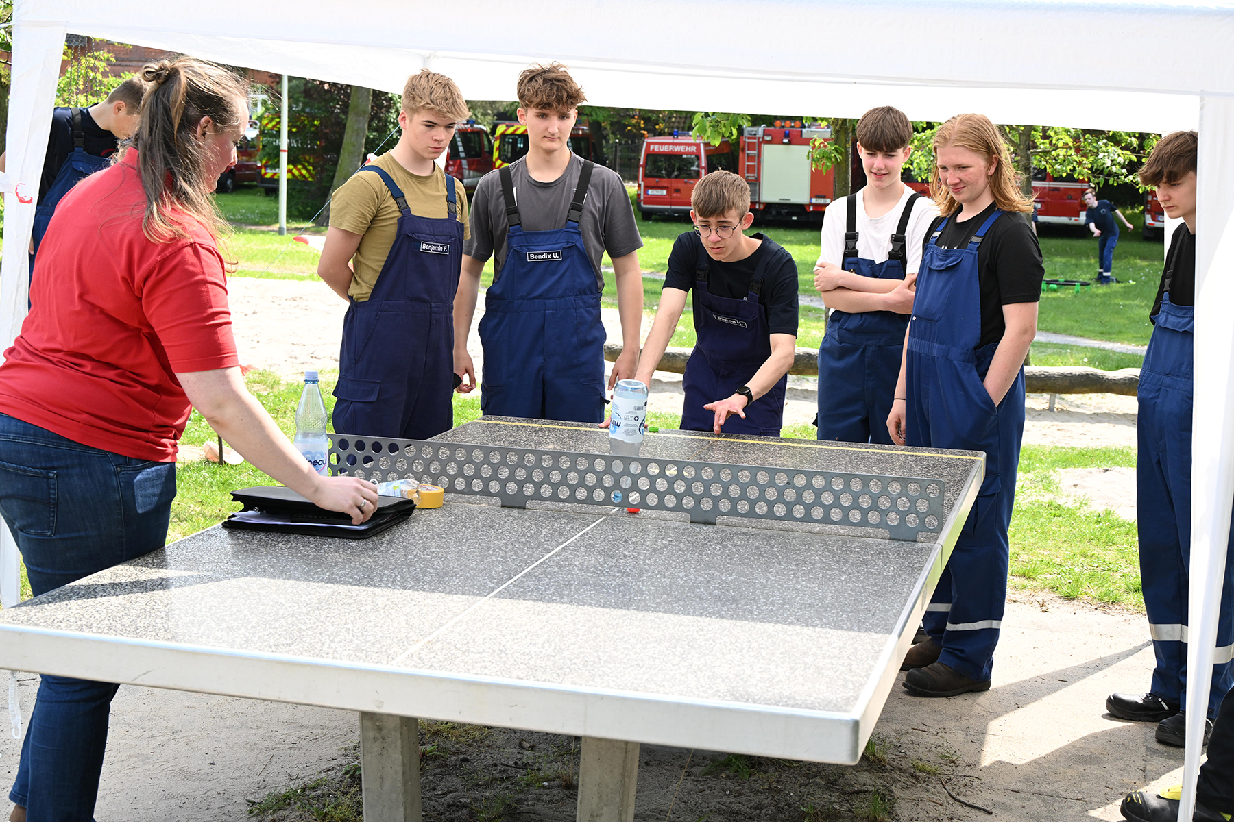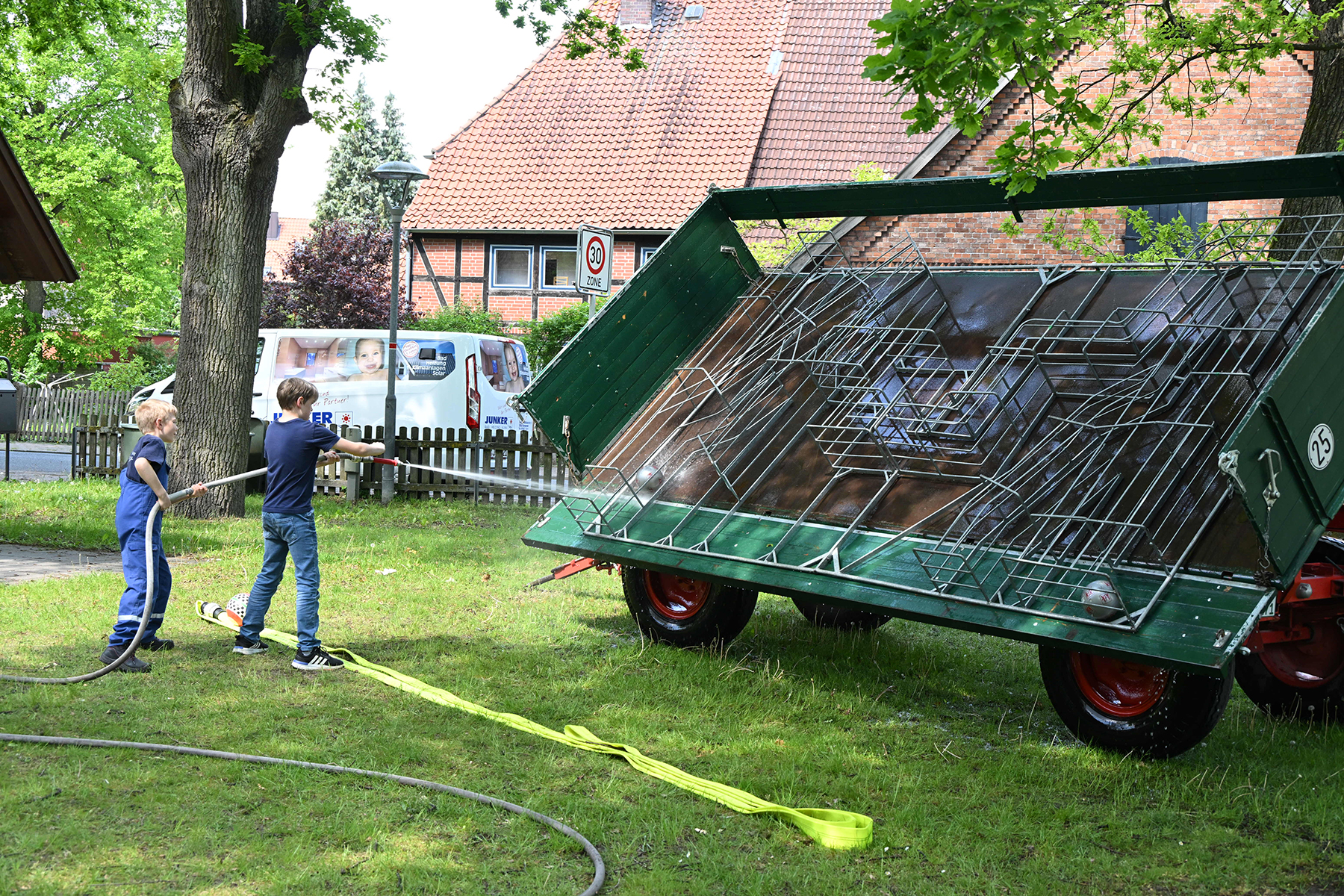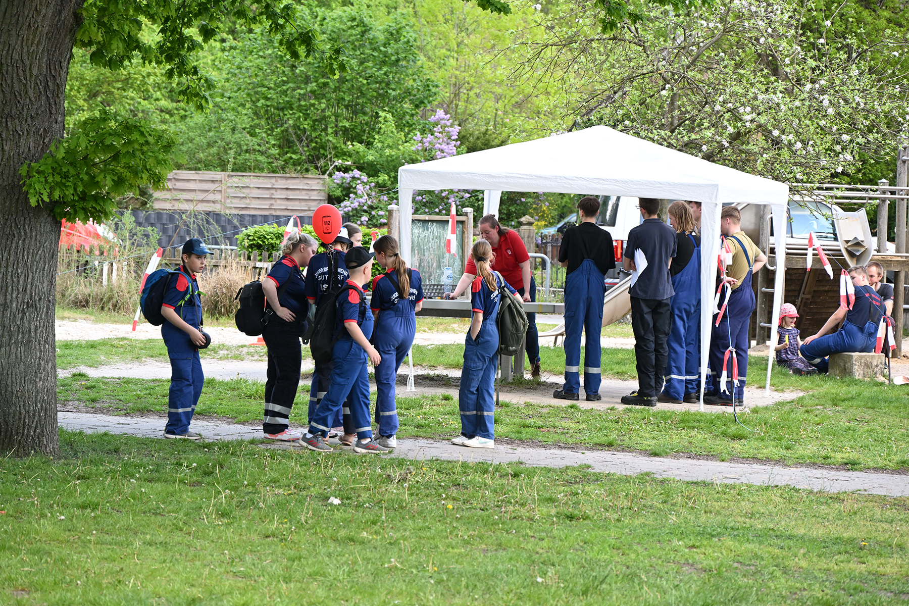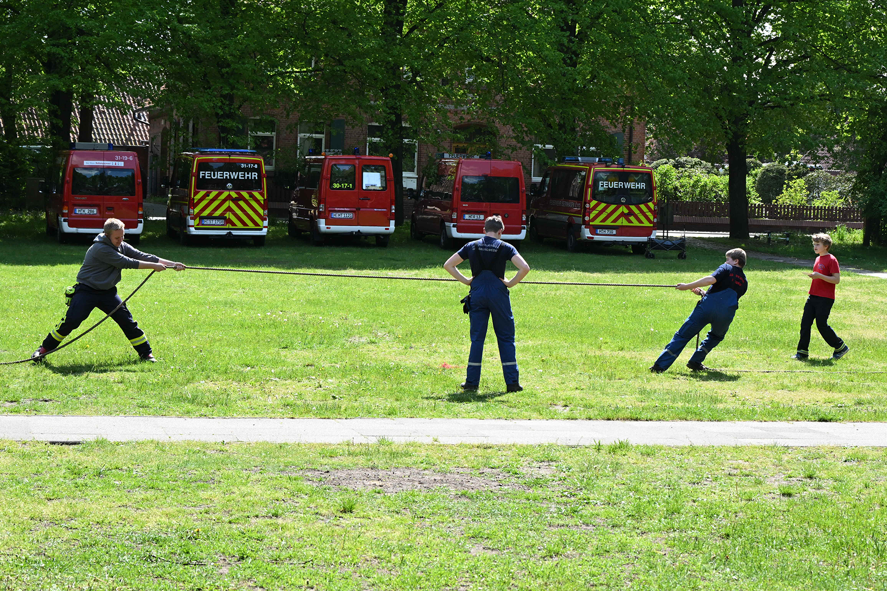 Zurück auf dem Dorfplatz erwartete die Gruppen ein buntes Programm an Spiel und Spaß. Auch die Verpflegung kam mit Bratwurst, Pommes und Getränken nicht zu kurz. Zu Besuch waren unter anderem der Ortsbrandmeister aus Ramlingen-Ehlershausen, Heinrich Könecke, und der stellvertretende Ortsbrandmeister aus Thönse, Björn Schimkewitsch.
