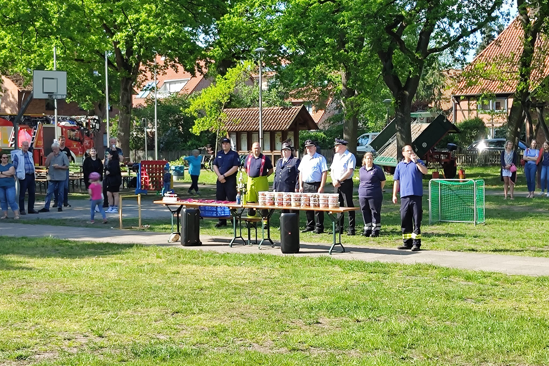 Dann war es endlich so weit. Gegen 17 Uhr konnten endlich die Sieger gekürt werden. Bei der Verleihung kam es beinahe zu Platzproblemen auf dem Wettmarer Dorfplatz, als alle 25 Gruppen nebeneinander standen. Der Preistisch vorne ließ fast keinen Platz mehr für alle Preise. Begleitet wurde die Verleihung vom Stadtbrandmeister aus Burgdorf, Dennis-Frederik Heuer, und dem Gemeindebrandmeister aus Isernhagen, Marc Perl. Auch der stellvertretende Stadtbrandmeister aus Burgwedel, Tibor Biczok, sowie die Stadt- und Gemeindejugendfeuerwehrwarte Tim Rathmann (Burgwedel), Andreas Maschigefski (Burgdorf) und Meike Berkelmann (Isernhagen) waren anwesend.