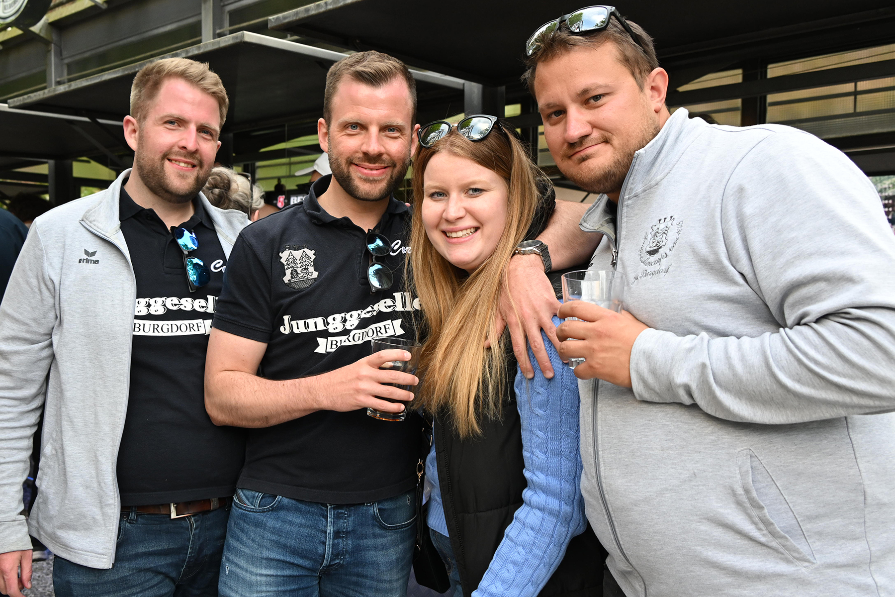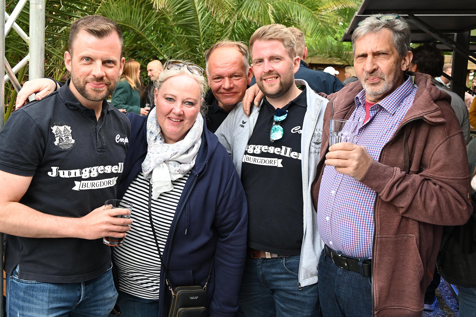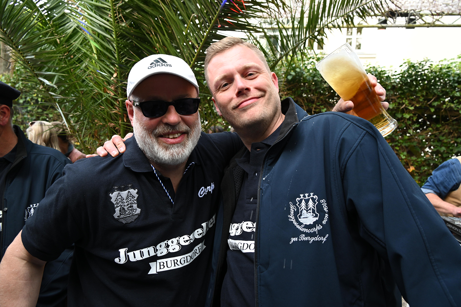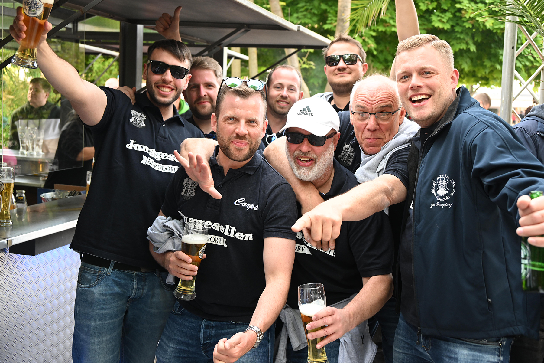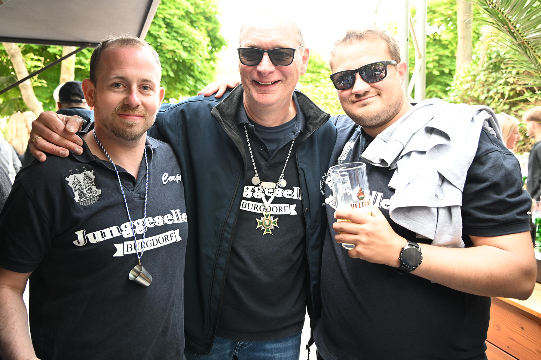 Derweil strömten mehr und mehr Gäste in den Biergarten am Spittaplatz. Pächter Olaf Schlue selbst stand am Plattenteller und sorgte für Stimmung. Unter den Gästen waren auch viele Mitglieder der Junggesellschaft Burgdorf, die gemeinsam den Vatertag begingen und auch ihre Könige feierten. Im vergangenen Jahr stellte die Junggesellencorporation mit Sascha Biewer und Florian Baumöller beide Könige zum Burgdorfer Schützenfest – die in wenigen Wochen ihre Titel verteidigen wollen.