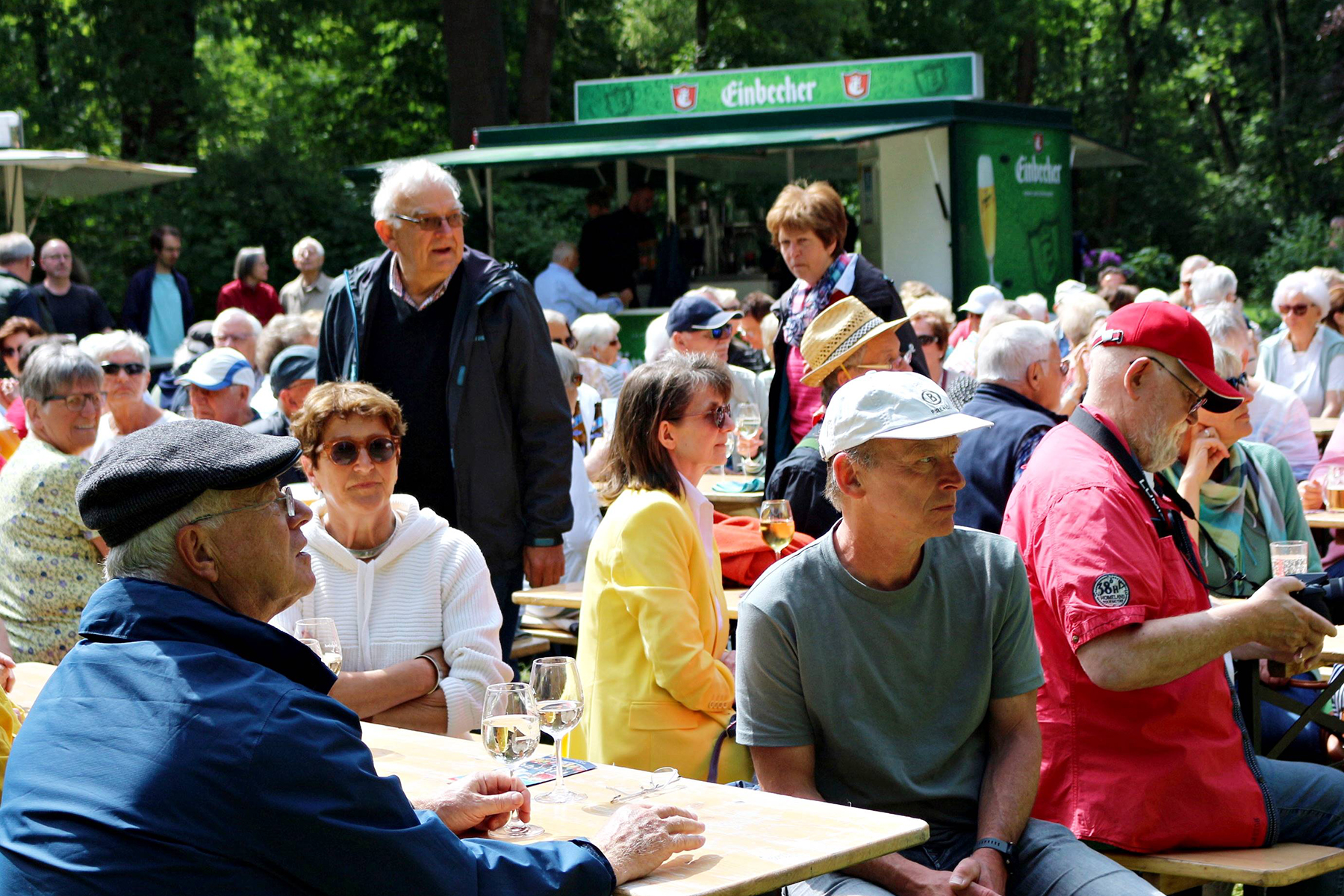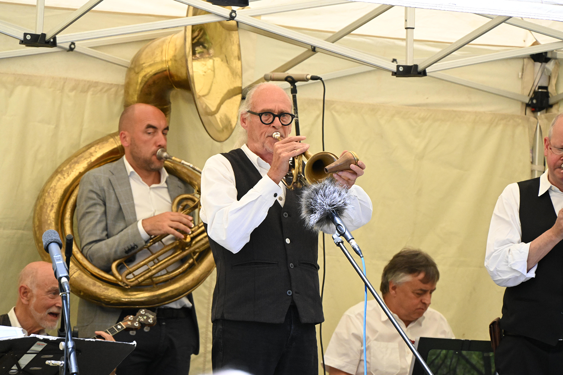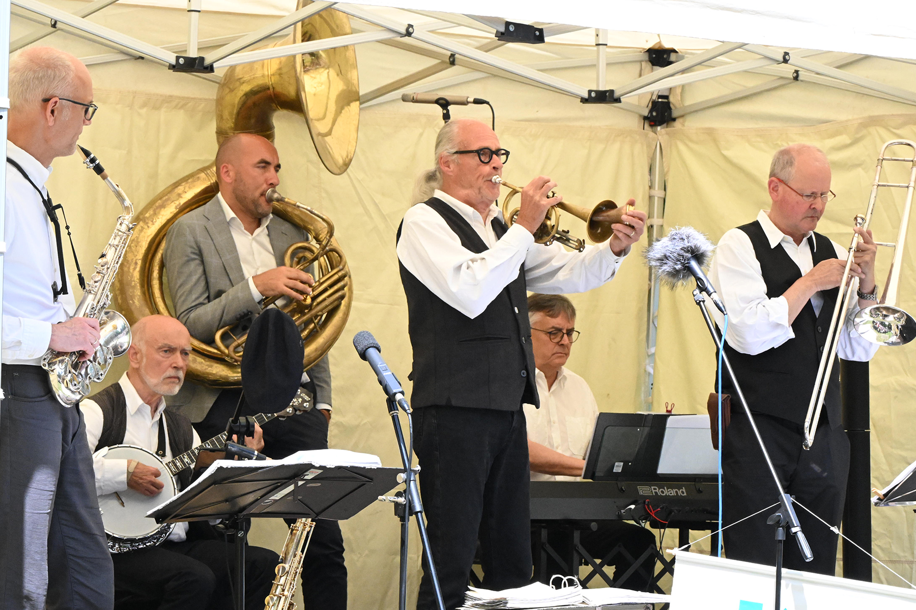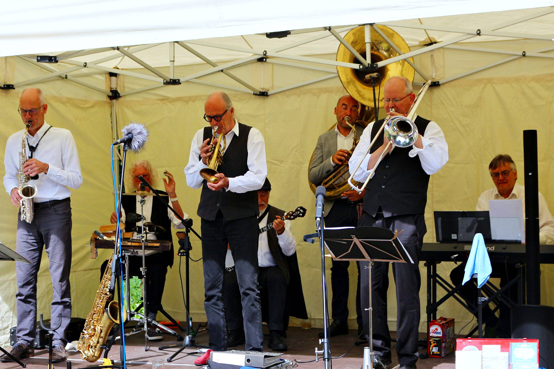 Wässerchen und andere kühle Durstlöscher gab es für die reichlich anwesenden Musikfreunde am Müsken-Weinstand sowie vom Zapfhahn des bewirtschaftenden Veranstaltungsteams von Peter Widdel. So versorgt servierten die sieben Hansestadt-Mucker dazu Hot Jazz aus den 20er Jahren.