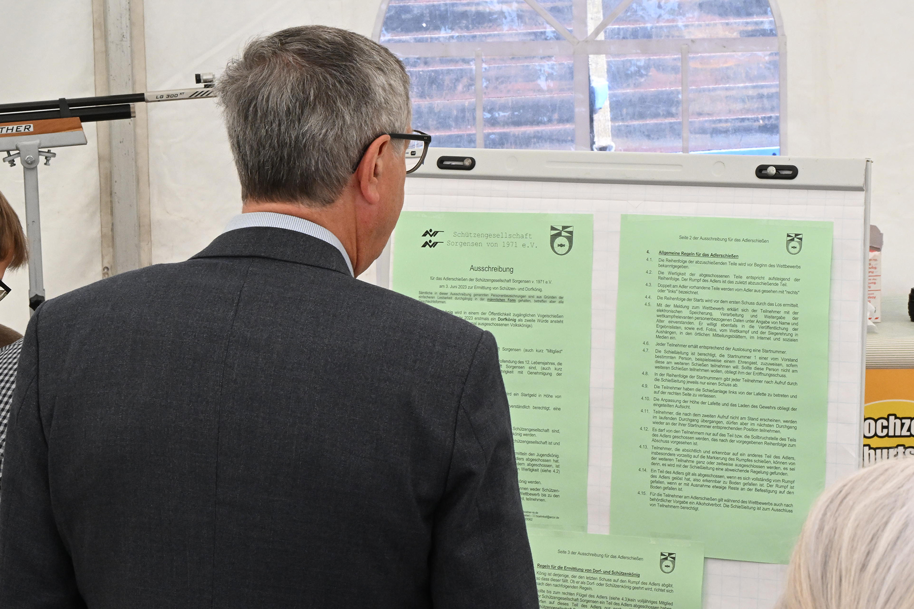 Der Vorsitzende der Schützengesellschaft Sorgensen, Heiz Kistner, begrüßte die Teilnehmer und Gäste und ließ sie wissen, dass der Schießstand am Vormittag offiziell abgenommen wurde und der Bürgermeister den Wettbewerb mit der Startnummer 1 starten werde. Rund 2,5 Stunden hatten die Schützen für diesen eingeplant. Zum Winterkönigsschießen hatten sie mit dem Vogelschießen bereits erste Erfahrungen gesammelt.