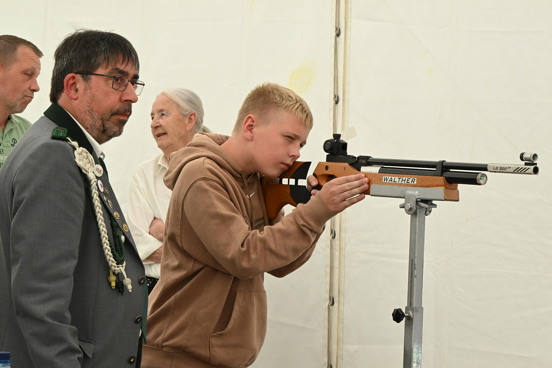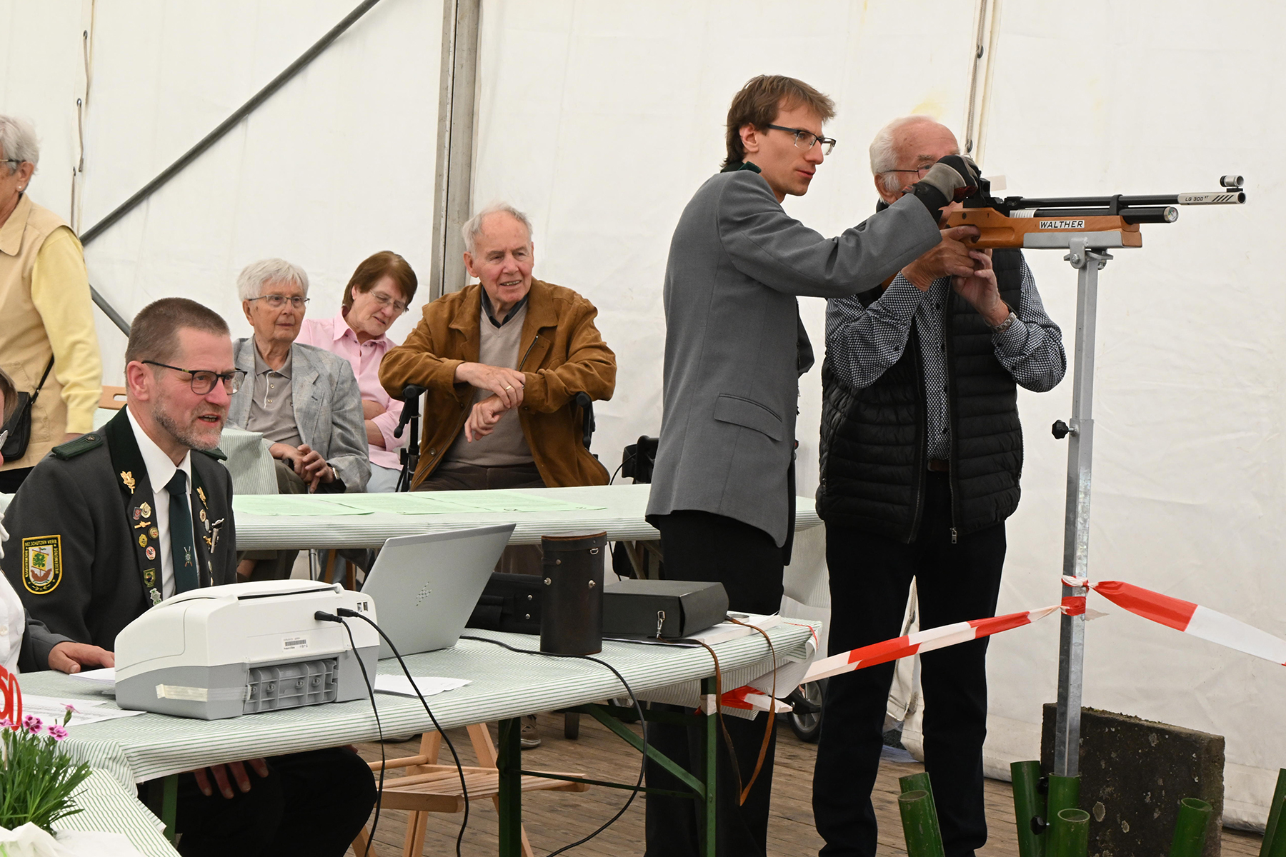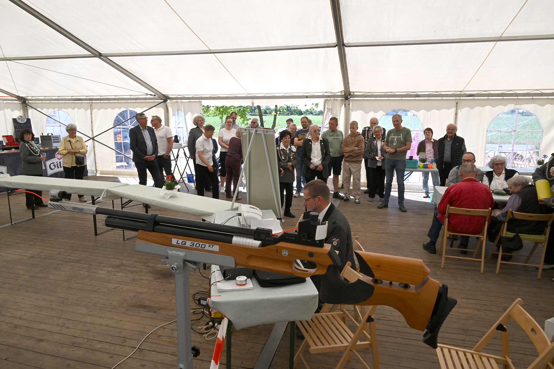 Um 11 Uhr hatten sich 35 Teilnehmer zum Schießen auf den Vogel angemeldet. Geschossen wurde zwar auf ein Ziel, jedoch in zwei Kategorien: Schützen und Einwohner. Denn es sollte einen Schützenkönig/Schützenkönigin und einen Dorfkönig/Dorfkönigin geben.