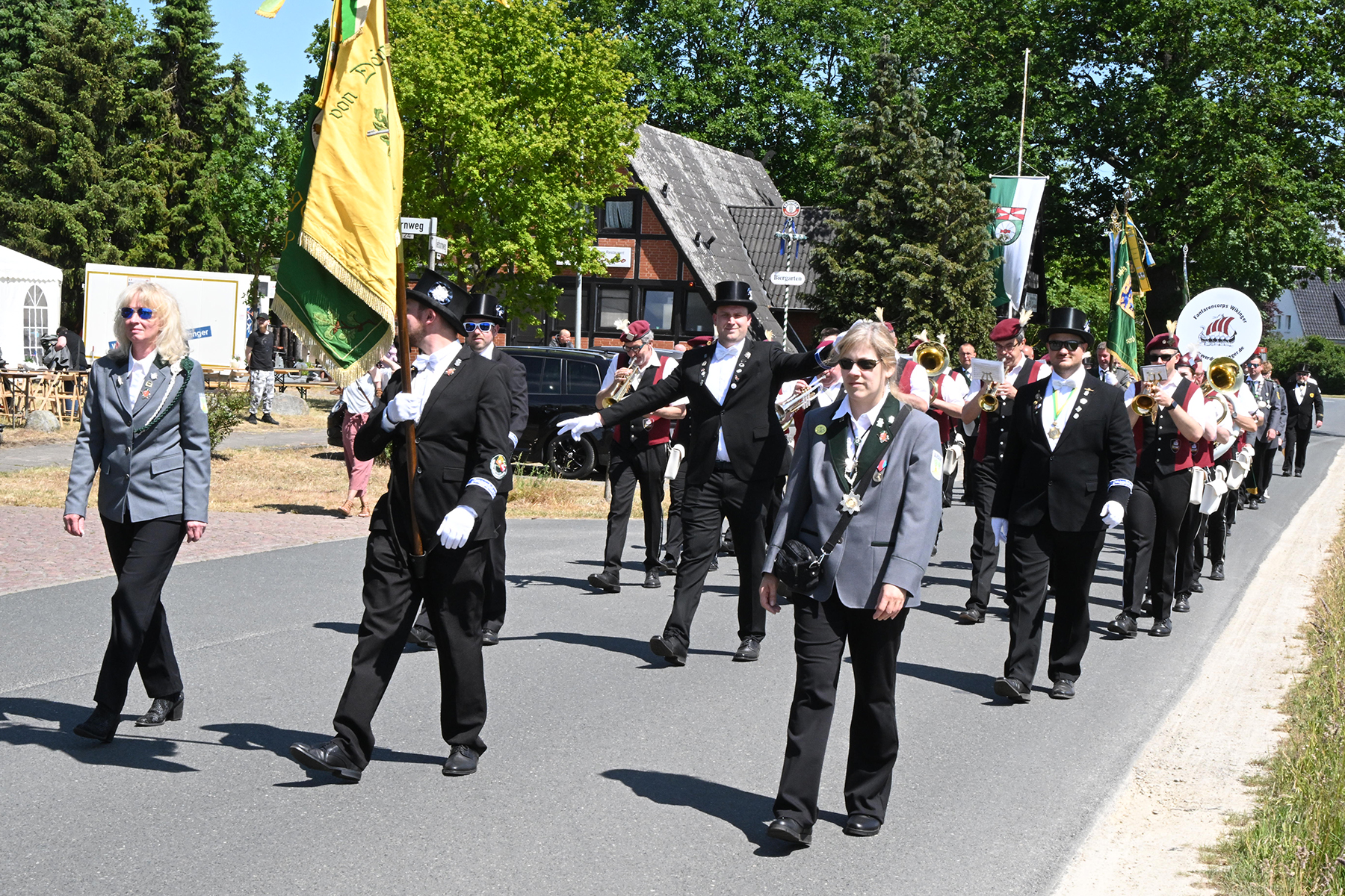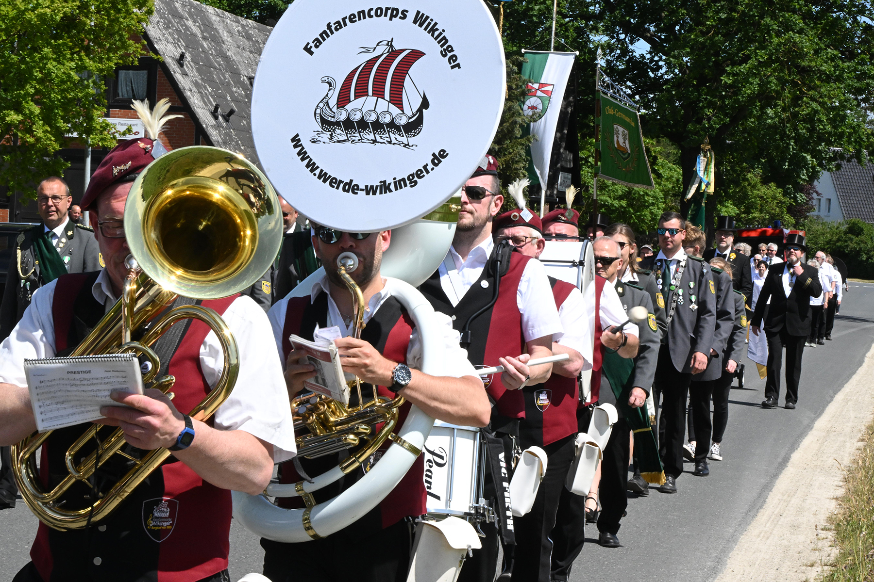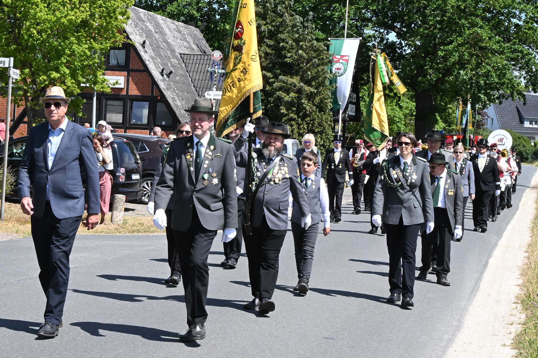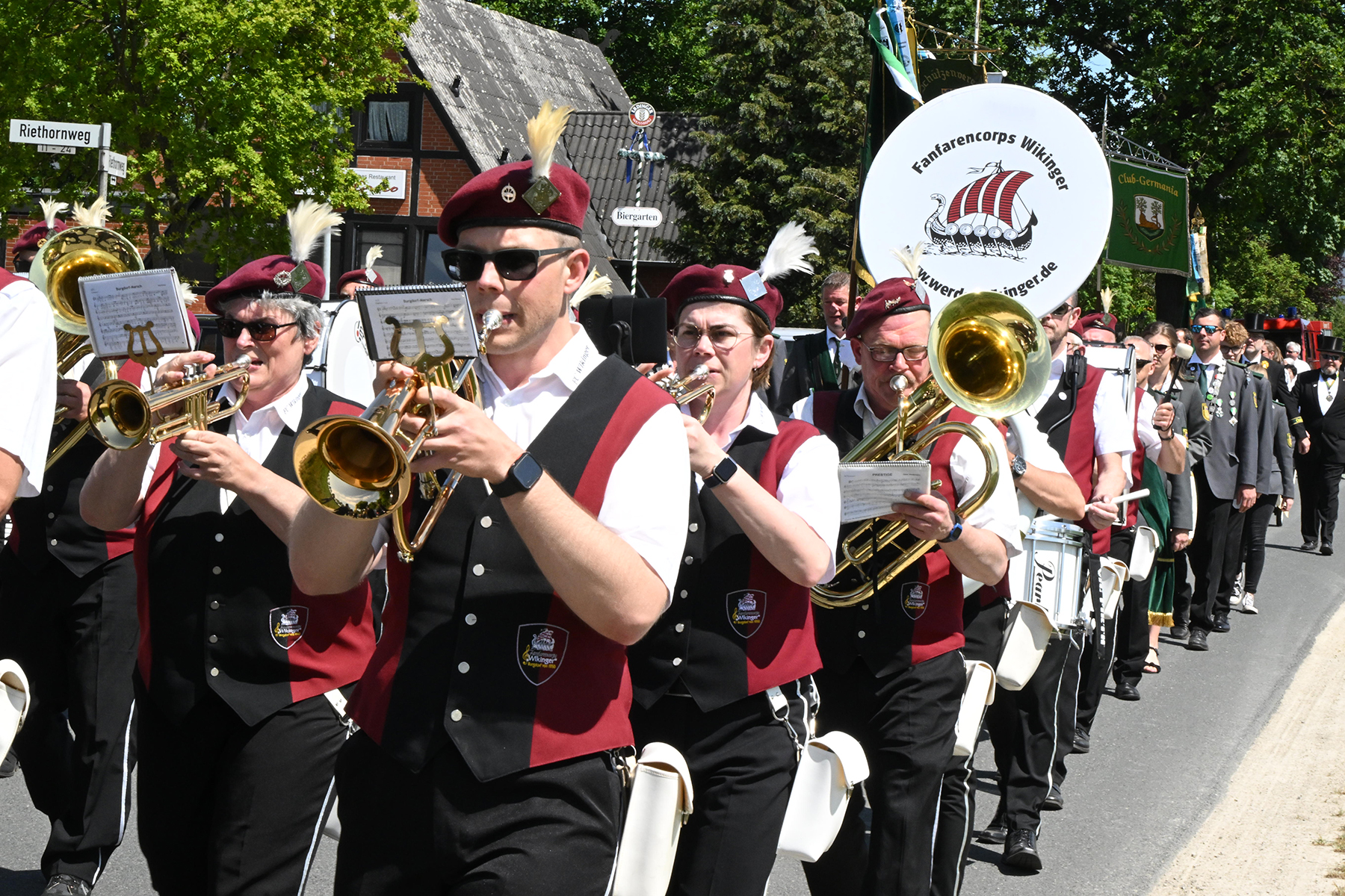 Anschließend ging es für die Schützen zum Anbringen der Königsscheibe. Unter der musikalischen Begleitung des Fanfarencorps "Wikinger" Burgdorf und Absicherung durch Mitglieder der Feuerwehren aus Dachtmissen und Weferlingsen ging es für die Schützen mit befreundeten Vereinen durch den Ort.