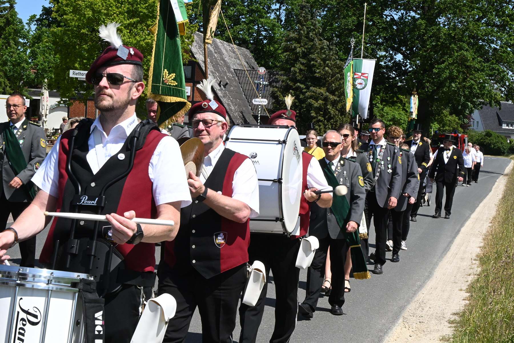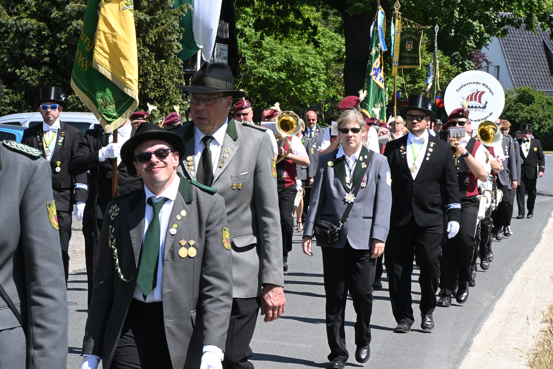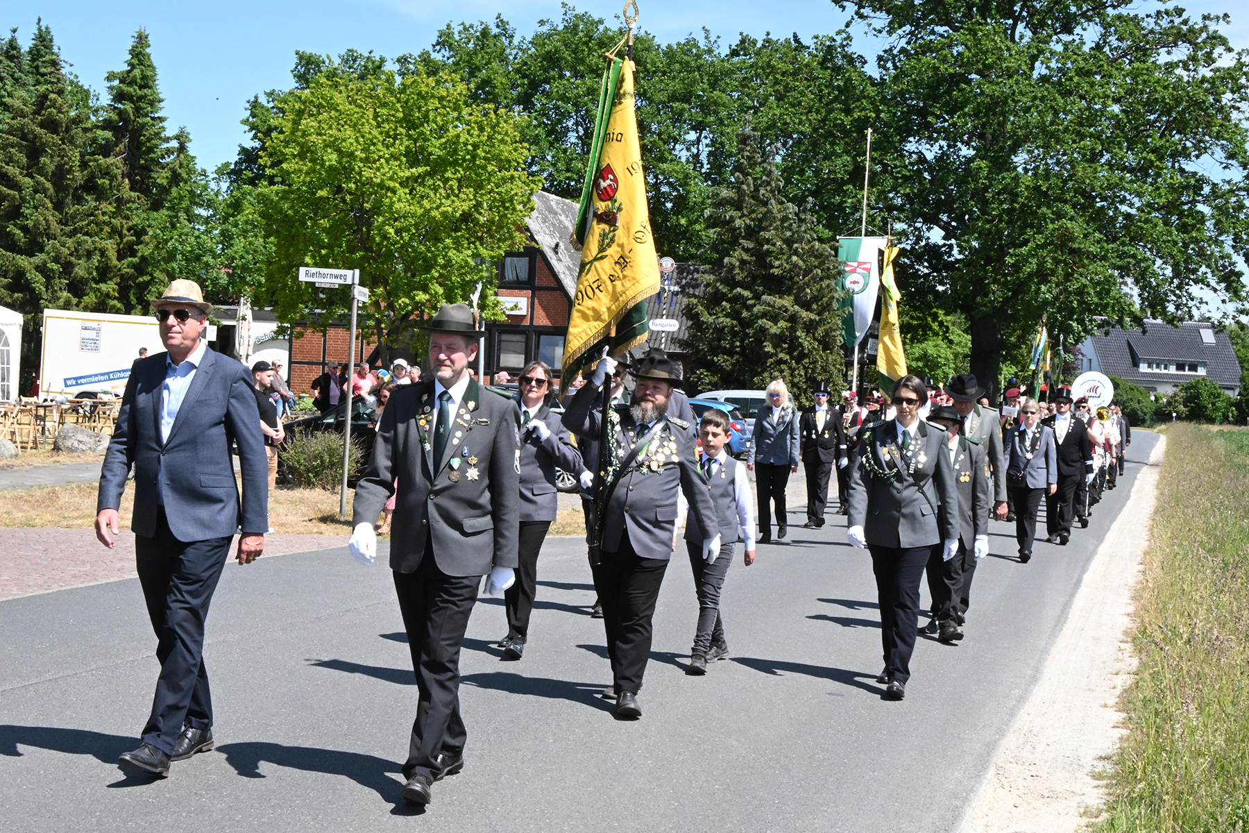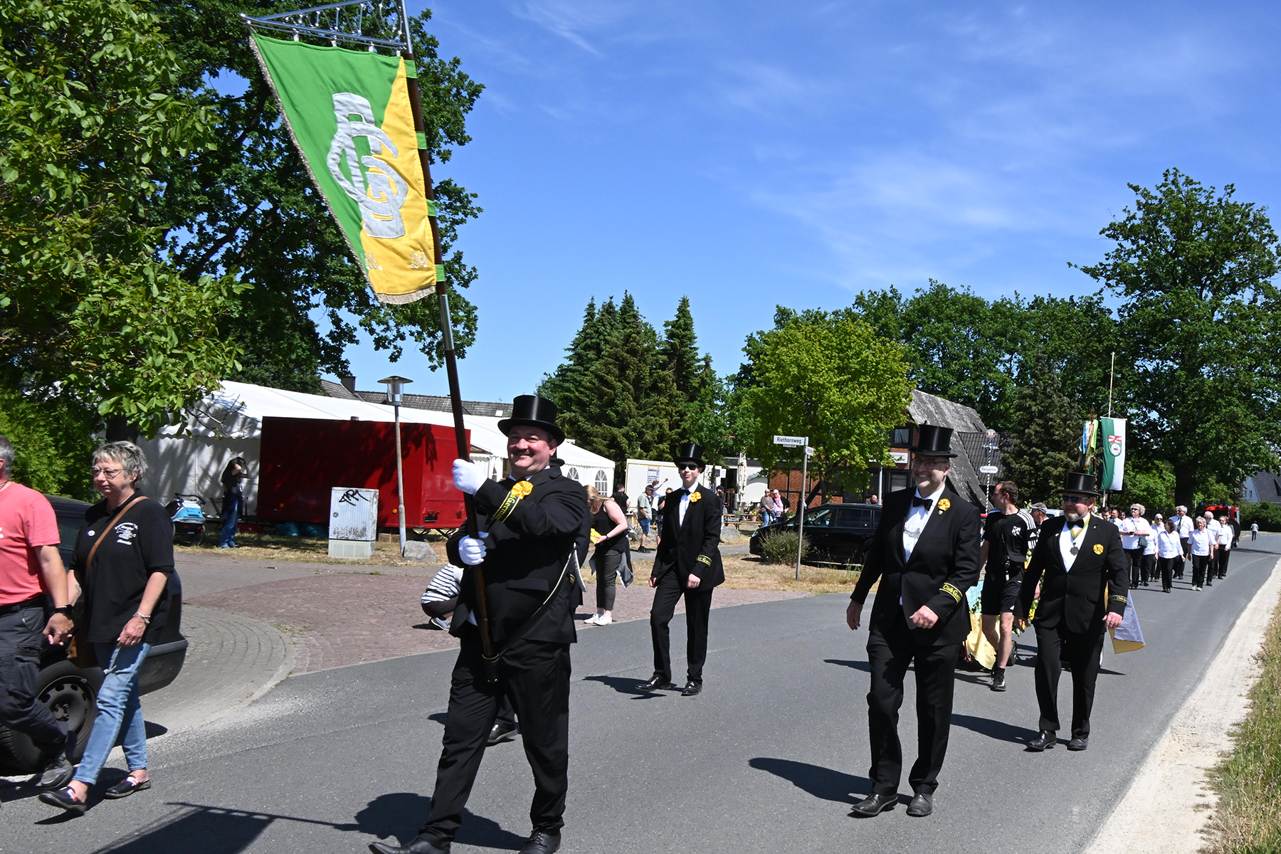 Anschließend ging es für die Schützen zum Anbringen der Königsscheibe. Unter der musikalischen Begleitung des Fanfarencorps "Wikinger" Burgdorf und Absicherung durch Mitglieder der Feuerwehren aus Dachtmissen und Weferlingsen ging es für die Schützen mit befreundeten Vereinen durch den Ort.