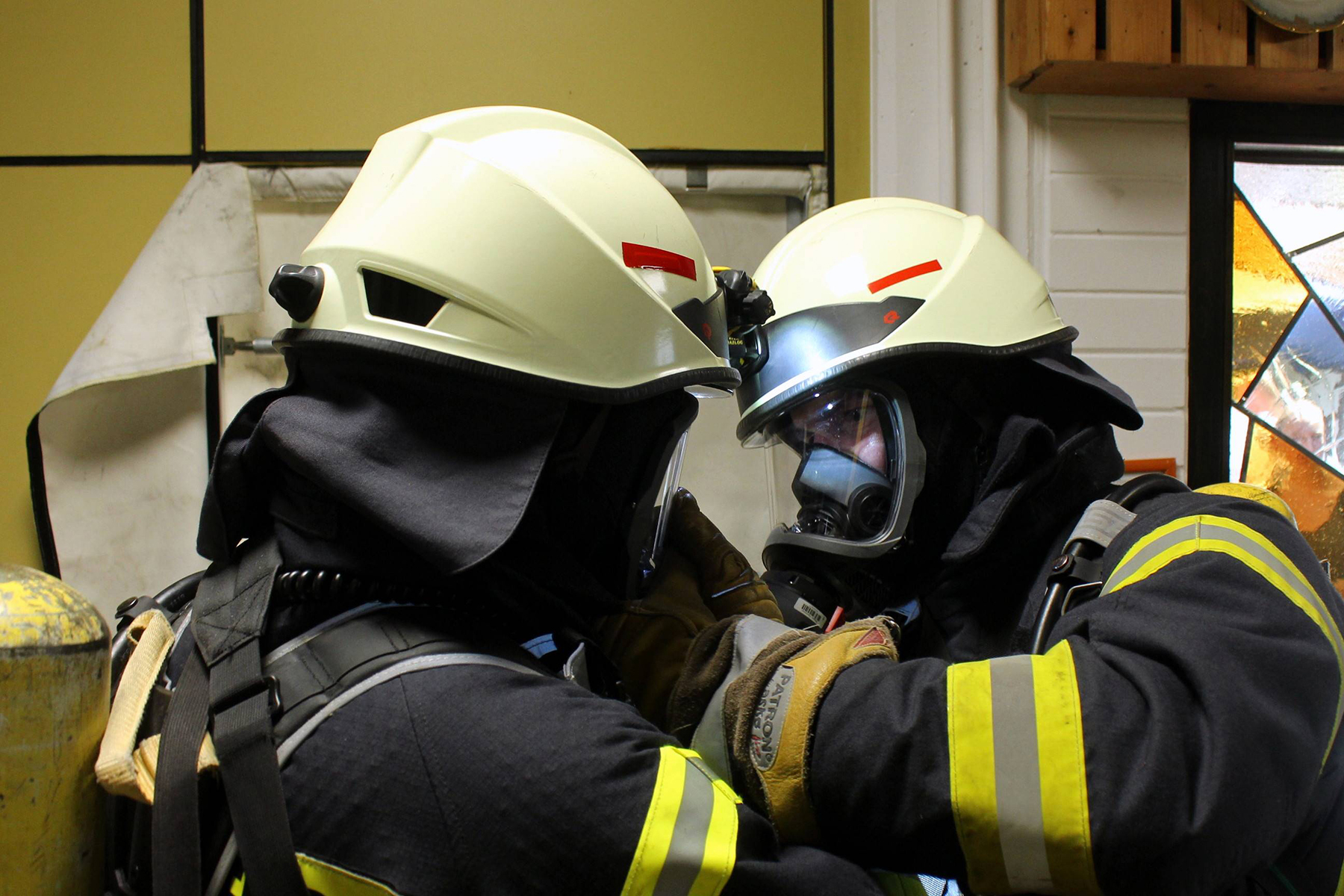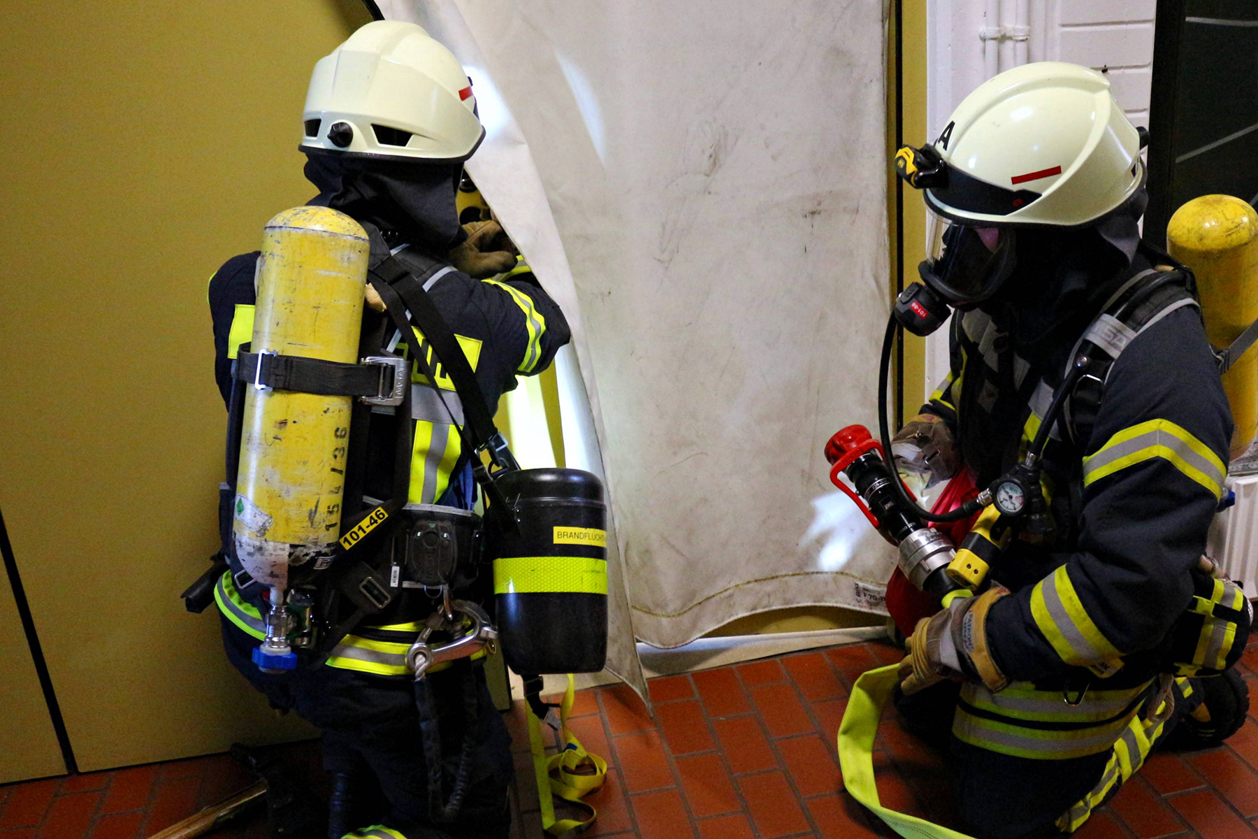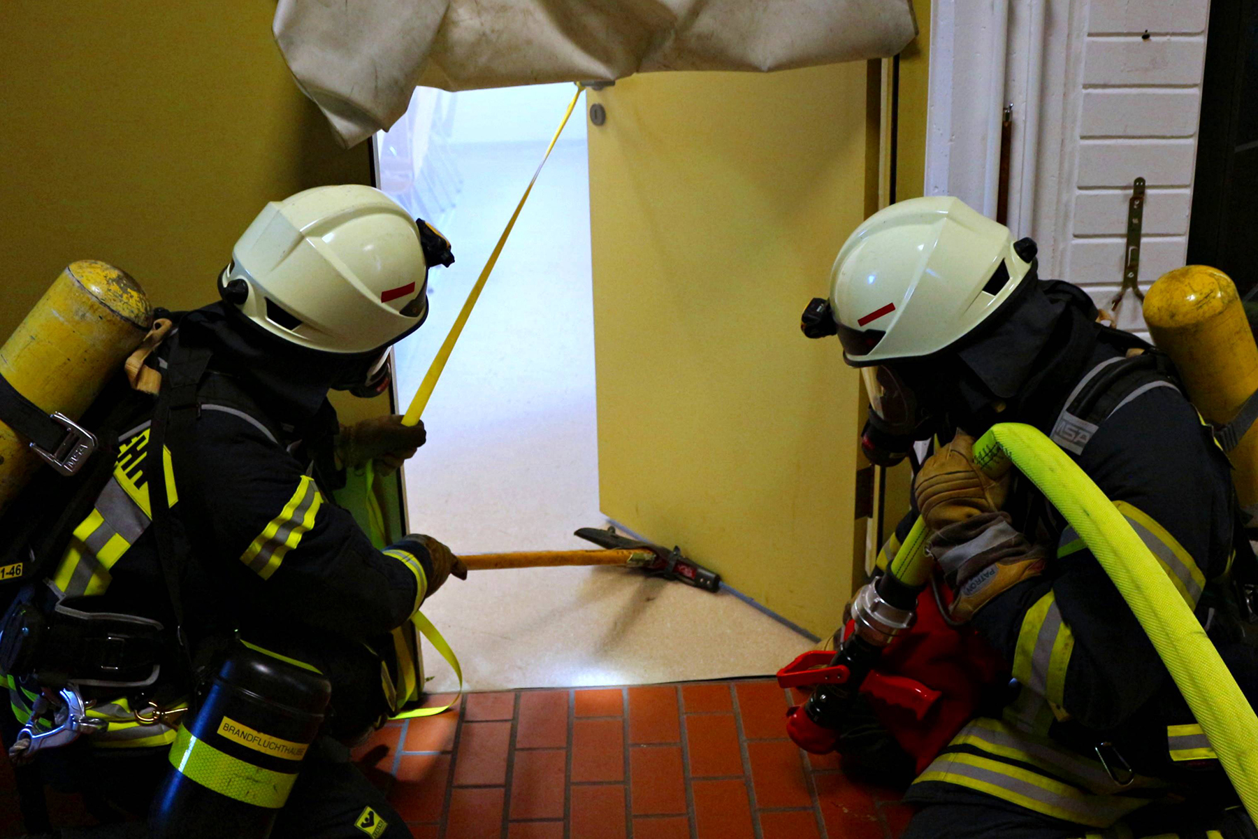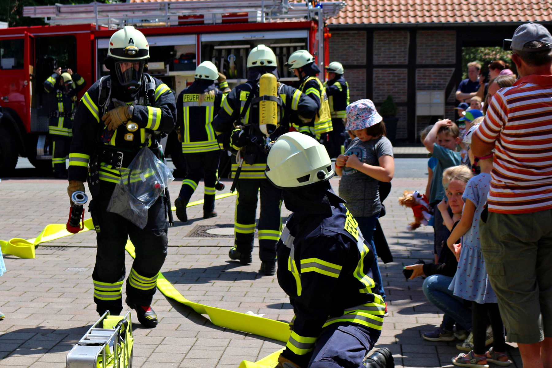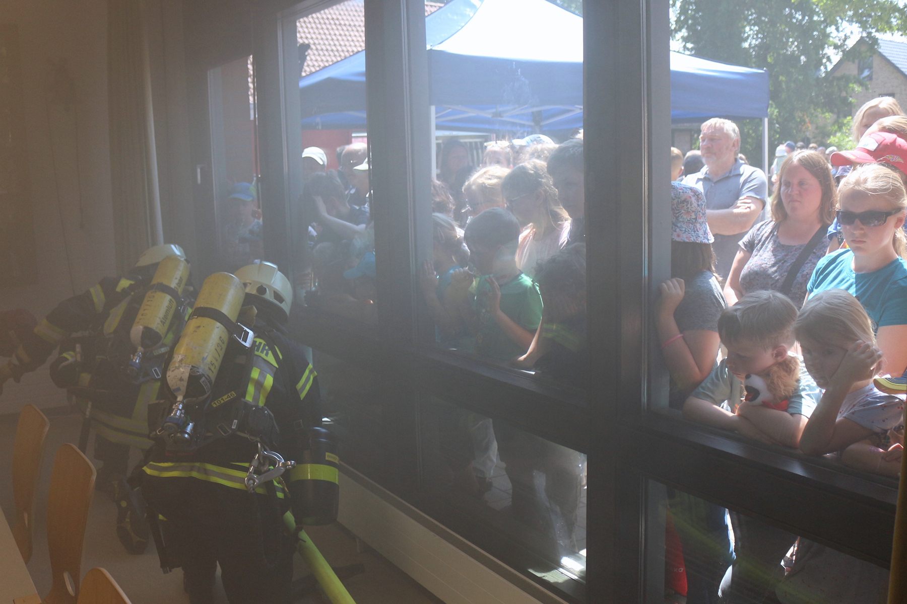 Wie anstrengend ein Feuerwehreinsatz sein kann, wurde den Besuchern vor Augen geführt, als Ortsbrandmeister Karsten Lübbe eine Brandsimulation ankündigte und kommentierte. Der Auftrag lautete, eine Person aus einem verrauchten Raum zu bergen. Zwei Kameraden unter vollem Atemgeräteschutz näherten sich im "verqualmten" Unterrichtsraum dem zu bergenden Dummy, während sich die Besucher draußen ihre Nasen an den Fenstern plattdrückten. Eine weitere Übung, die die Rettung einer Person aus einem Auto nach einem Verkehrsunfall zeigte, verfolgten die Besucher ebenso.