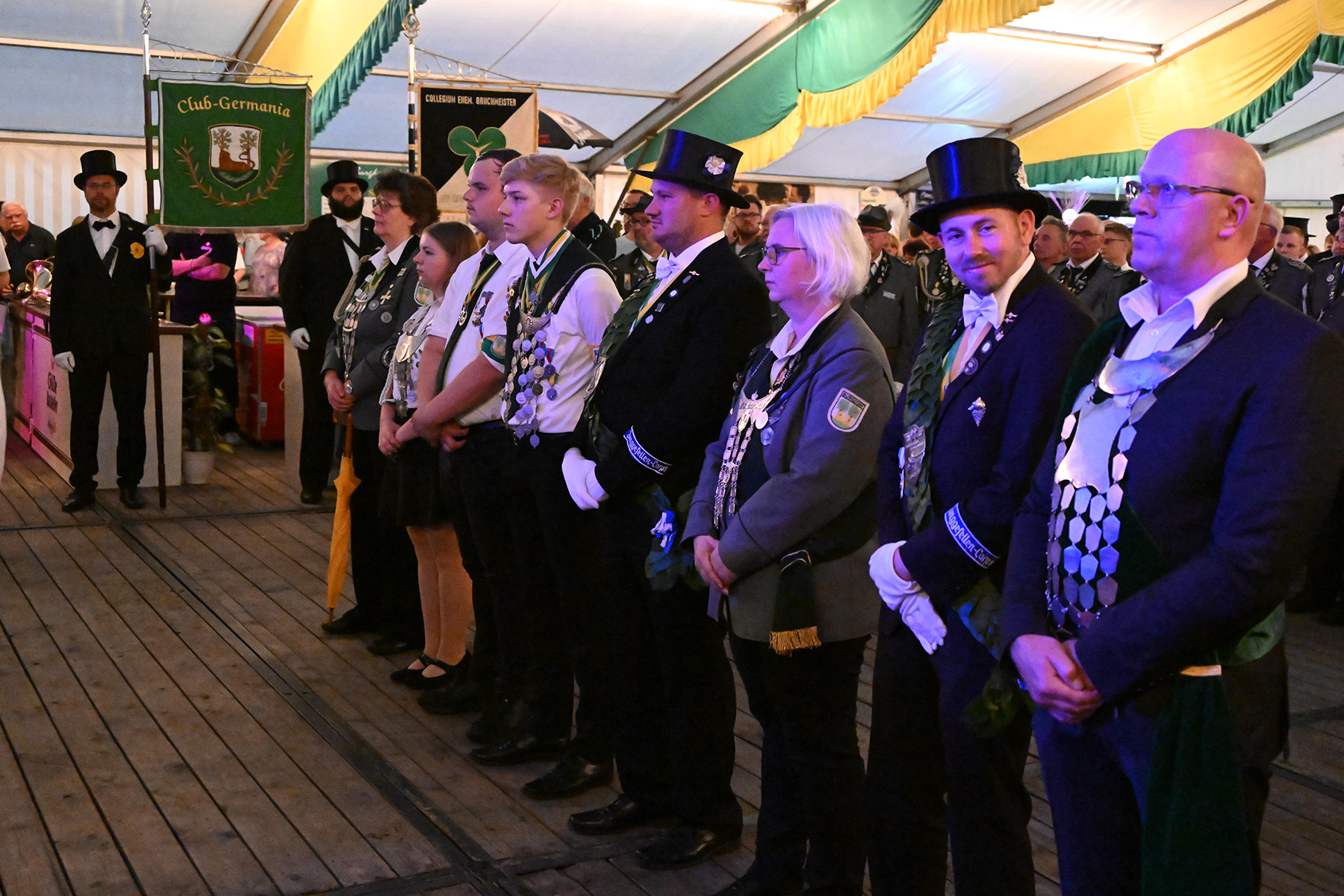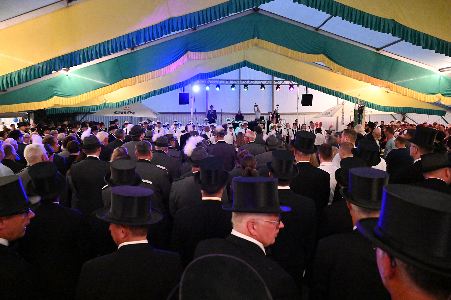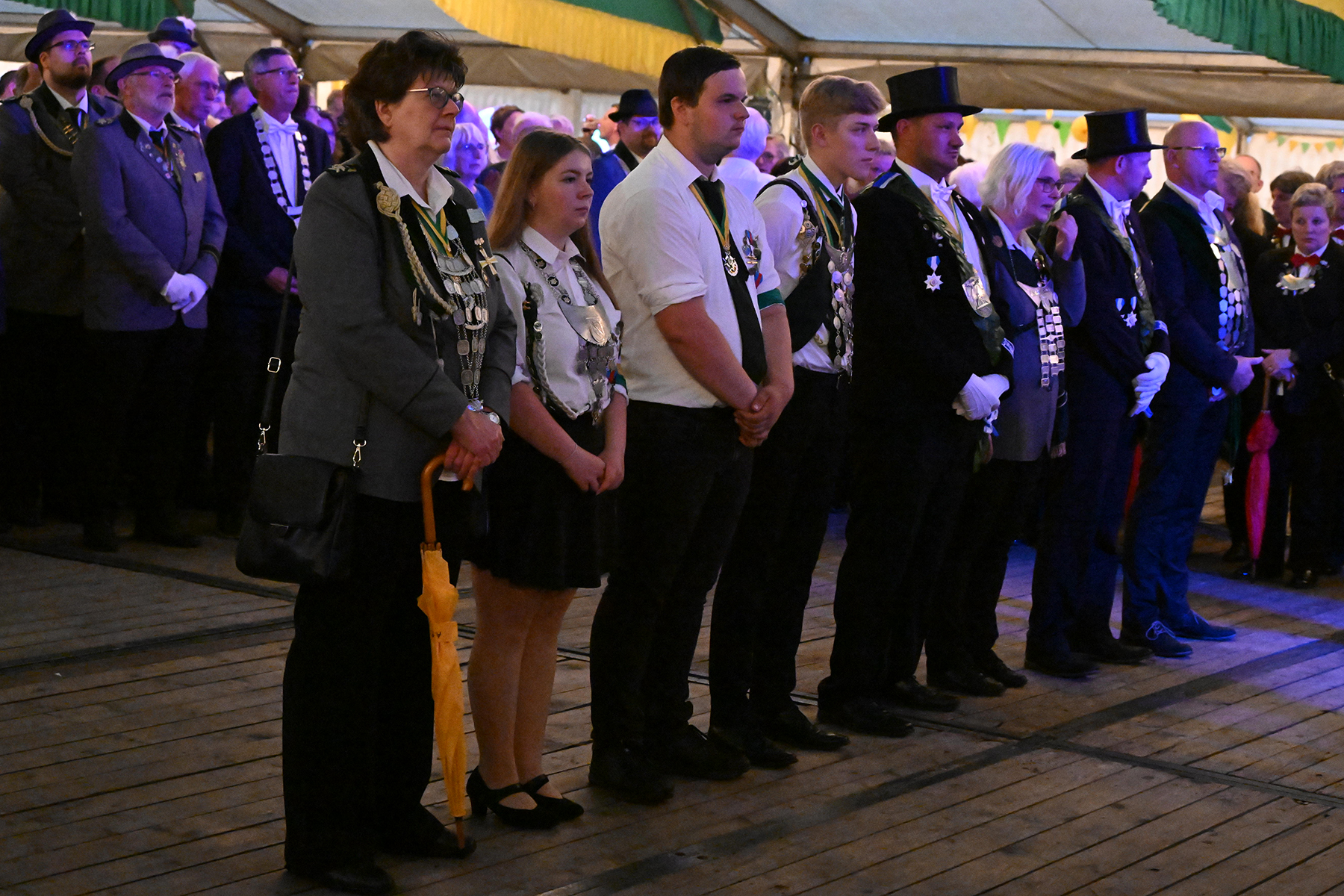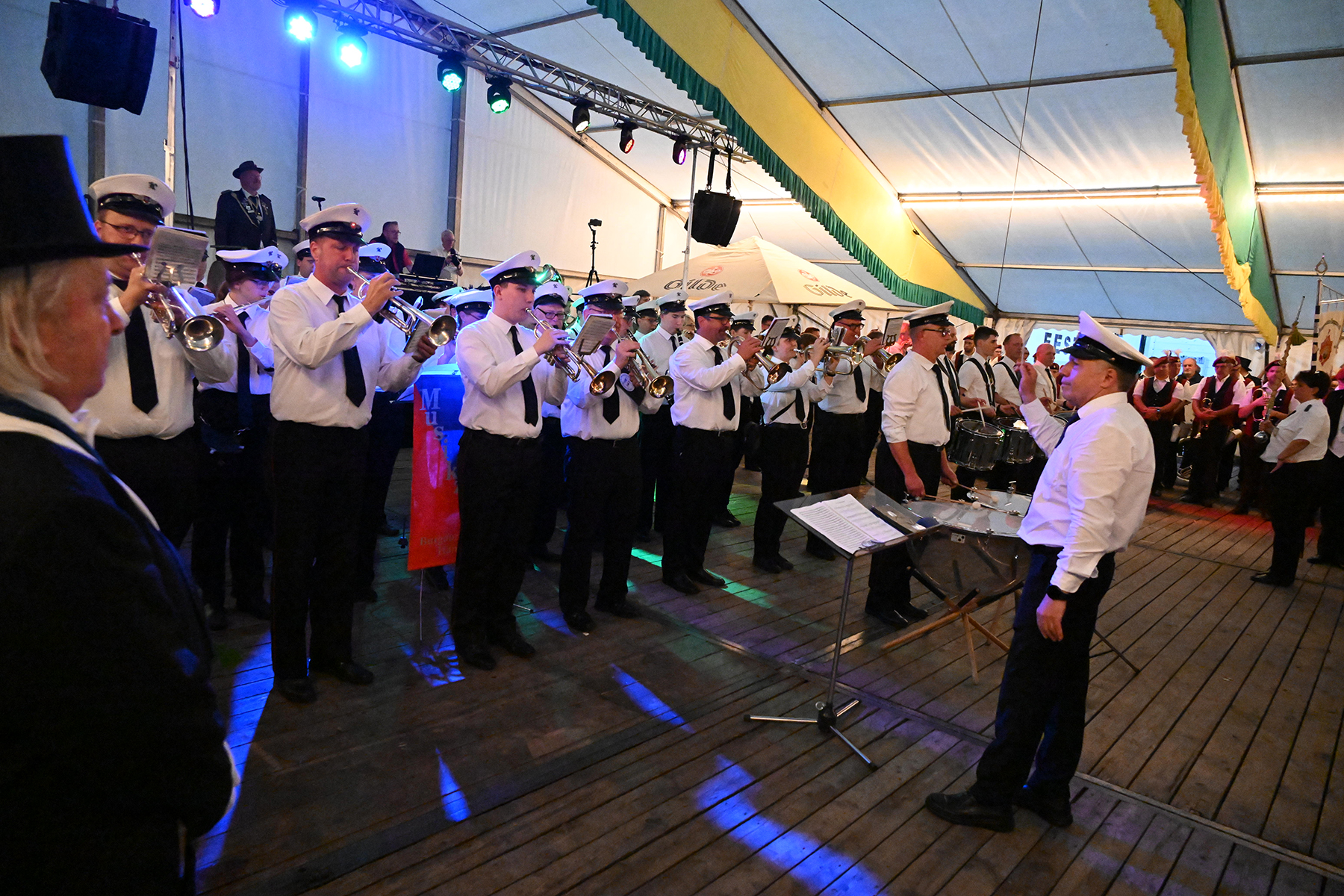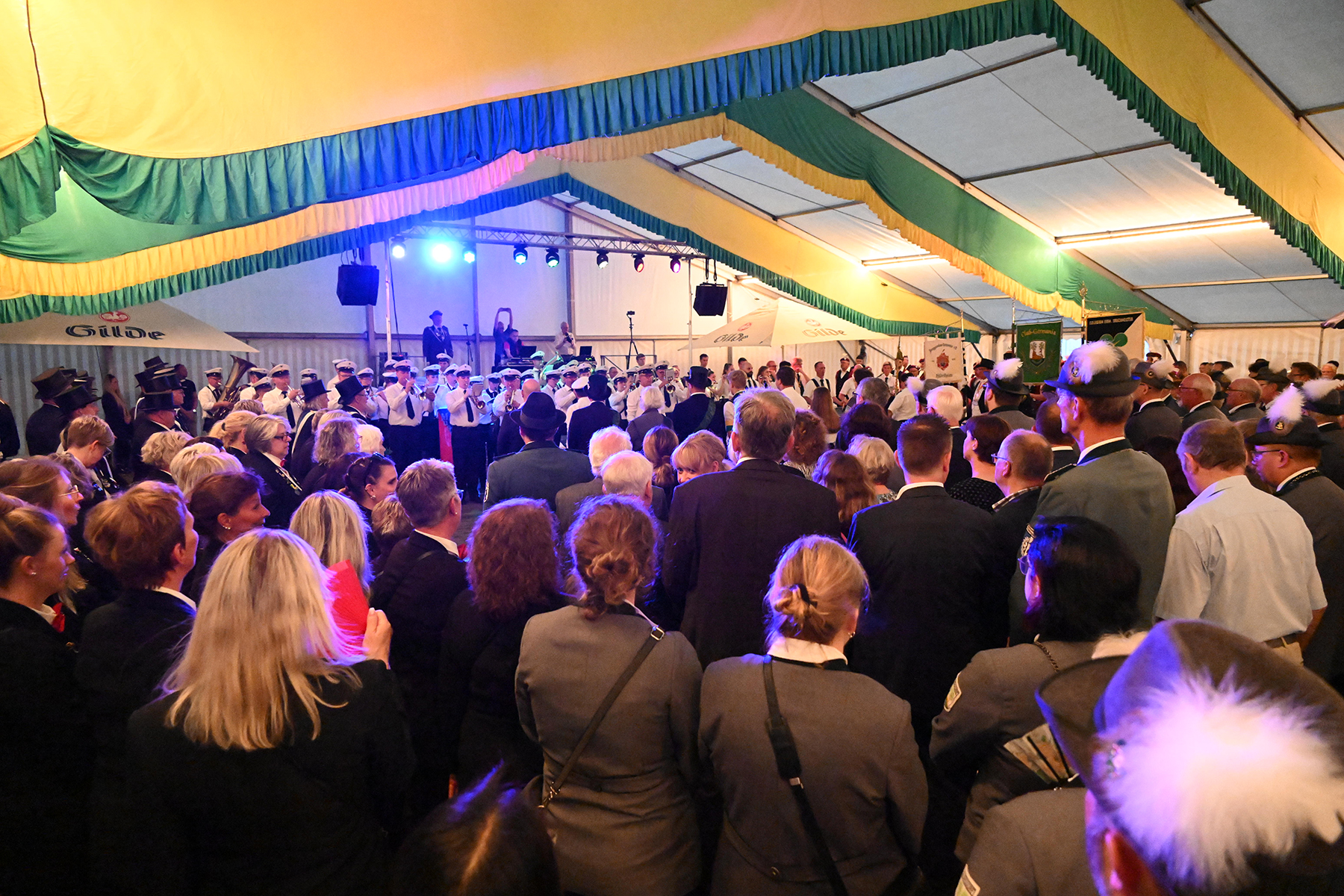 Vor dem Rathaus I wäre der Große Zapfenstreich zu Ehren der Majestäten von 2022 sicherlich schöner gewesen, doch aufgrund des Unwetters haben die Burgdorfer Schützen den Festakt in Festzelt verlegt. Und sollten damit kein unglückliches Händchen beweisen haben. Denn während es draußen Bindfäden regnete und Blitz Donner zu vernehmen waren, war es im Festzelt zwar schwül-warm, jedoch immerhin trocken.