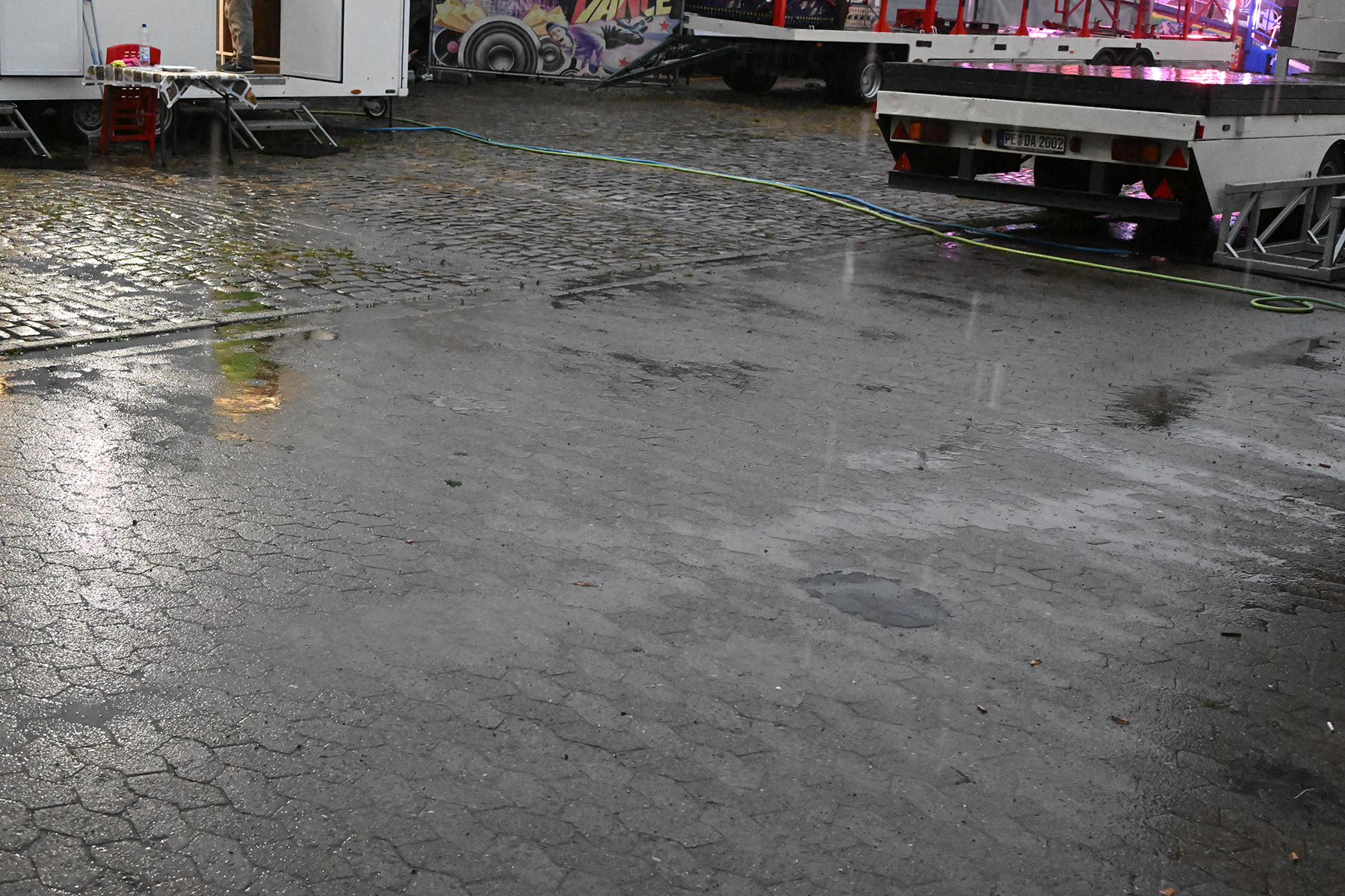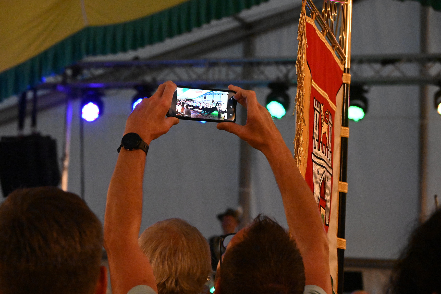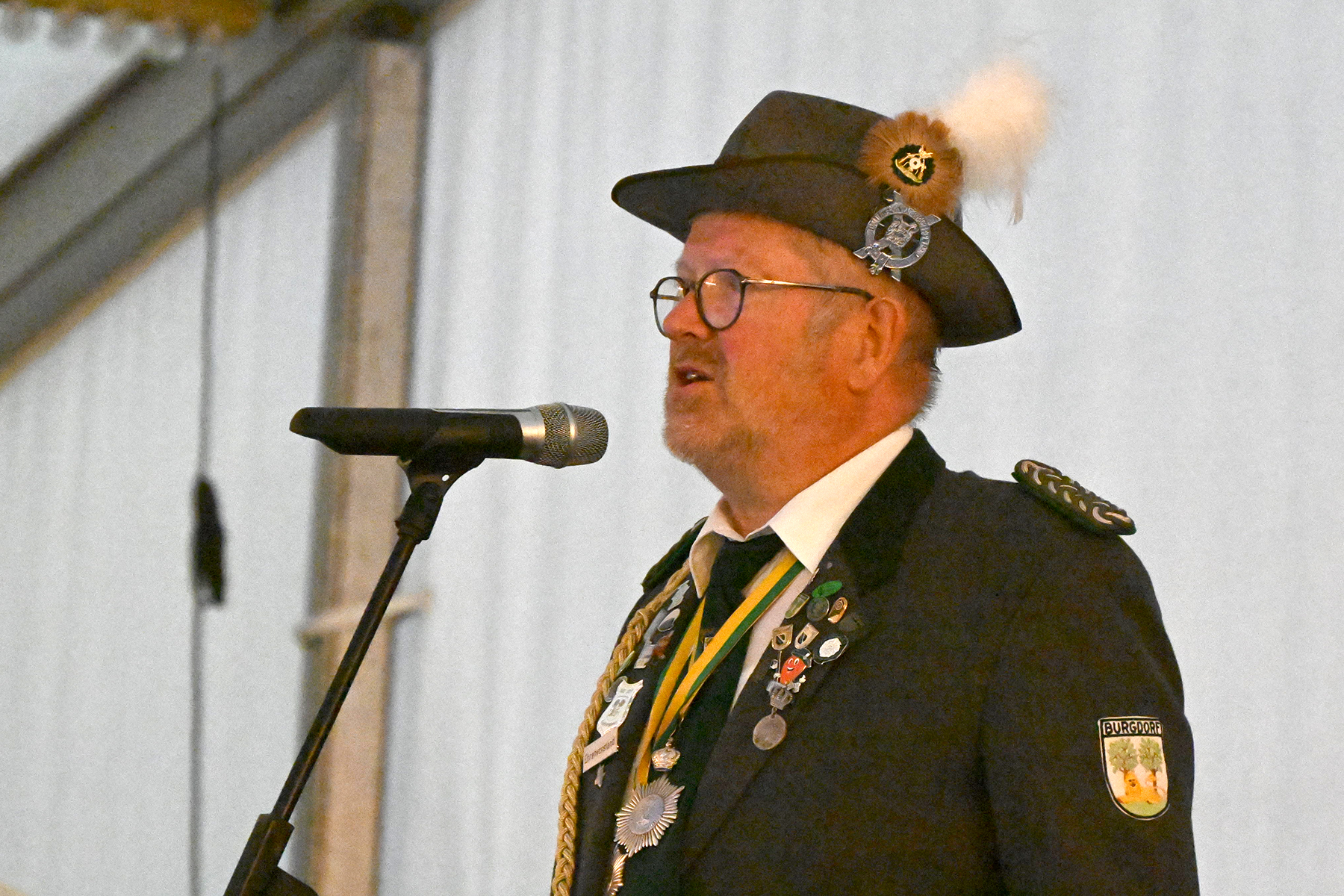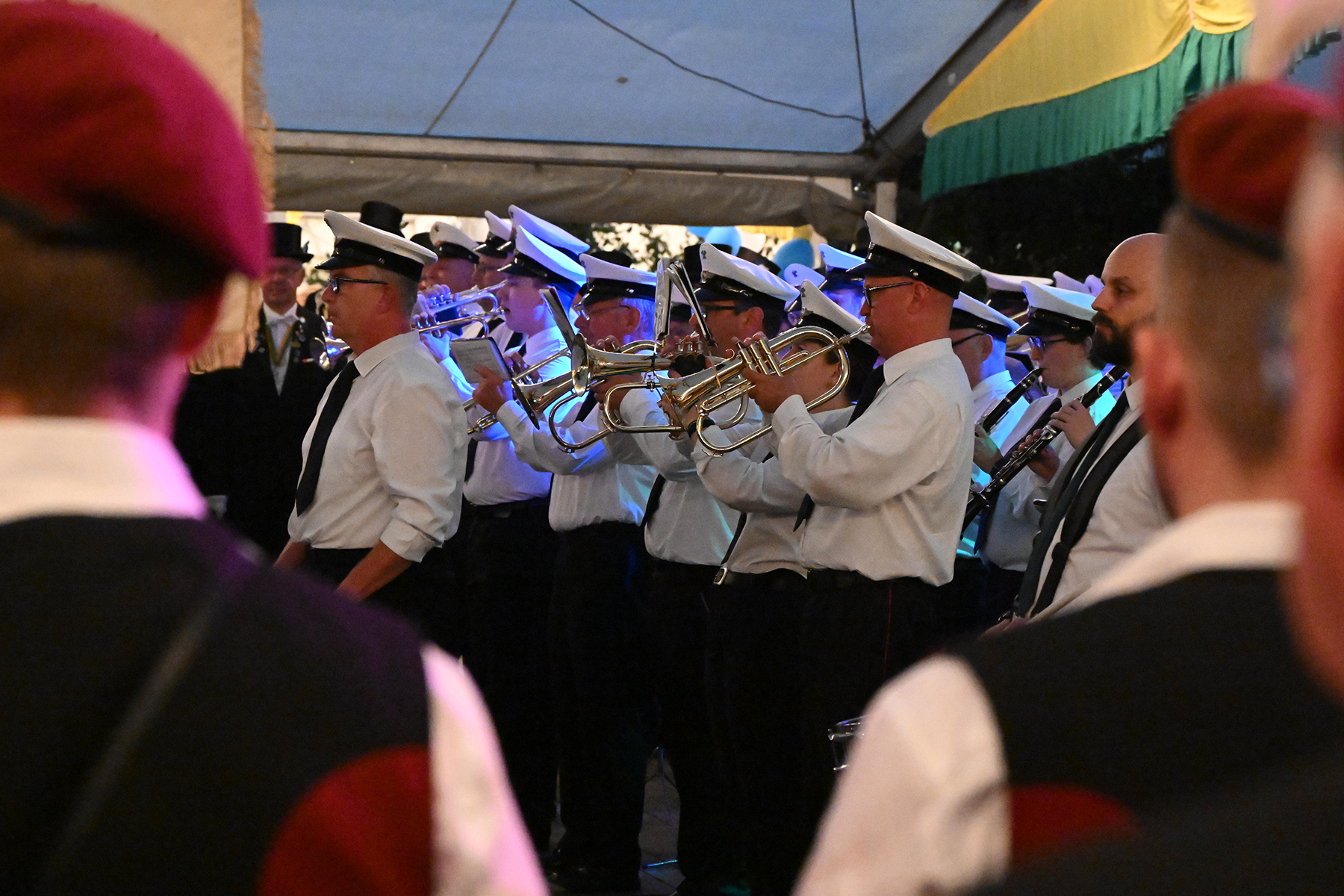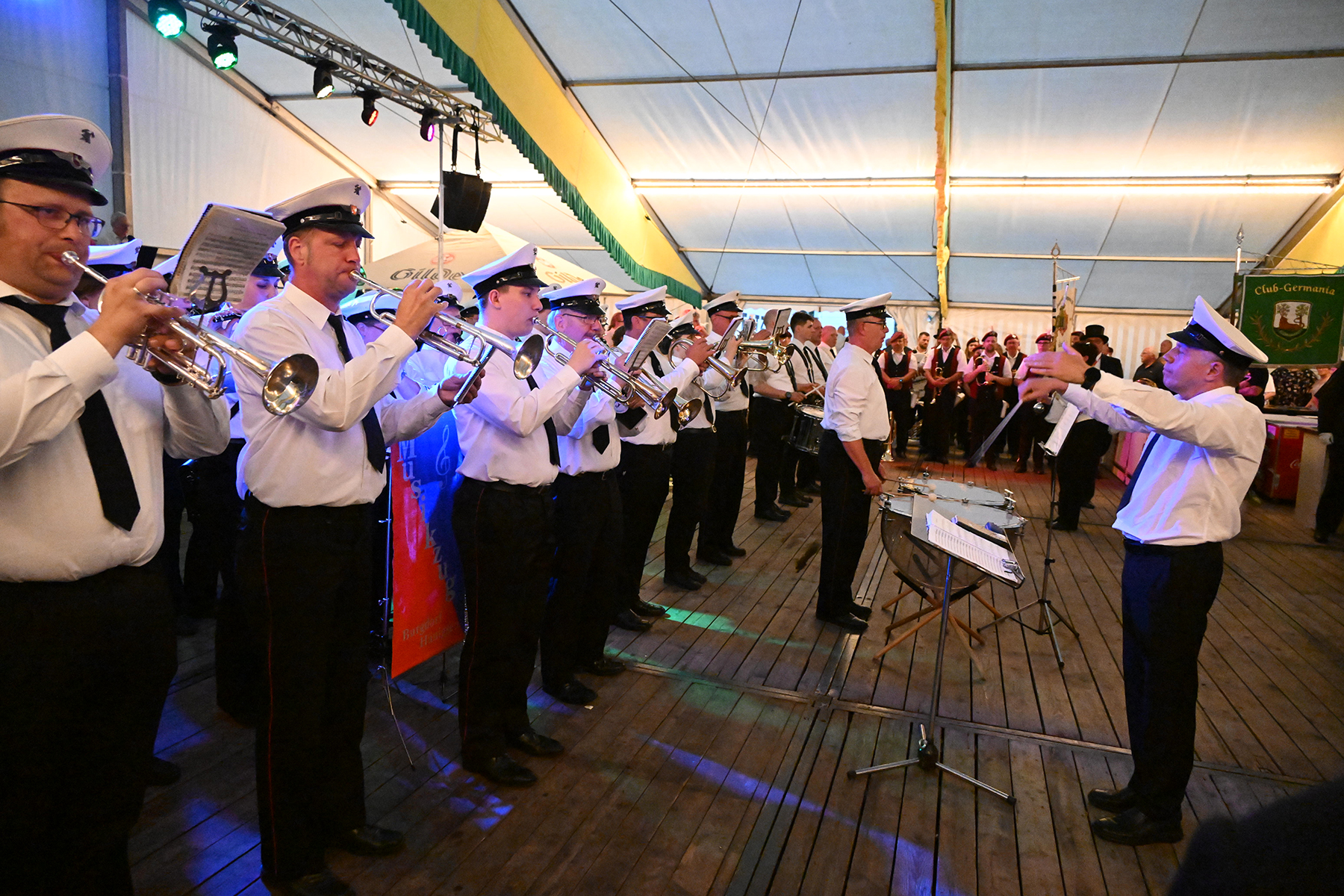 Vor dem Rathaus I wäre der Große Zapfenstreich zu Ehren der Majestäten von 2022 sicherlich schöner gewesen, doch aufgrund des Unwetters haben die Burgdorfer Schützen den Festakt in Festzelt verlegt. Und sollten damit kein unglückliches Händchen beweisen haben. Denn während es draußen Bindfäden regnete und Blitz Donner zu vernehmen waren, war es im Festzelt zwar schwül-warm, jedoch immerhin trocken.