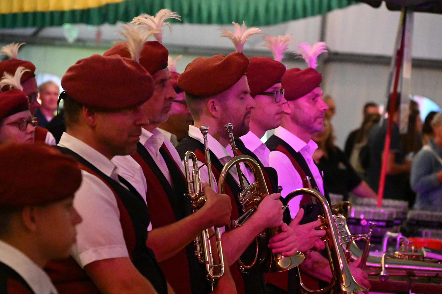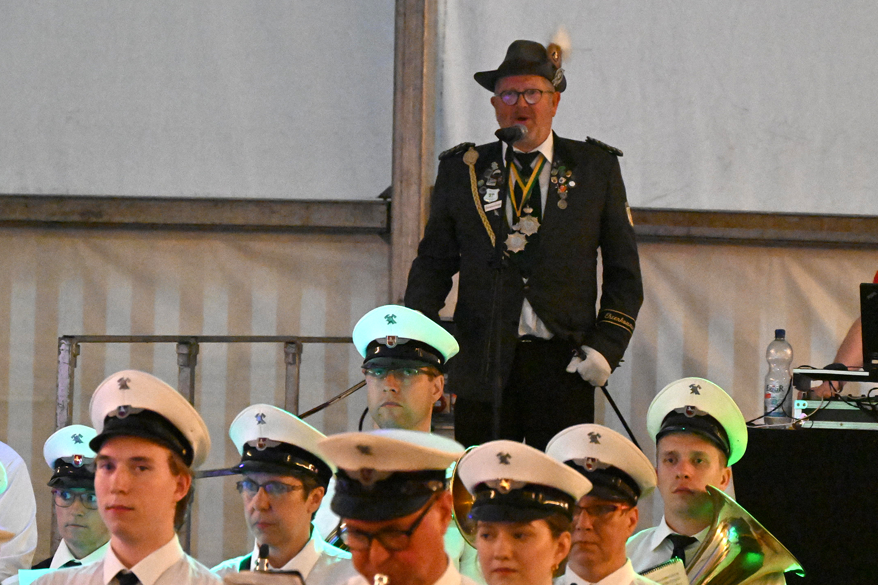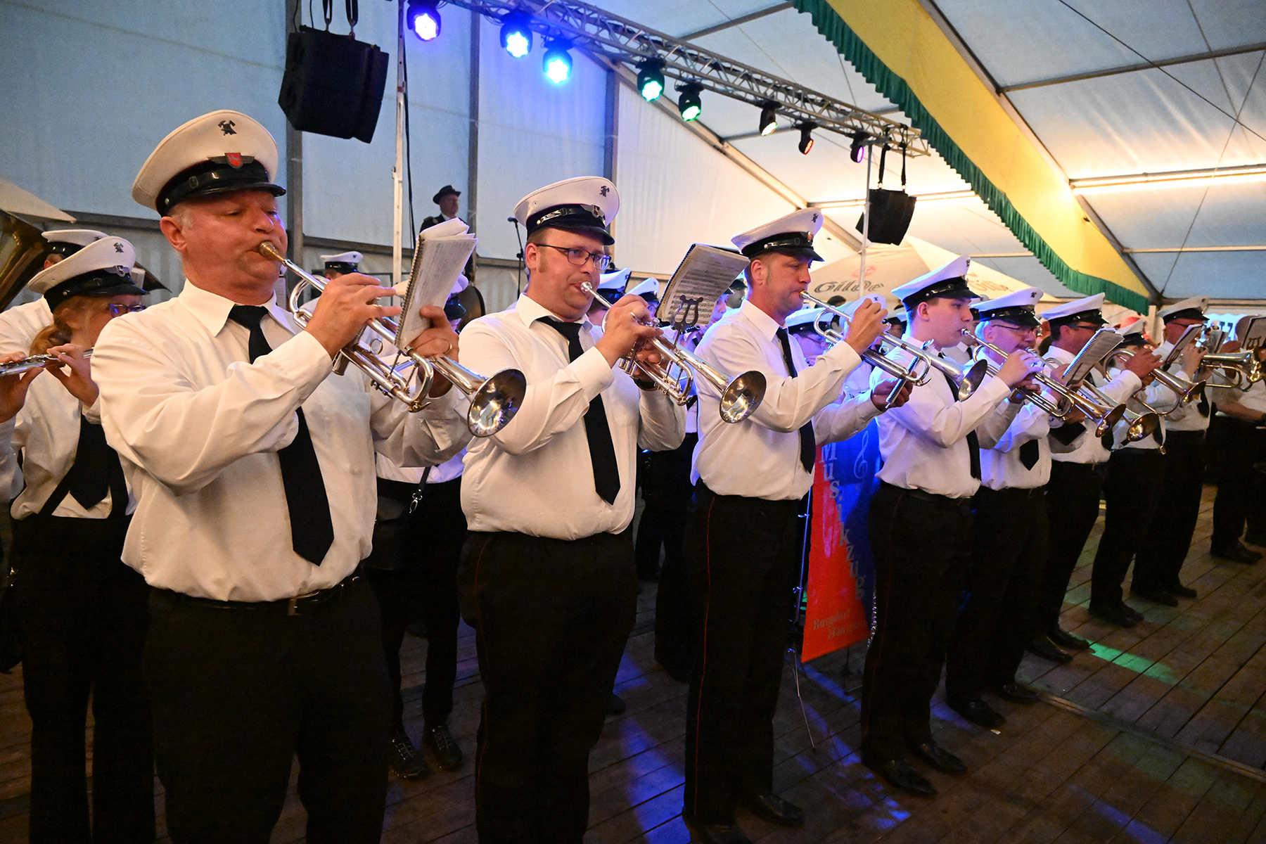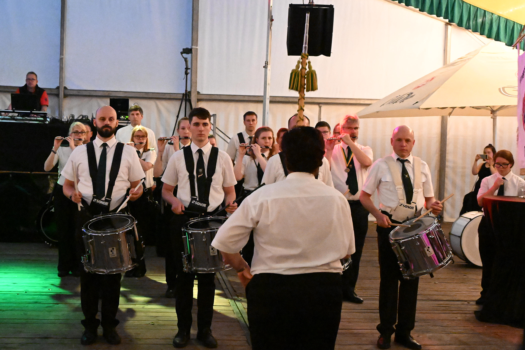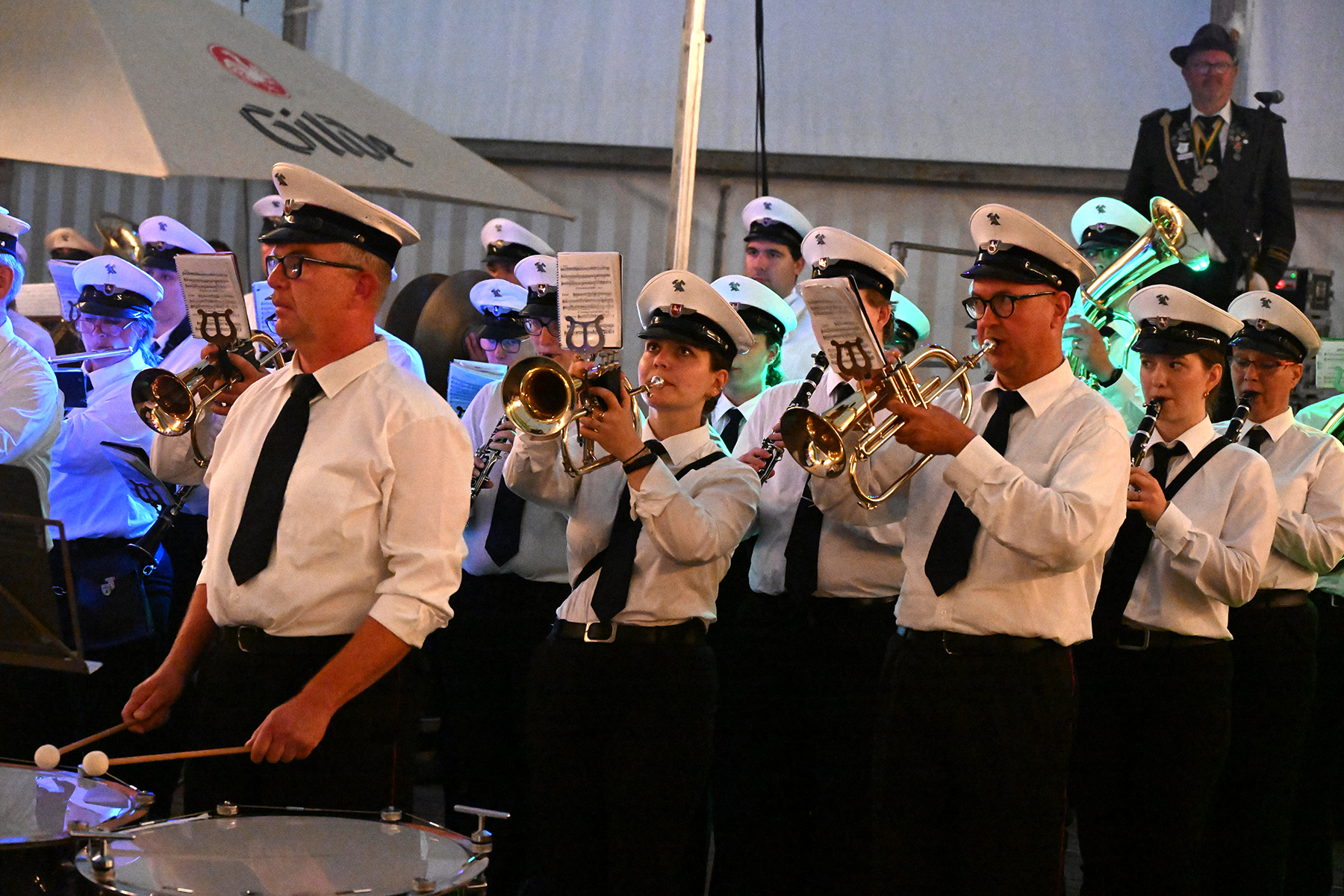 Und ein weiterer Teil wich vom eigentlichen Plan ab: Da der neue Kommandeur Carsten Hoffmann verhindert war, übernahm in diesem Jahr der Ehrenkommandeur Rolf Hoppe, der im vergangenen Jahr eigentlich seinen letzten Auftritt hatte. So leitete er durch den Großen Zapfenstreich, nicht ohne die Besucher des Festzeltes darauf hinzuweisen, dass der große Zapfenstreich ein Festakt ist und um entsprechende Ruhe bat.