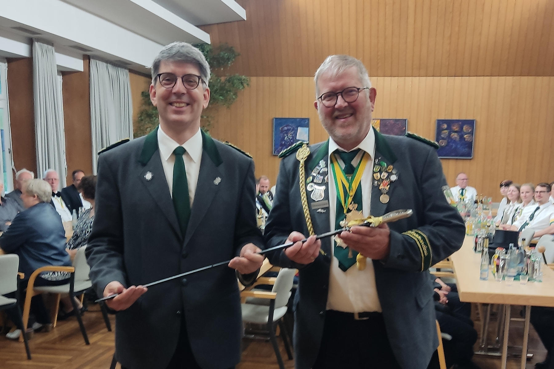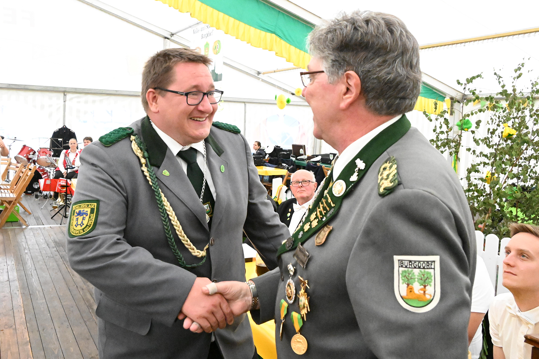 Zunächst stand am Morgen der Empfang im Burgdorfer Schloss auf dem Programm, bei dem die Burgdorfer Schützengesellschaft ihren neuen Kommandeur ins Amt hob. Carsten Hoffmann erhielt den Kommandeurs-Degen von Rolf Hoppe, der das Amt 27 Jahre und einen Tag ausgeübt hatte.