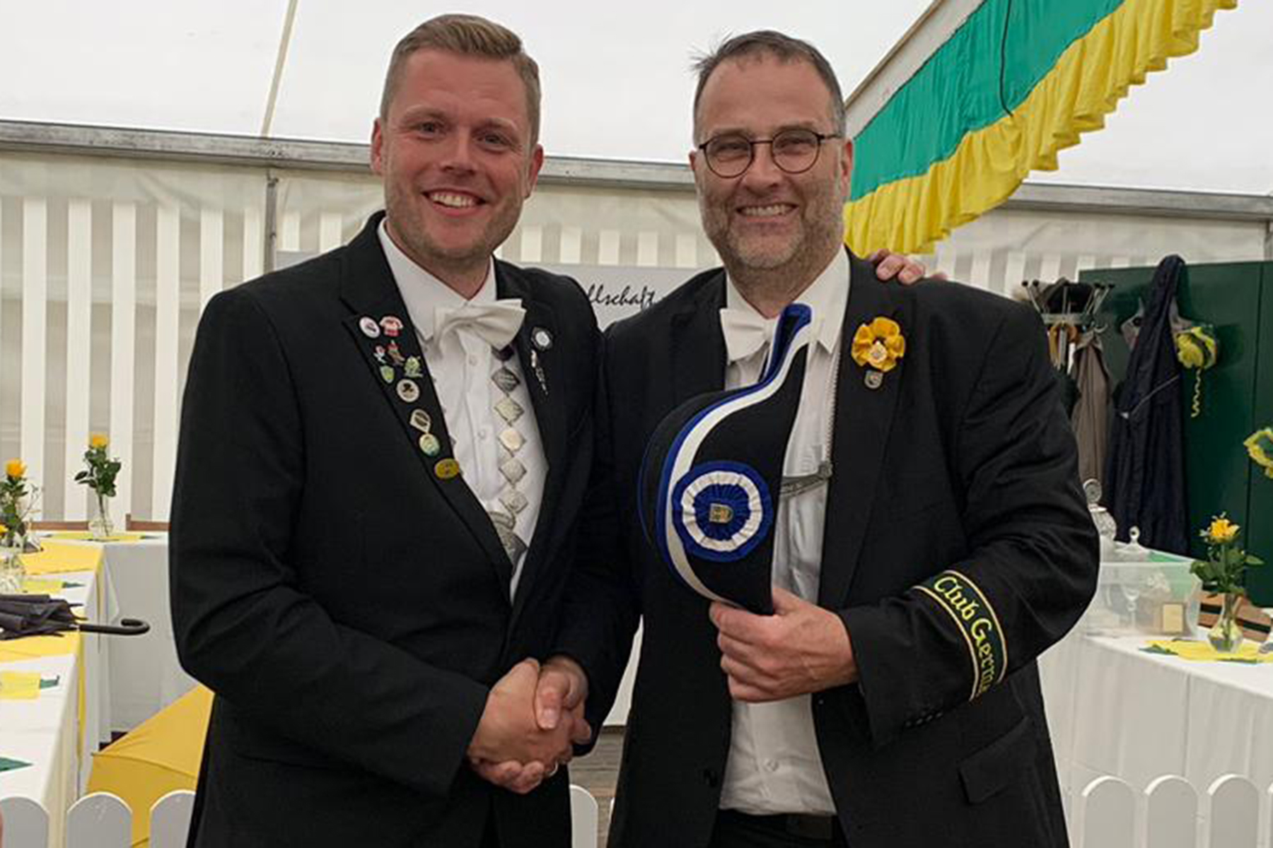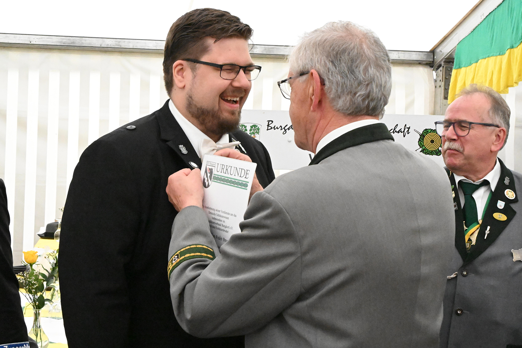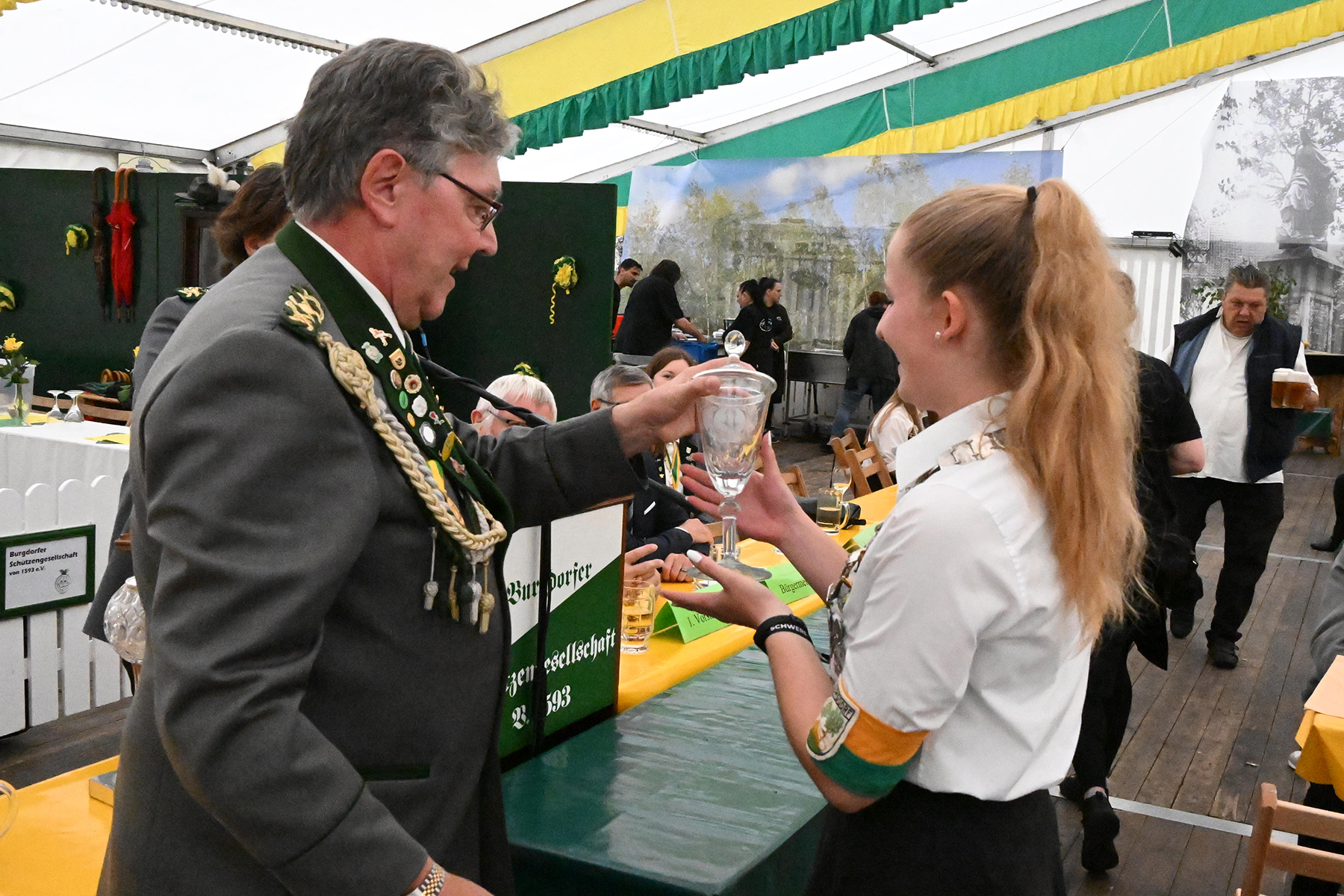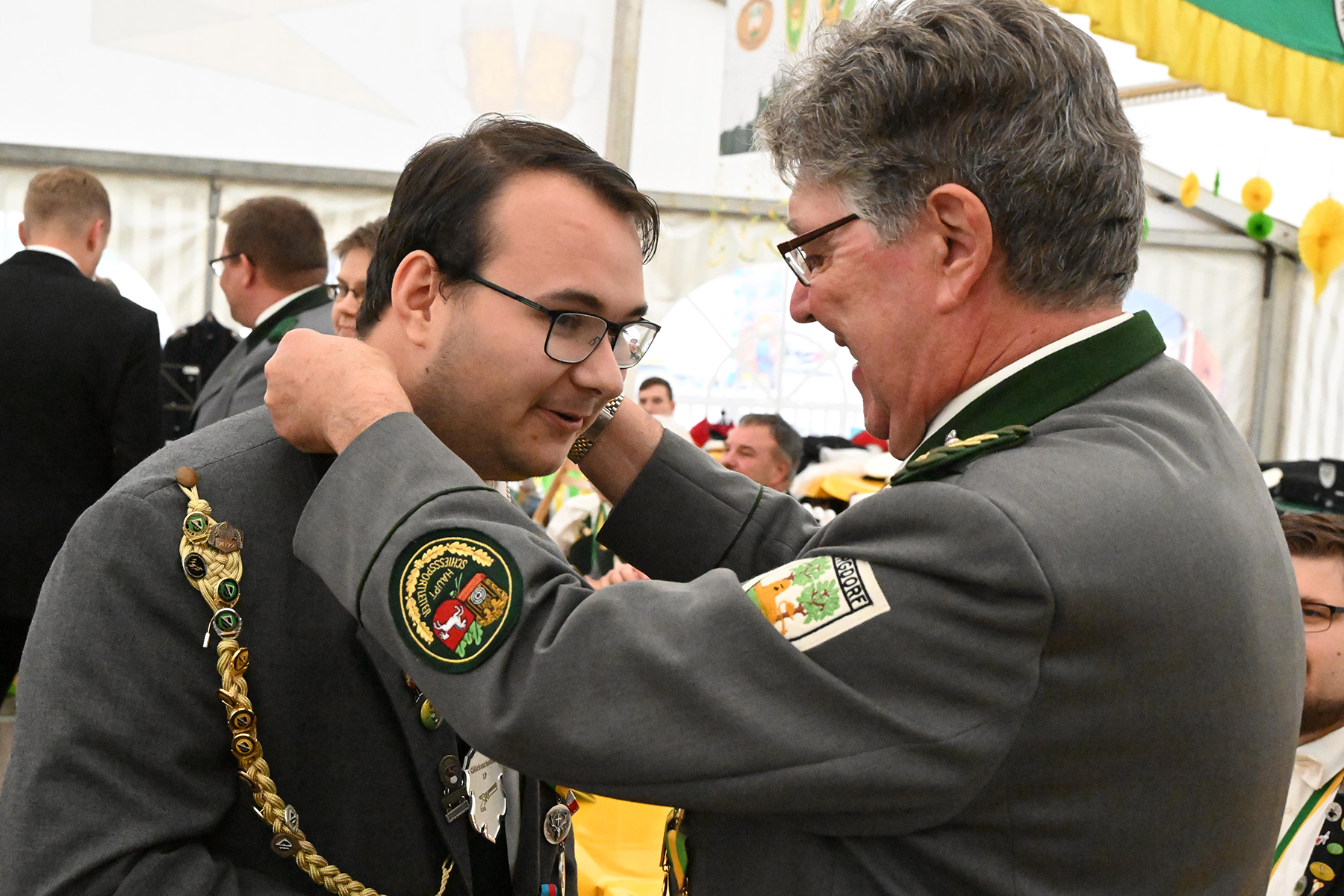 Zurück im Festzelt erhielt dann die Junggesellencorporation vom Club Germania ein Geschenk überreicht: Der neue Vorsitzende der Junggesellen, René Broka, erhielt ein Zweispitz. Neben dieser traditionelle Kopfbedeckung gehört auch ein Degen zum Outfit des Vorsitzenden. Zum ersten Mal ist dieser beim Festumzug am Sonntag zu sehen.