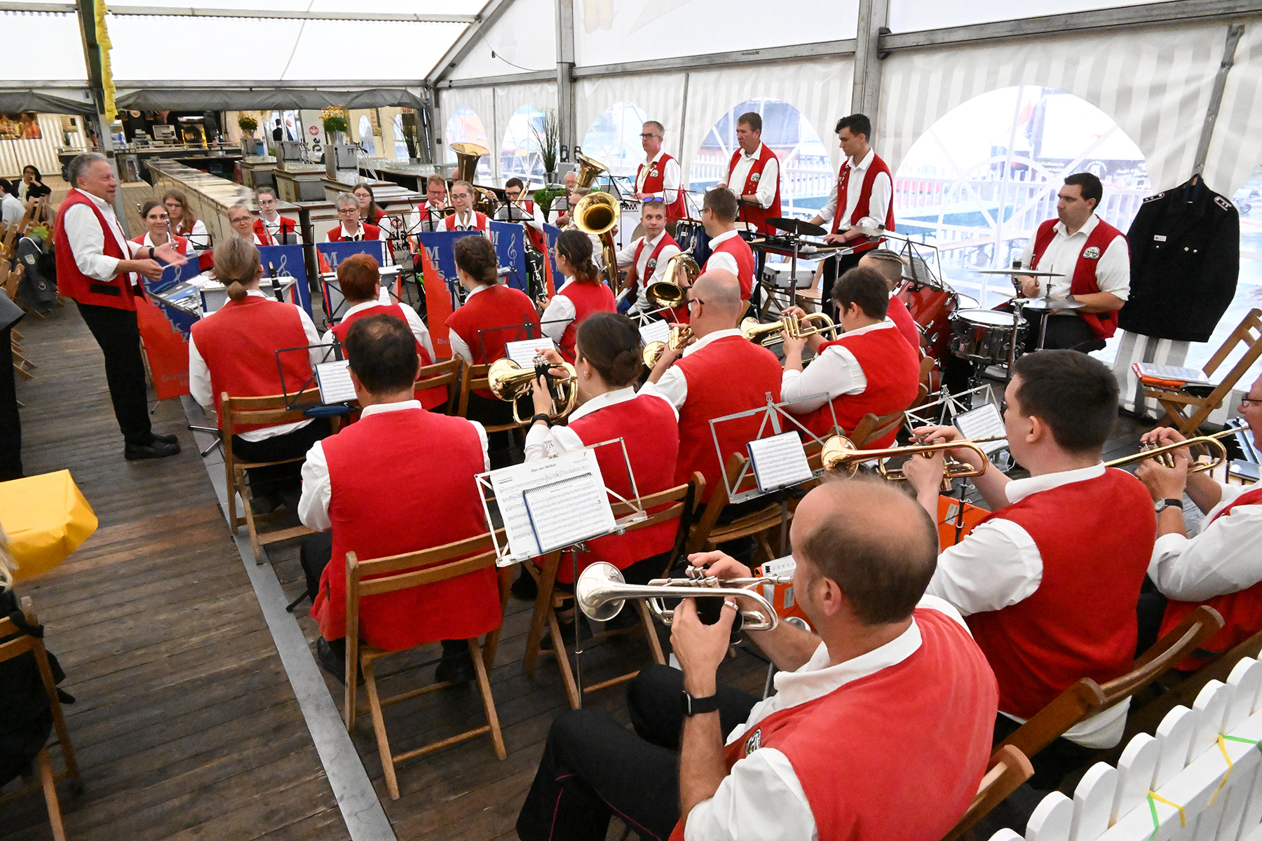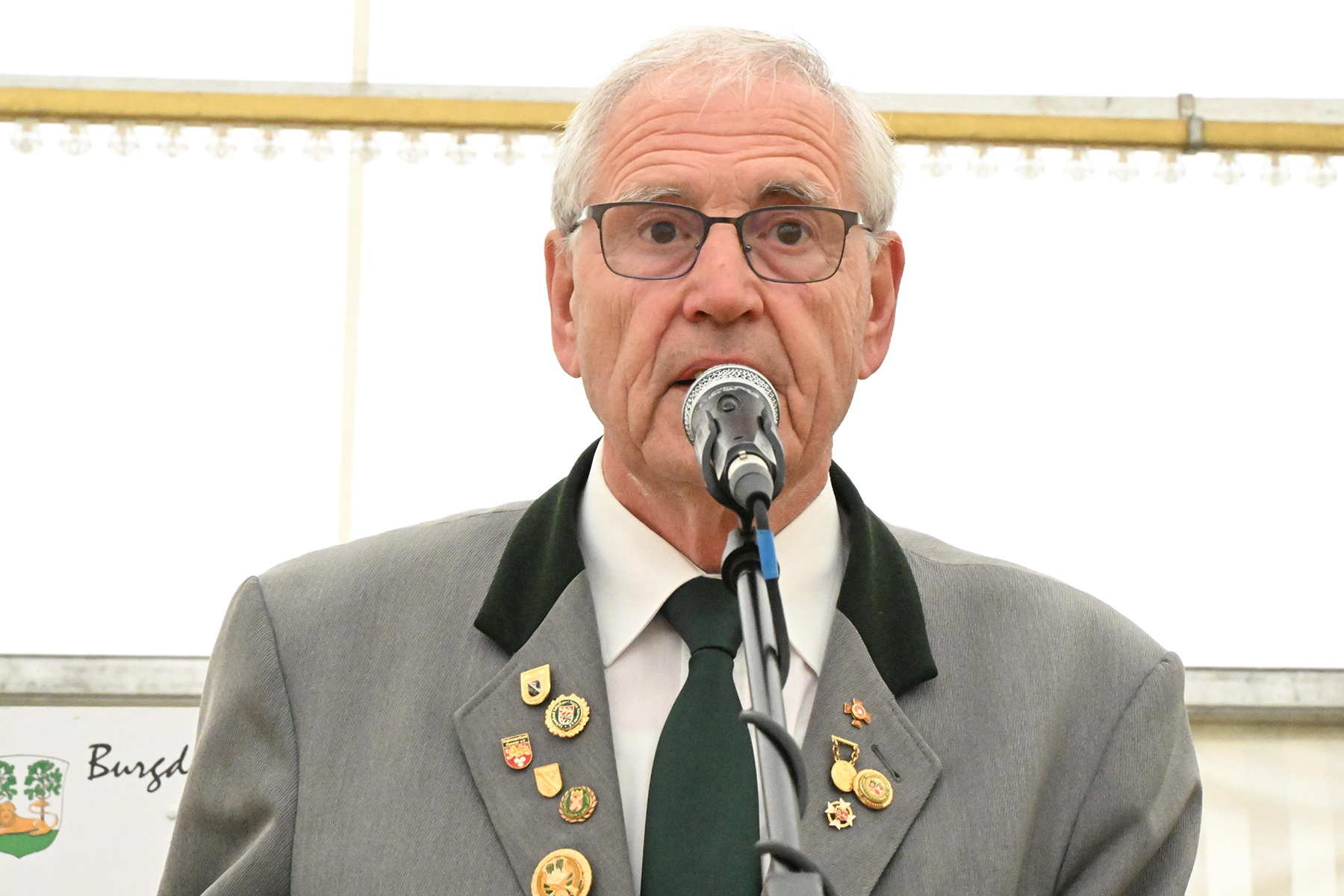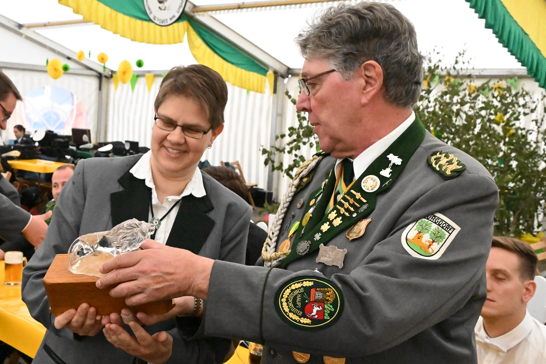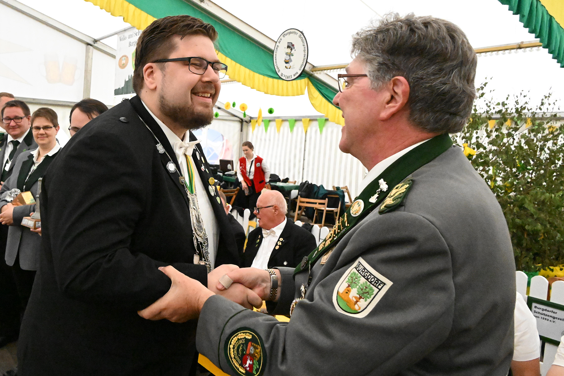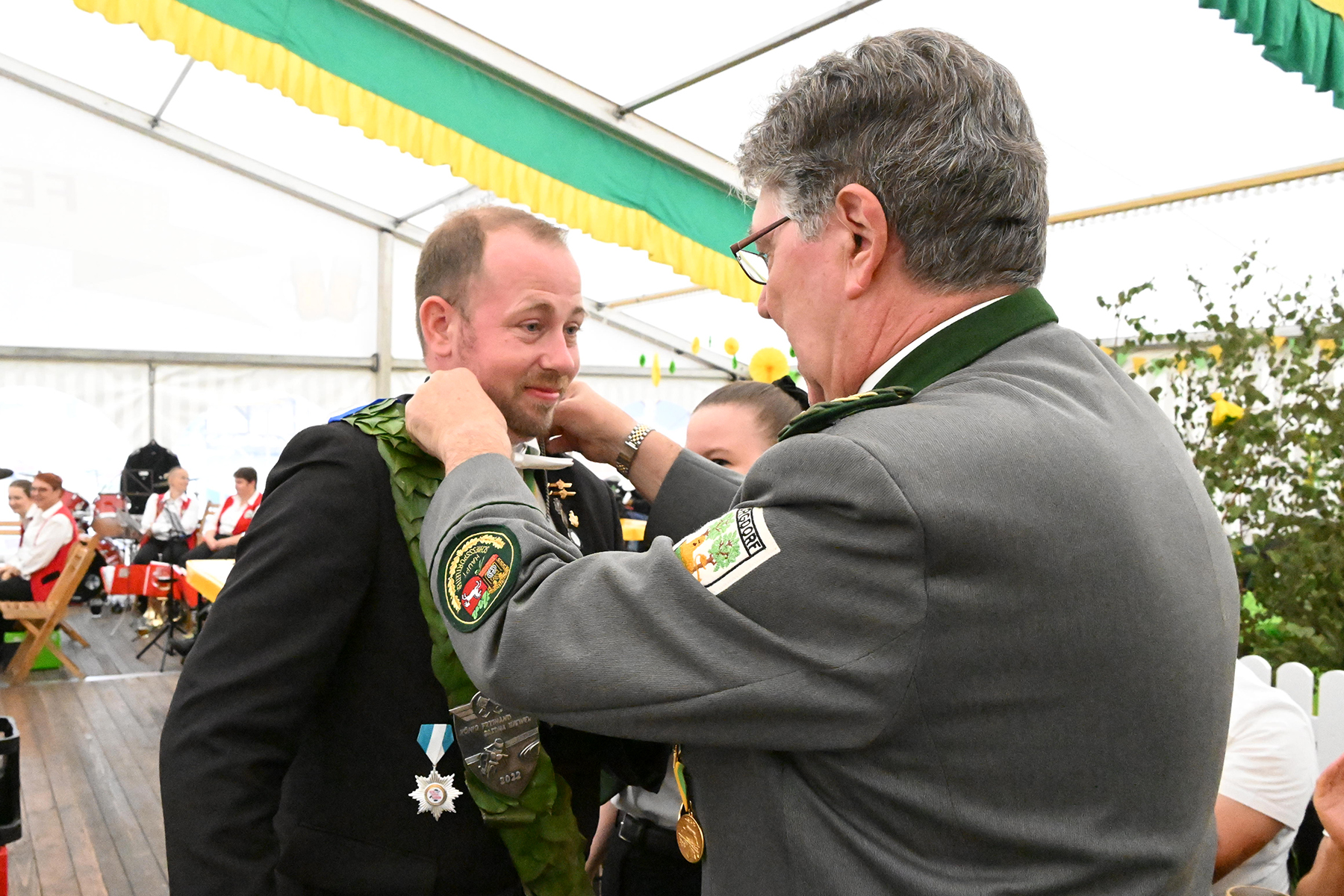 Zurück im Festzelt erhielt dann die Junggesellencorporation vom Club Germania ein Geschenk überreicht: Der neue Vorsitzende der Junggesellen, René Broka, erhielt ein Zweispitz. Neben dieser traditionelle Kopfbedeckung gehört auch ein Degen zum Outfit des Vorsitzenden. Zum ersten Mal ist dieser beim Festumzug am Sonntag zu sehen.