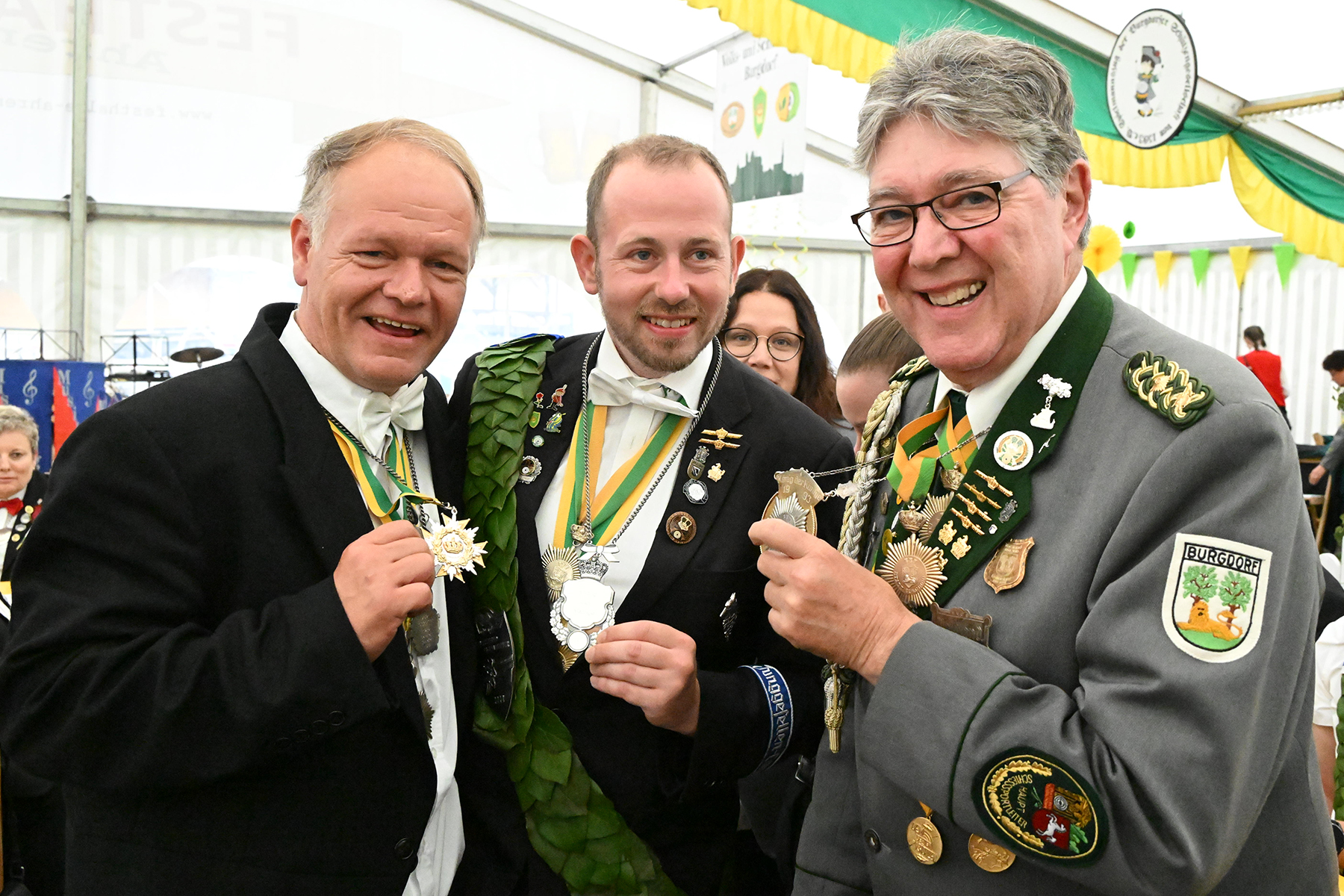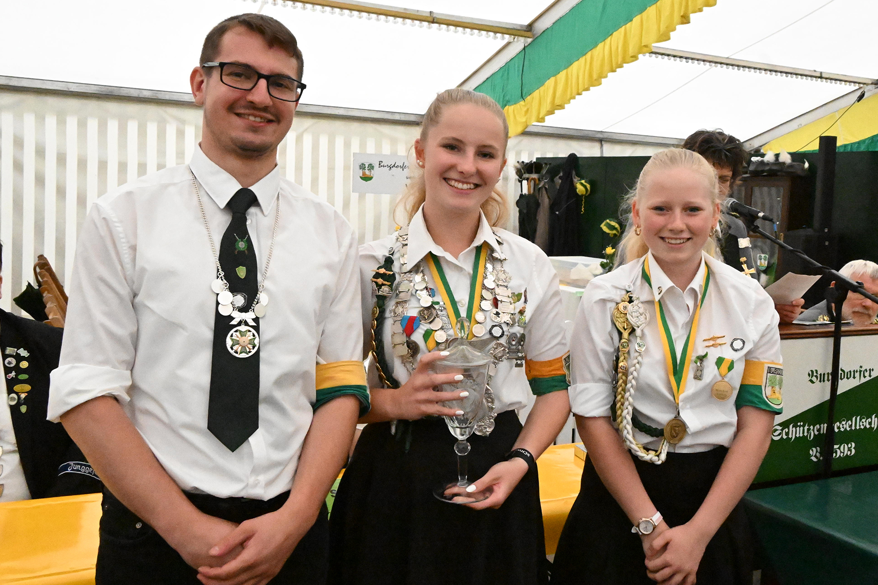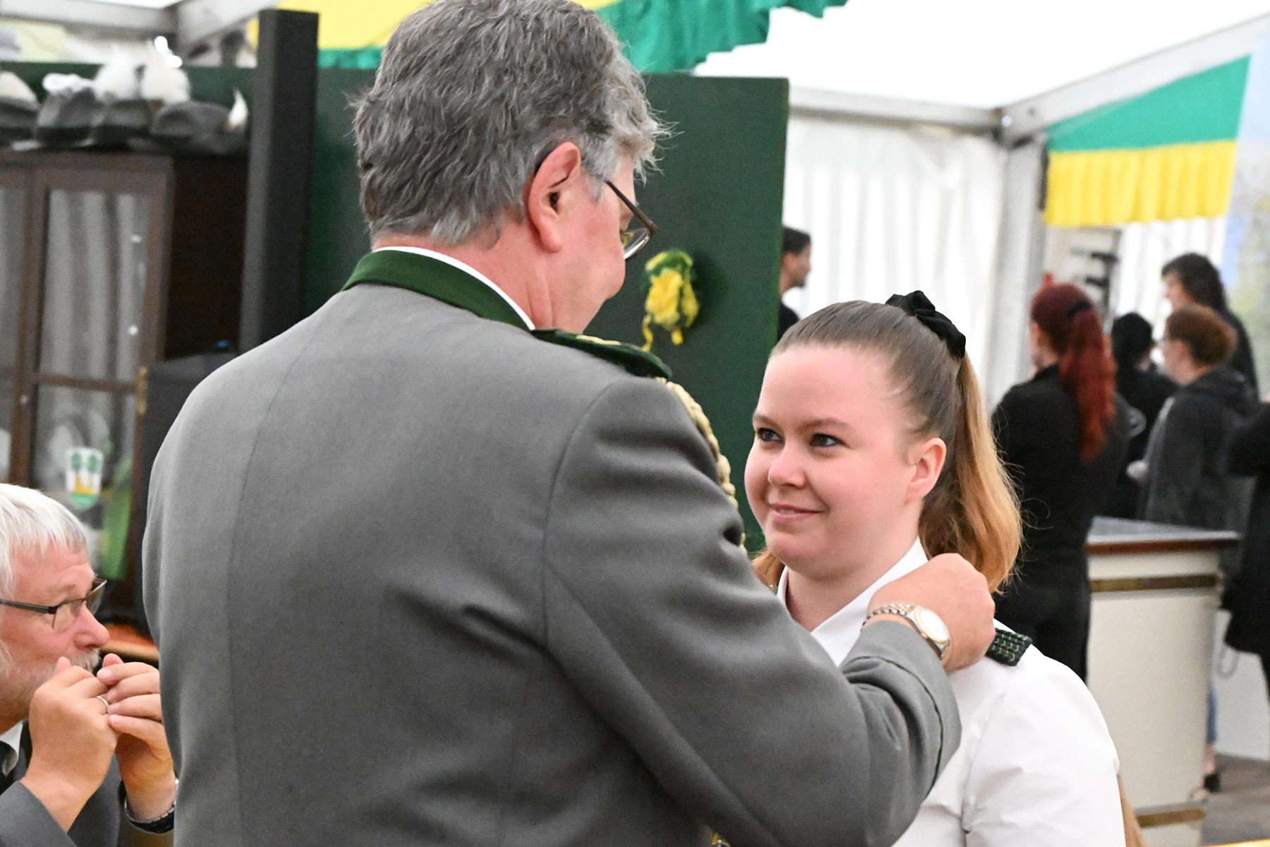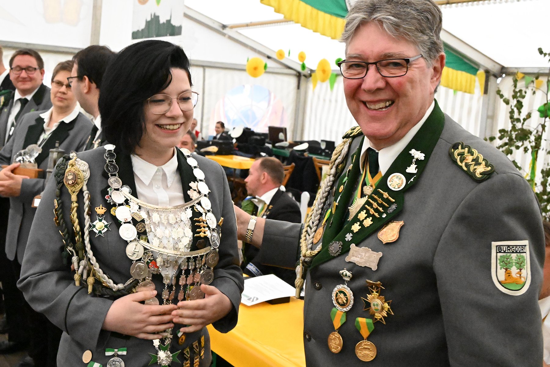 Spannend wurde es dann zur Bekanntgabe der Könige der Könige, die alle zehn Jahre ermittelt werden. Bei den Jungschützenkönigen holte sich Jenny Rode mit einem 3,60-Teiler den Titel. Königin der Königinnen ist Rhona Simanowsky, die mit einem 34,01-Teiler das beste Ergebnis hatte. Den Titel König der Könige trägt nun der noch amtierende König Freihand Sascha Biewer, der 27. Mitbewerber mit seinem 12,08-Teiler auf die Plätze verwies.