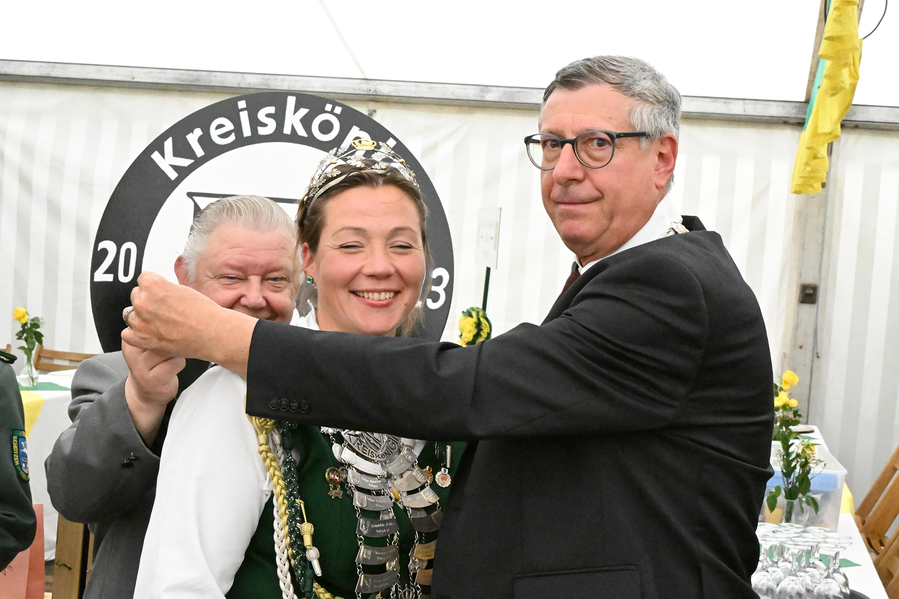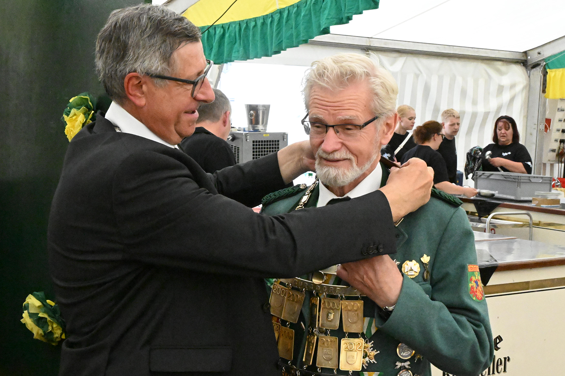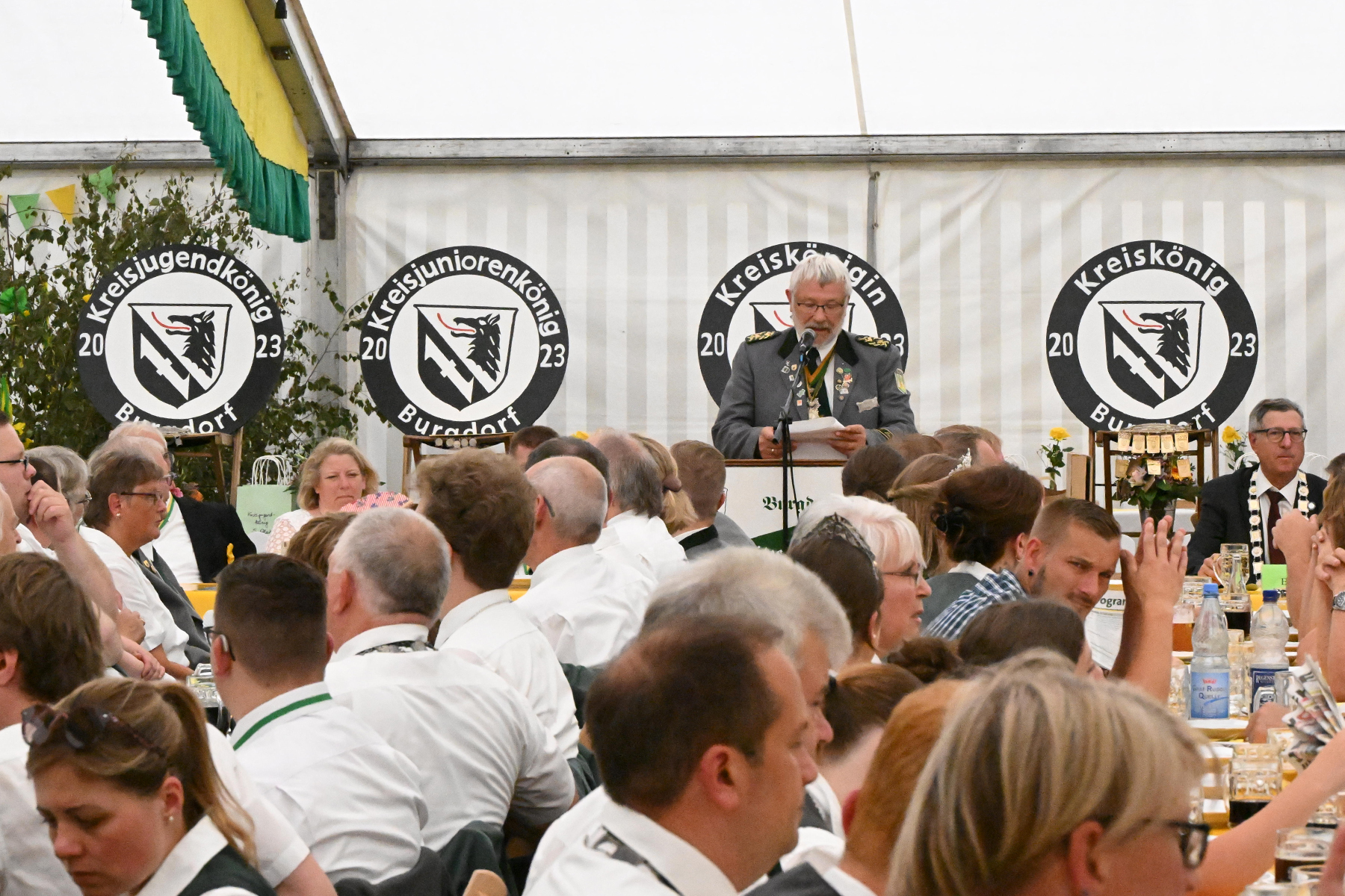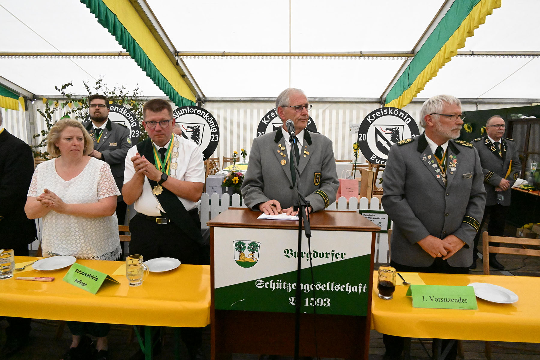 Im Festzelt der Burgdorfer Volks- und Schützenfestes konnten dann die neuen Könige proklamiert werden. Präsident Werner Bösche, begleitet vom Vize-Präsident Herbert Eggert und Kreisdamenleiterin Birgit Winter, gab die Ergebnisse bekannt. Burgdorfs Bürgermeister Armin Pollehn durfte dann die Königsketten an die neuen Inhaber überreichen. Für die musikalische Begleitung sorgte der Musik- und Fanfarenzug des Schützen-Corps Lehrte unter der Leitung von Dominic Jux.