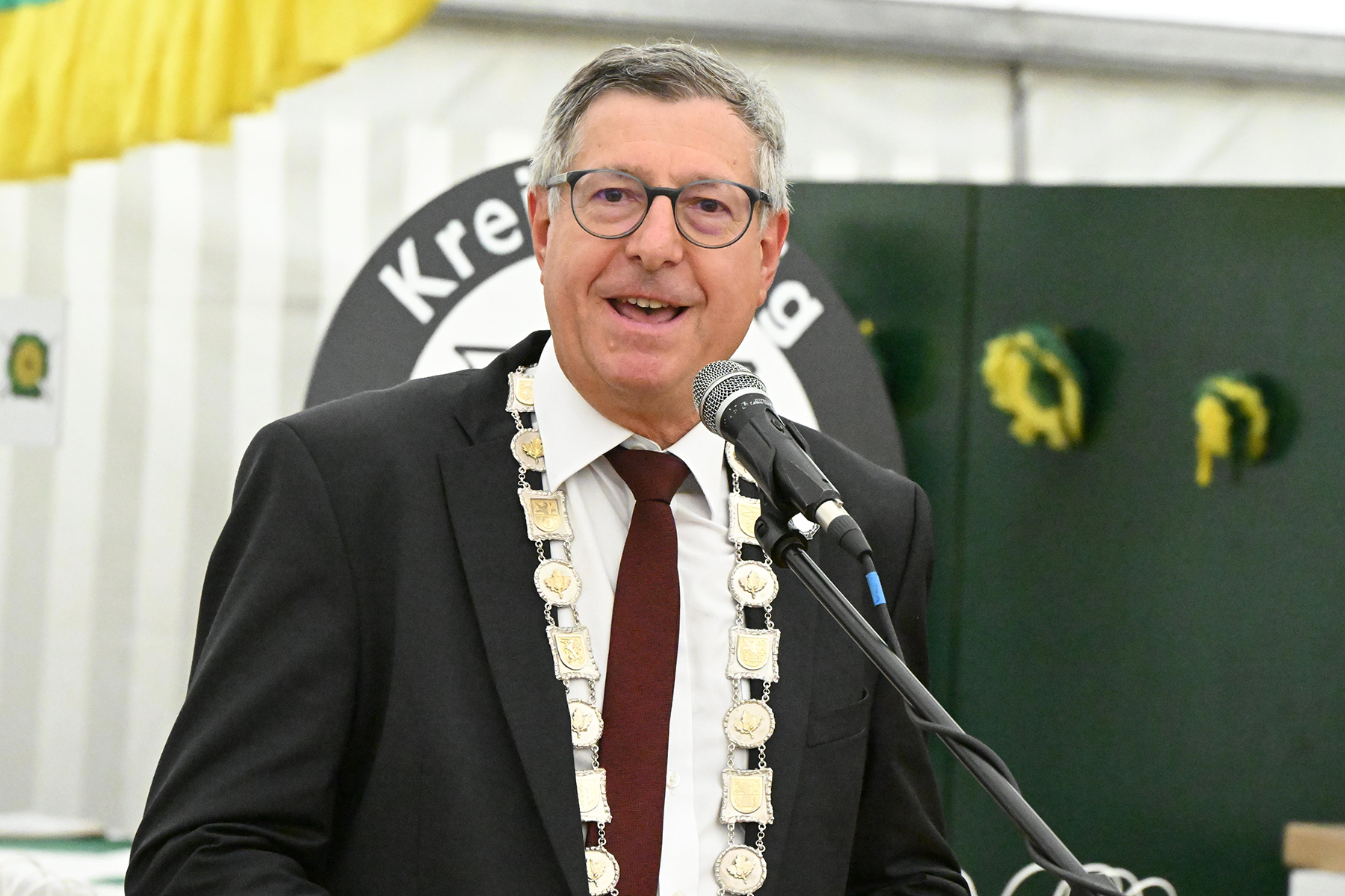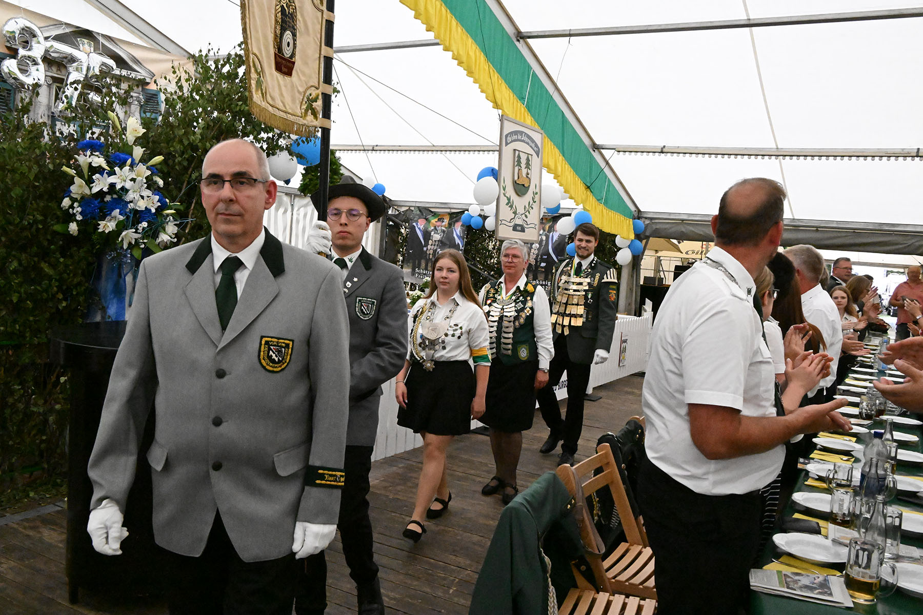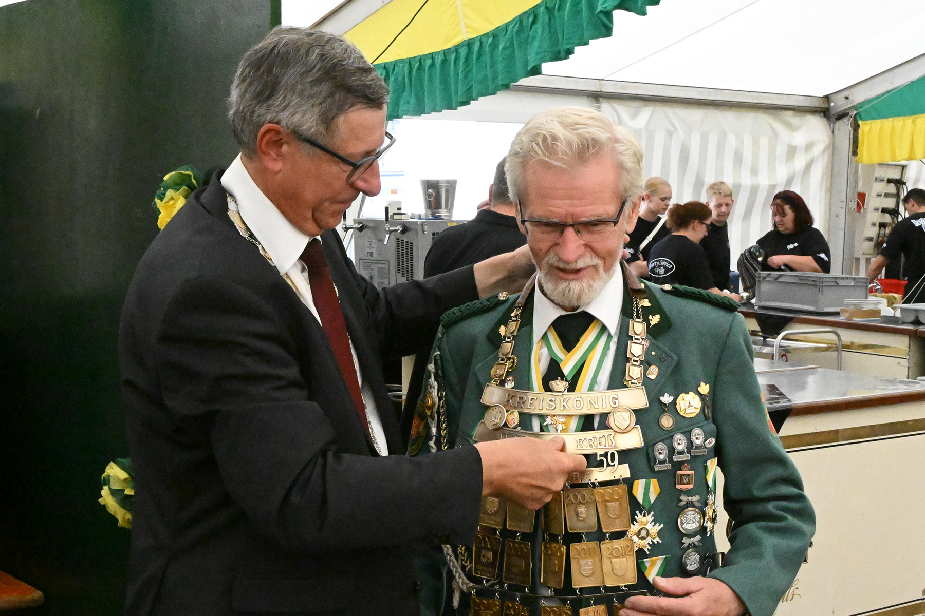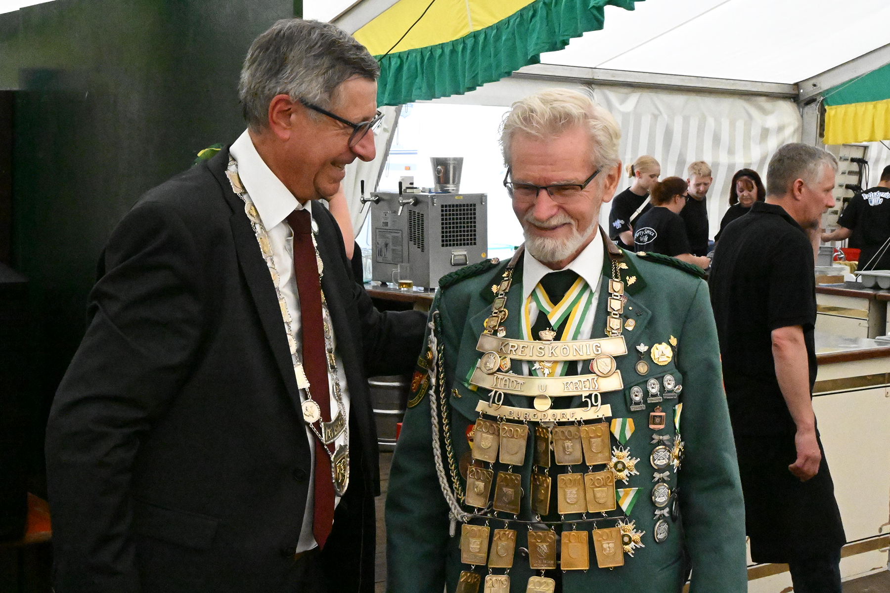 Im Festzelt der Burgdorfer Volks- und Schützenfestes konnten dann die neuen Könige proklamiert werden. Präsident Werner Bösche, begleitet vom Vize-Präsident Herbert Eggert und Kreisdamenleiterin Birgit Winter, gab die Ergebnisse bekannt. Burgdorfs Bürgermeister Armin Pollehn durfte dann die Königsketten an die neuen Inhaber überreichen. Für die musikalische Begleitung sorgte der Musik- und Fanfarenzug des Schützen-Corps Lehrte unter der Leitung von Dominic Jux.