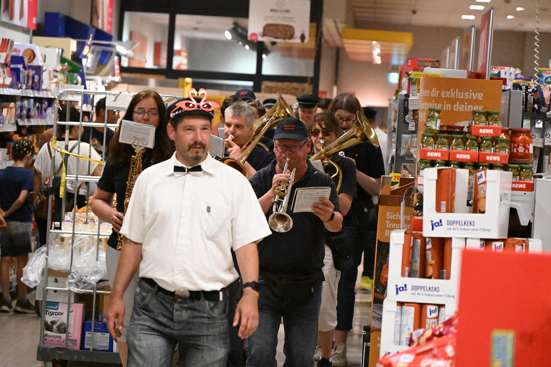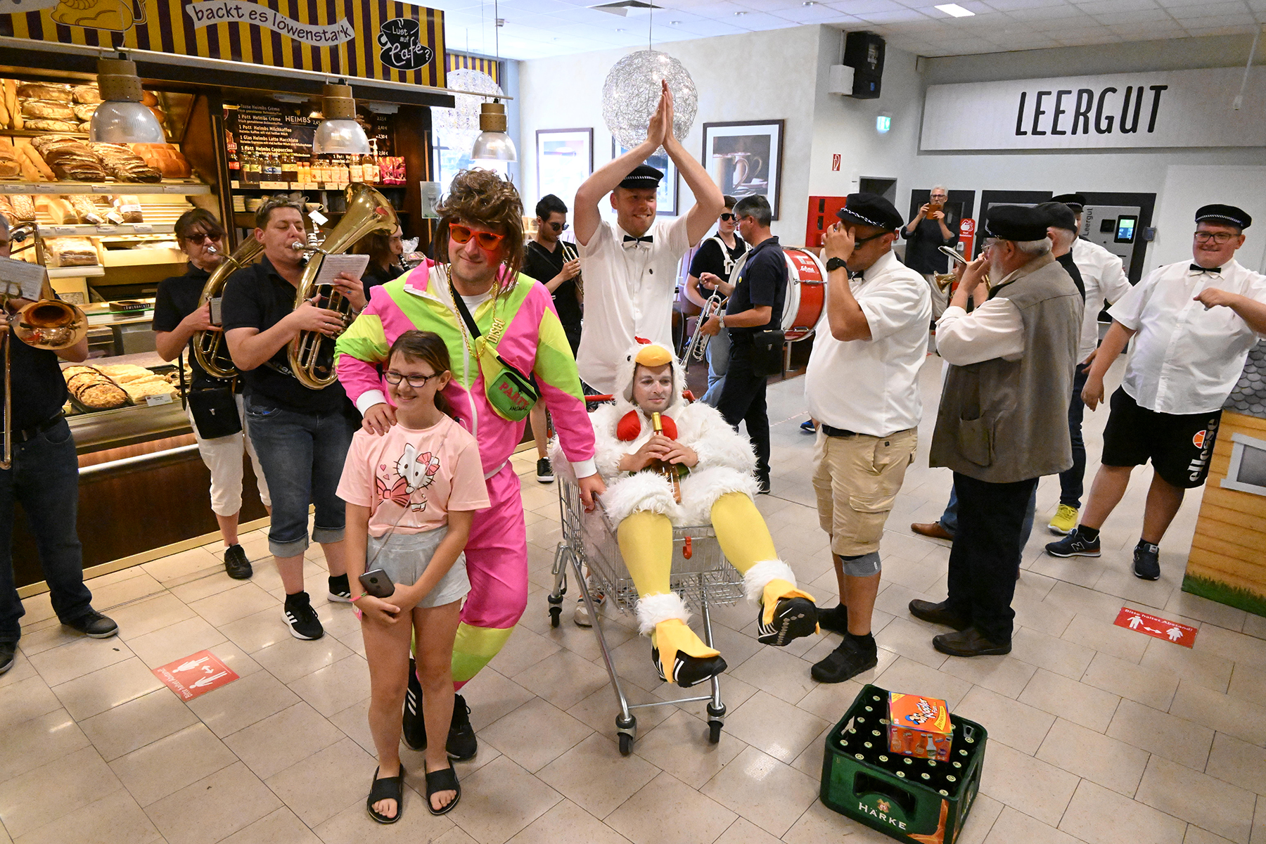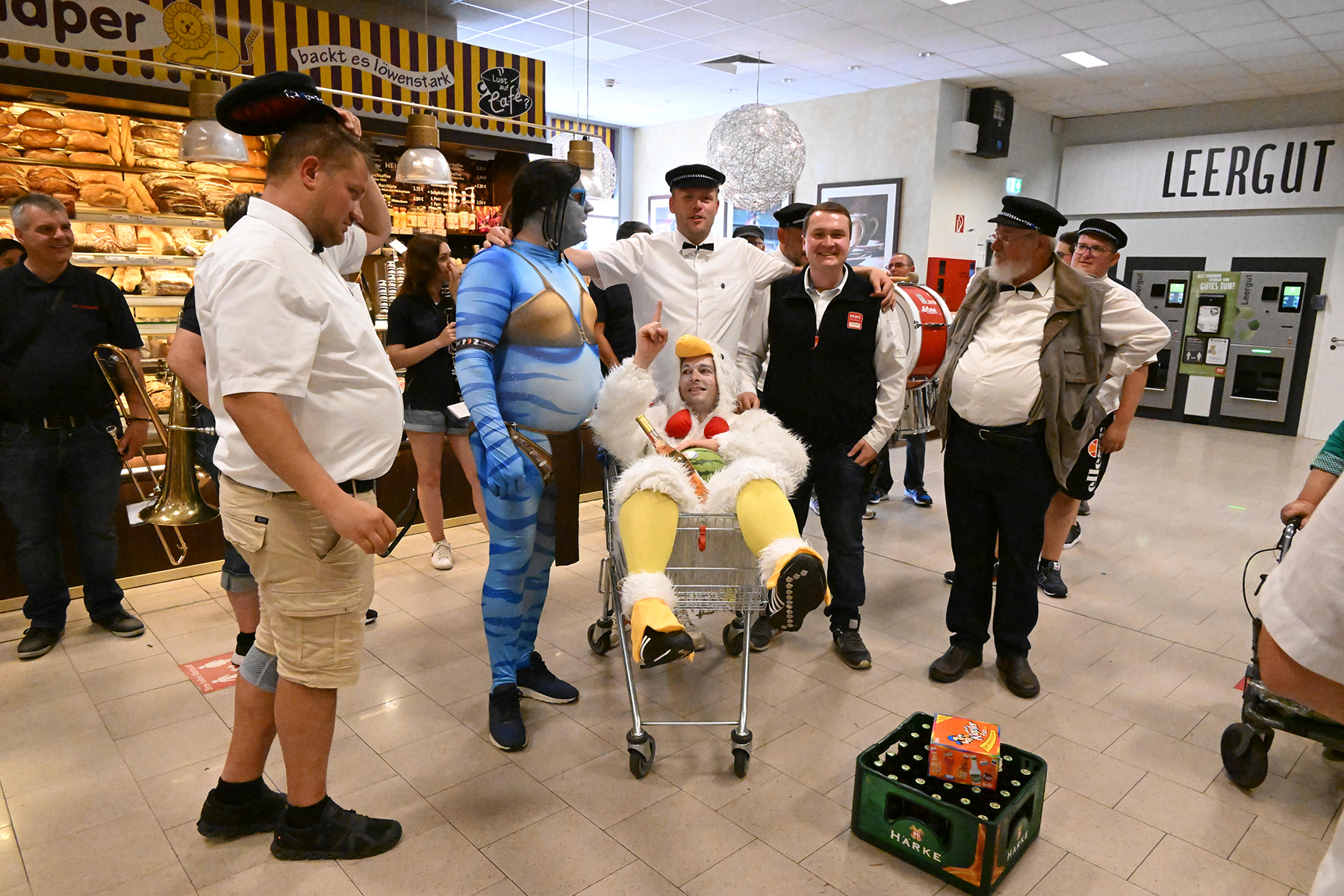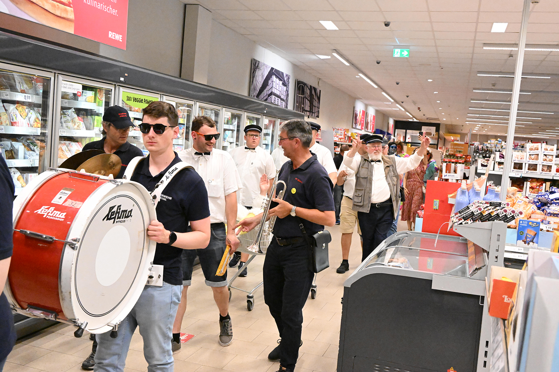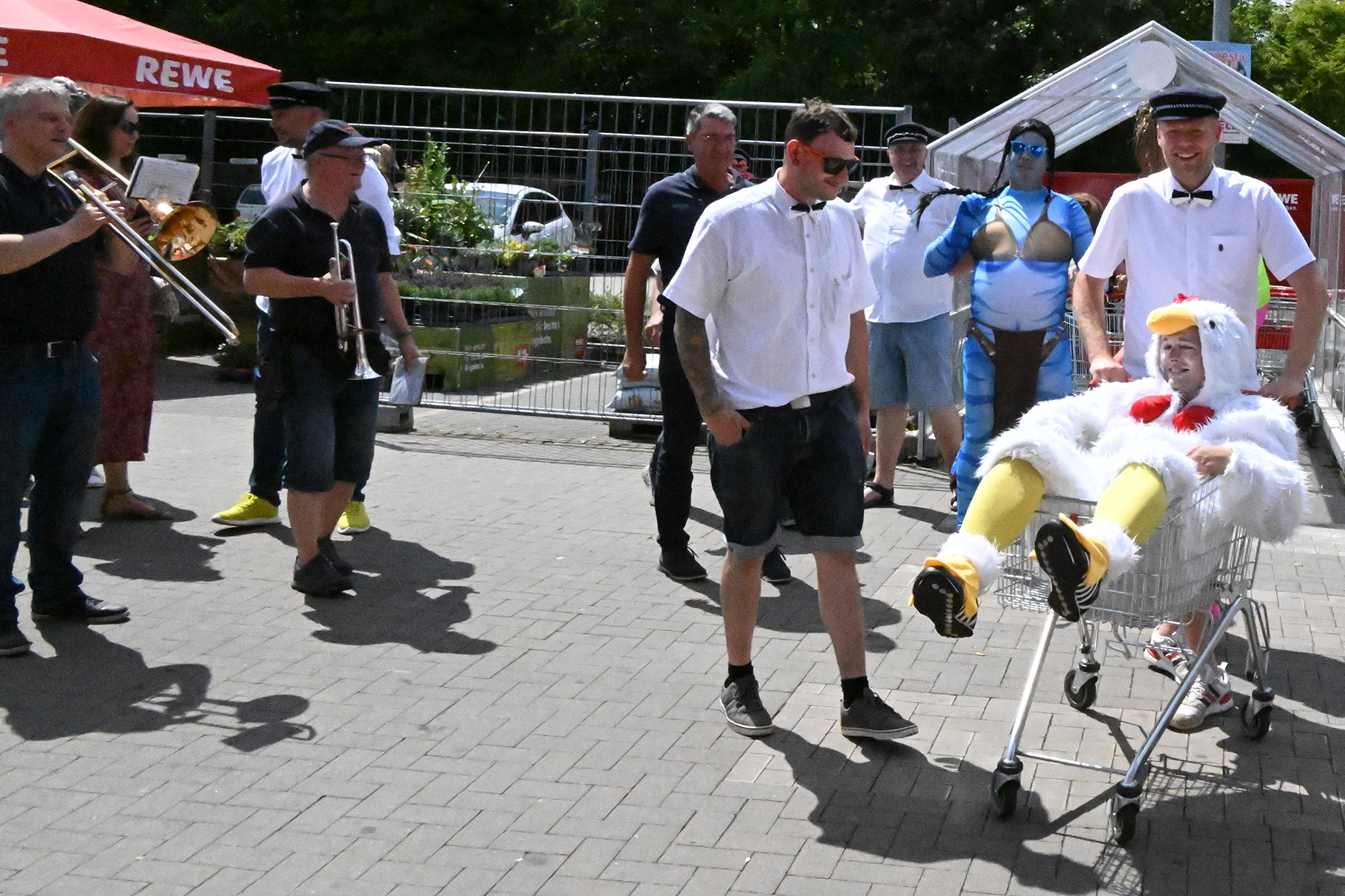 Schließlich zog der Tross zum Schützenhaus, mit einem Zwischenstopp im REWE-Markt, wo Marktleiter Daniel Fricke den Junggesellen ebenso eine Gabe überreichte. Zuvor ging es mit Musik einmal durch den gesamten Markt.
