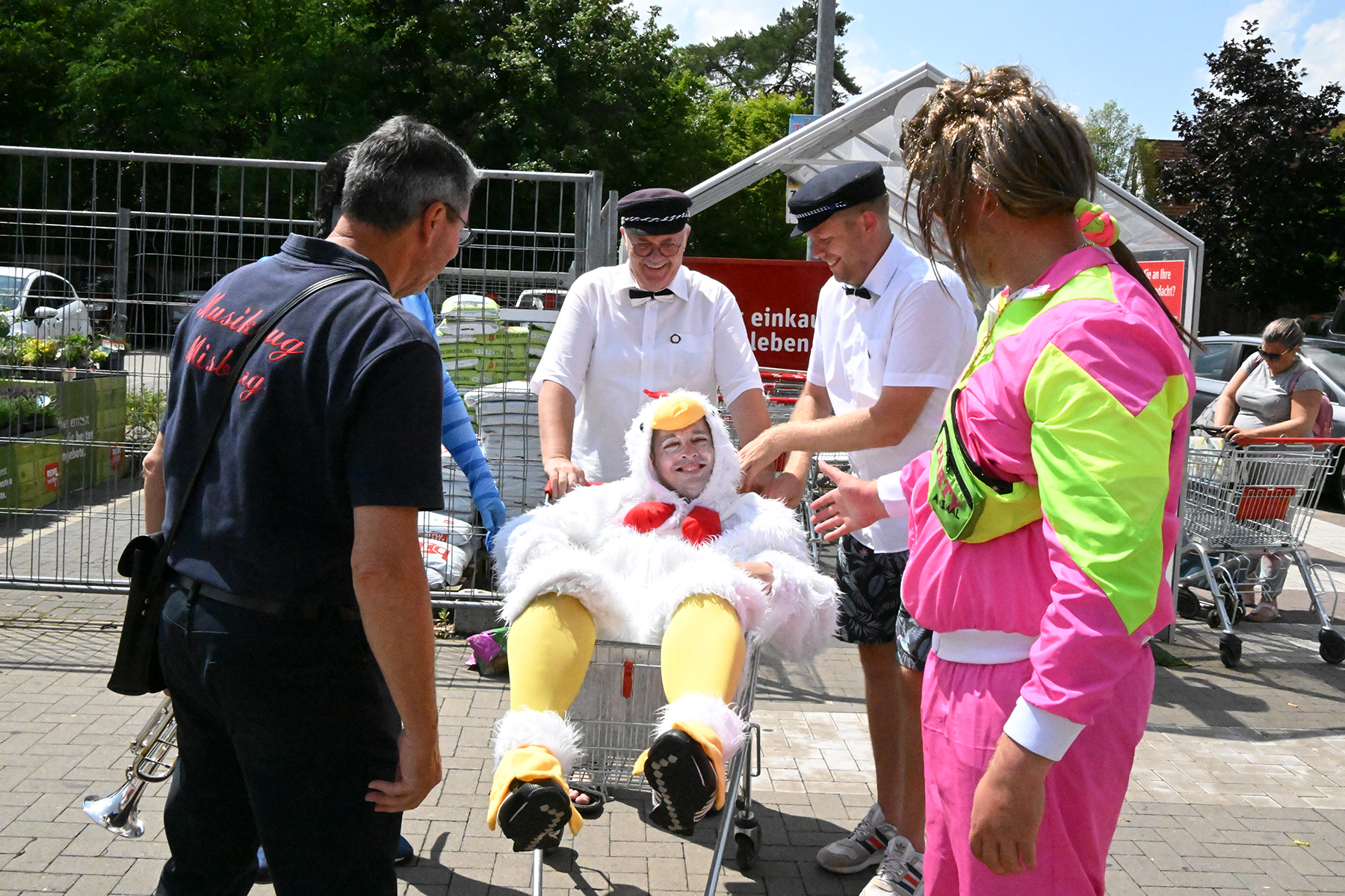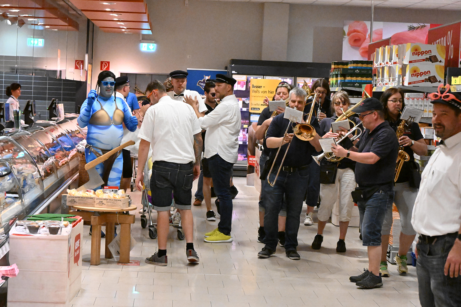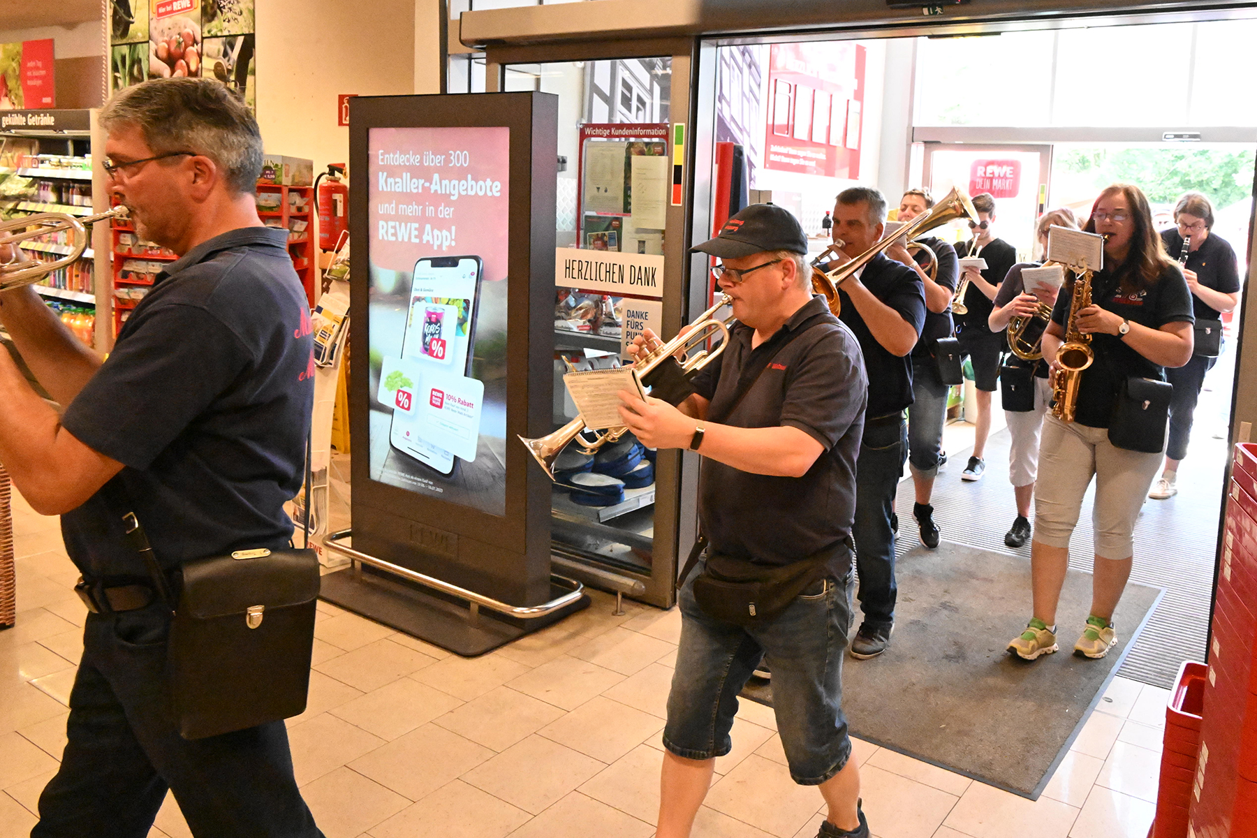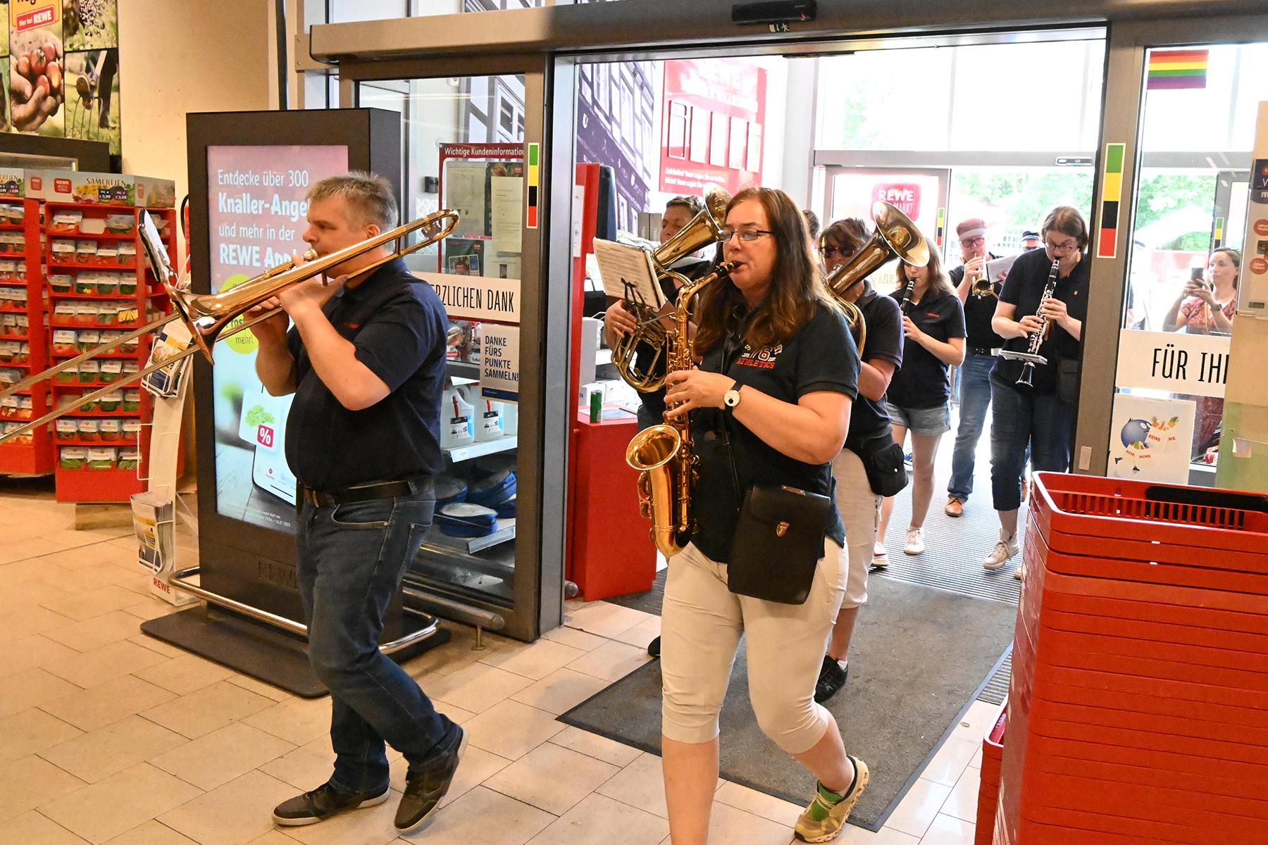 Schließlich zog der Tross zum Schützenhaus, mit einem Zwischenstopp im REWE-Markt, wo Marktleiter Daniel Fricke den Junggesellen ebenso eine Gabe überreichte. Zuvor ging es mit Musik einmal durch den gesamten Markt.
