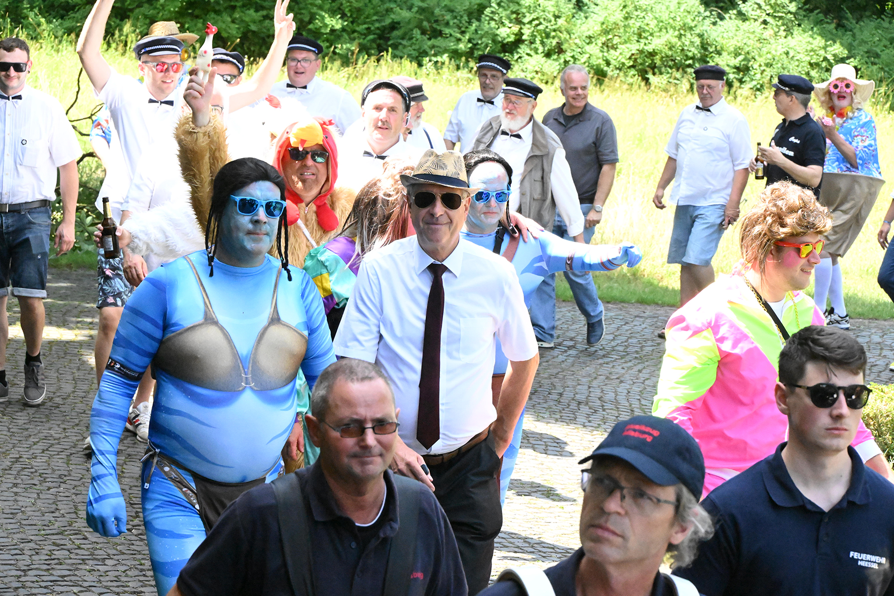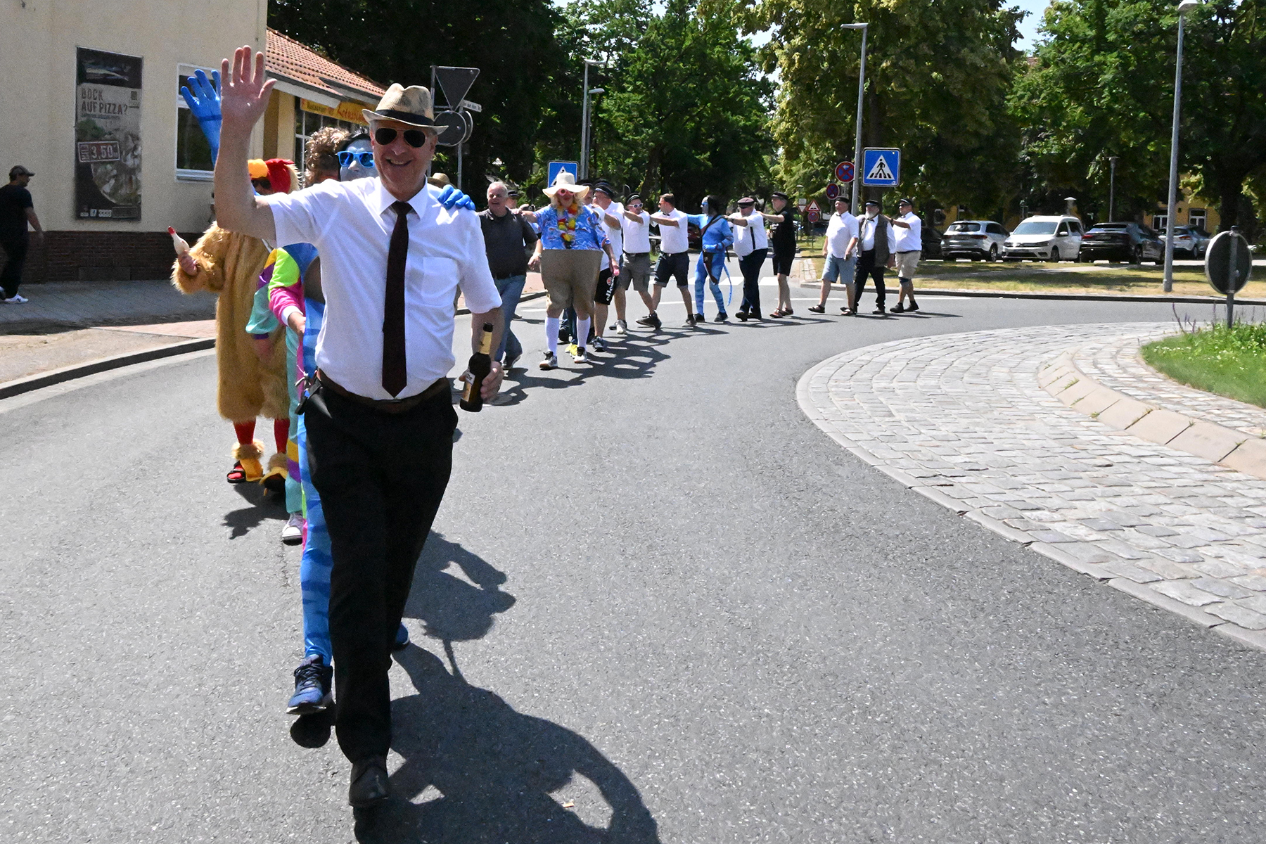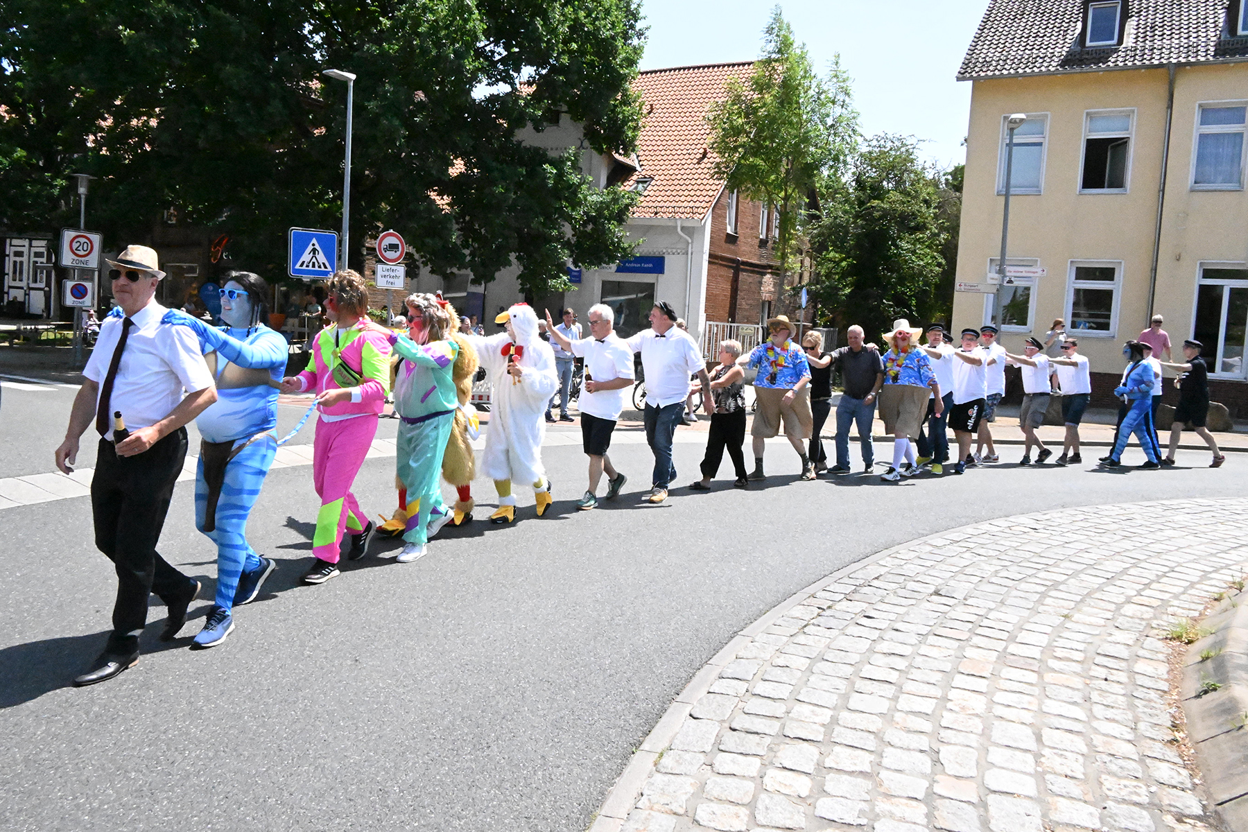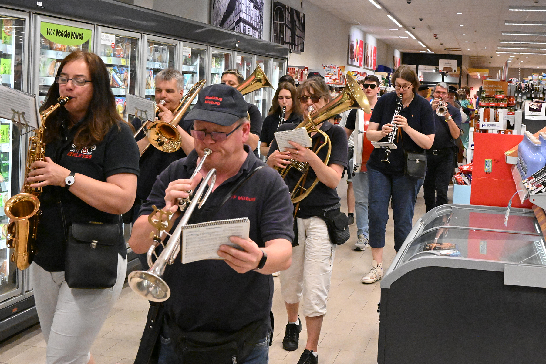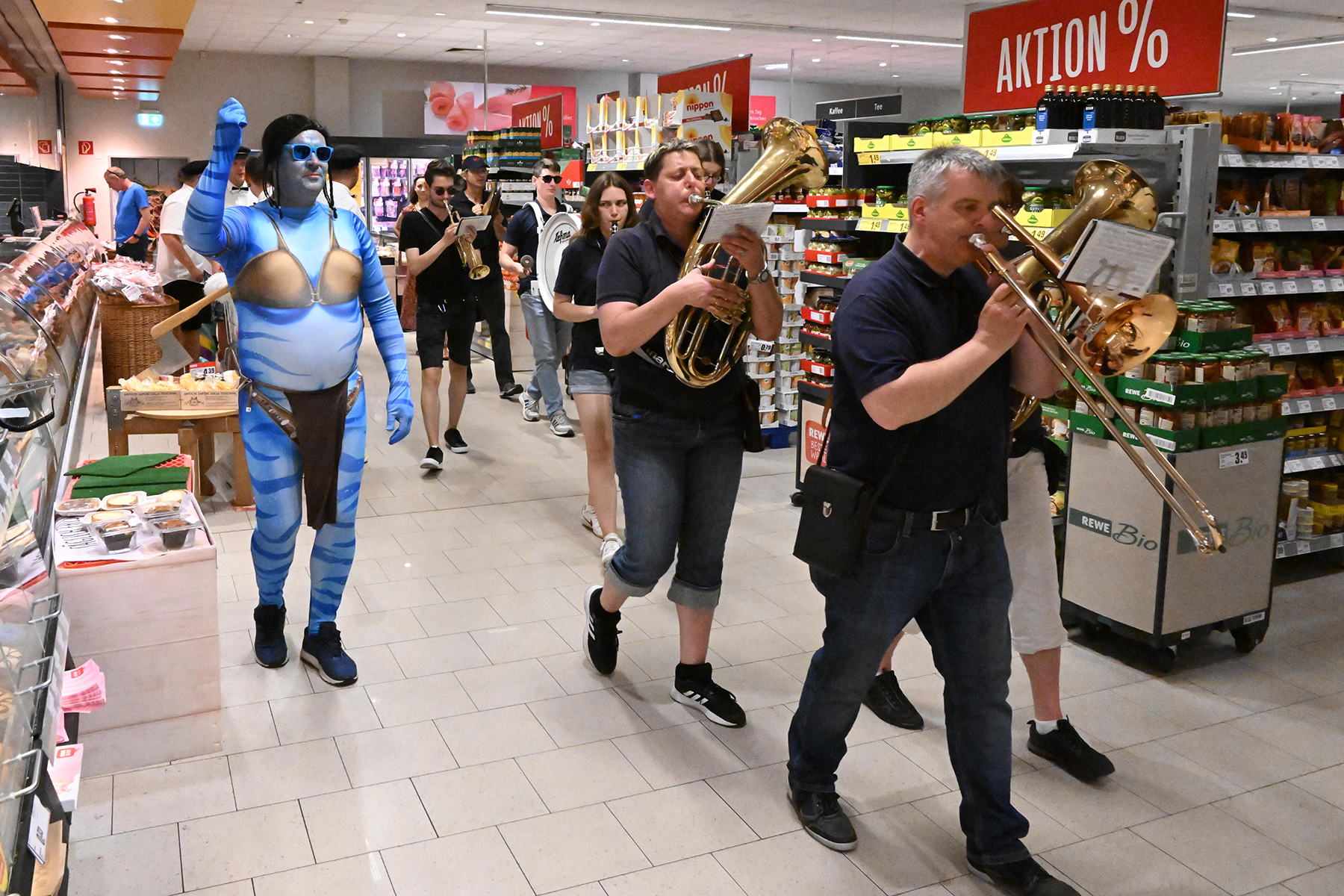 Schließlich zog der Tross zum Schützenhaus, mit einem Zwischenstopp im REWE-Markt, wo Marktleiter Daniel Fricke den Junggesellen ebenso eine Gabe überreichte. Zuvor ging es mit Musik einmal durch den gesamten Markt.
