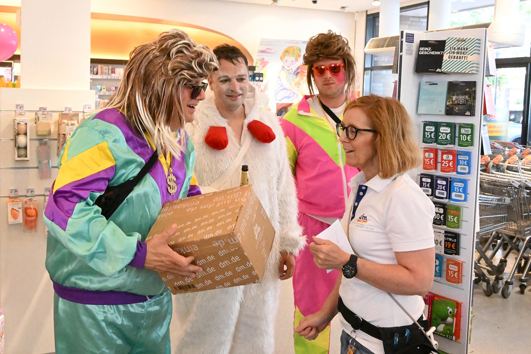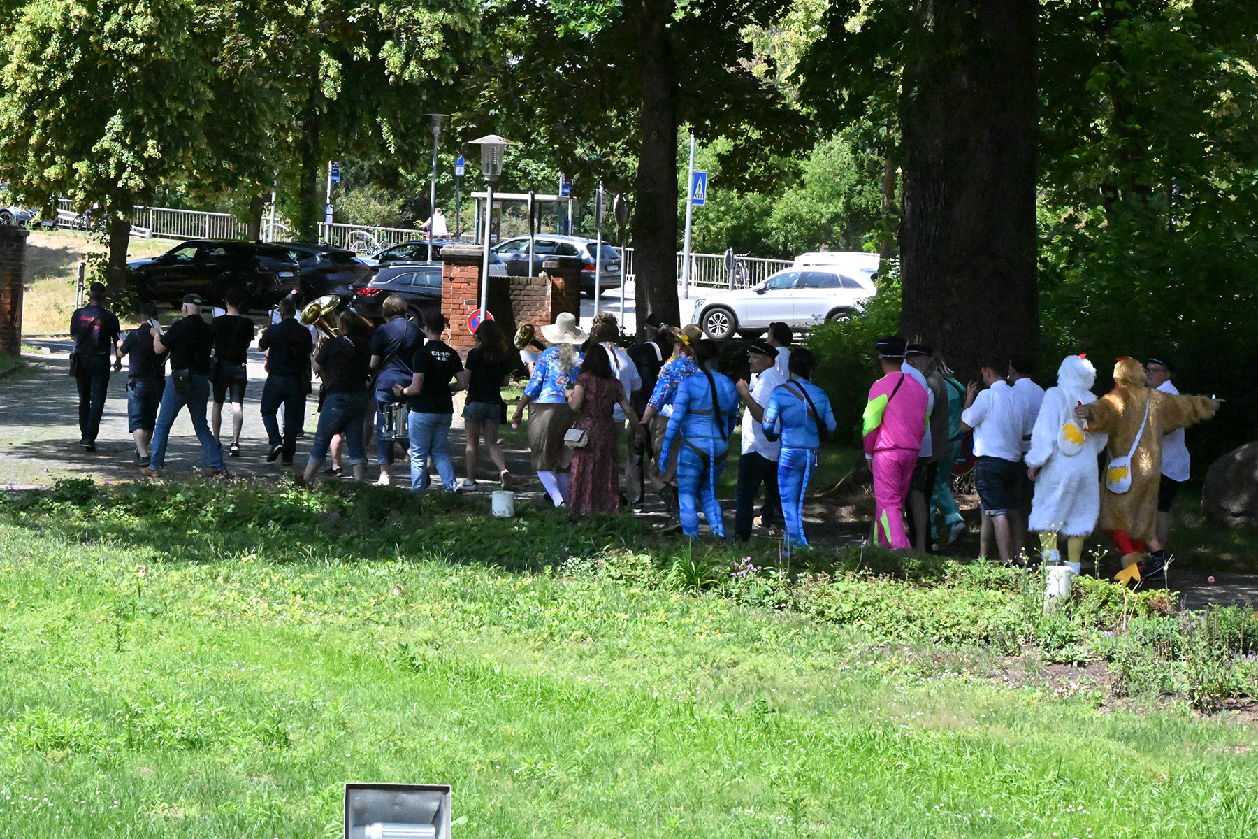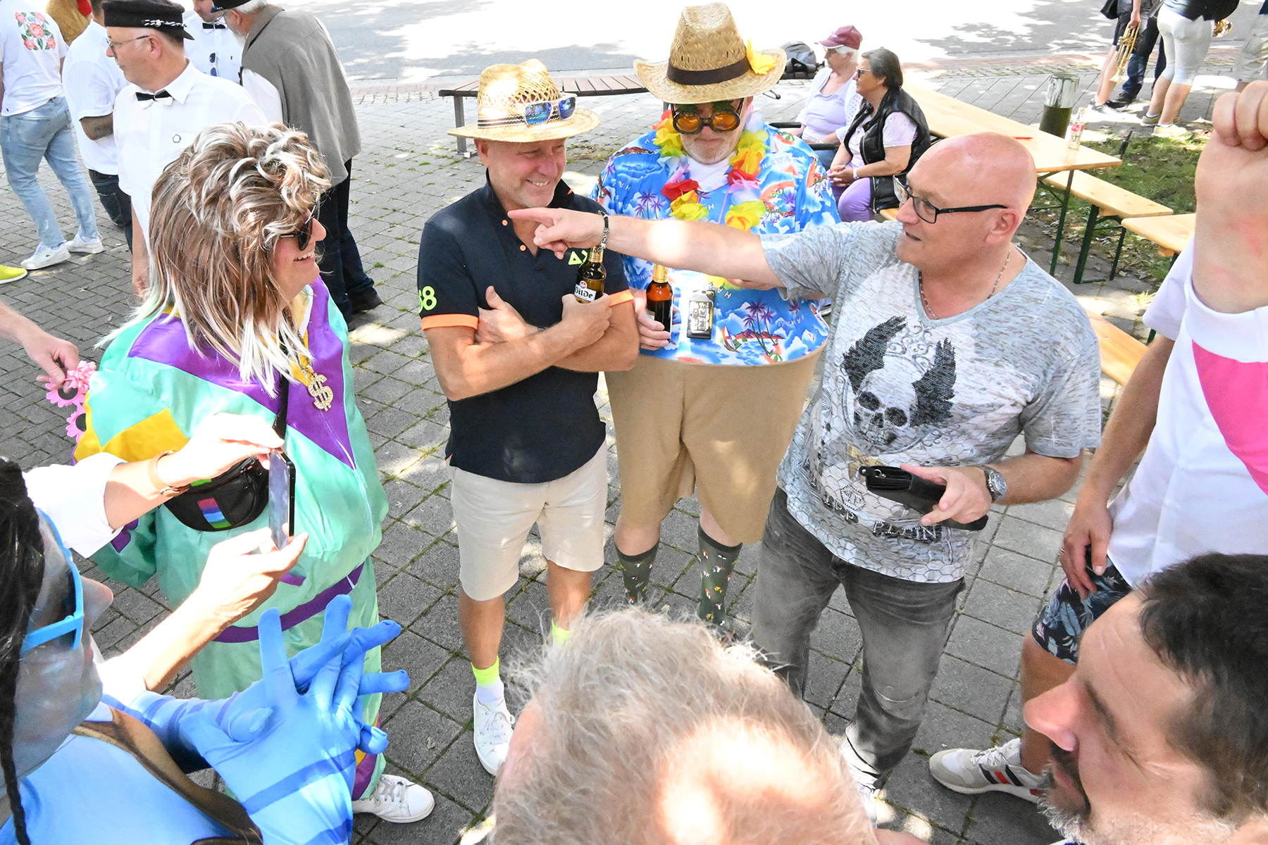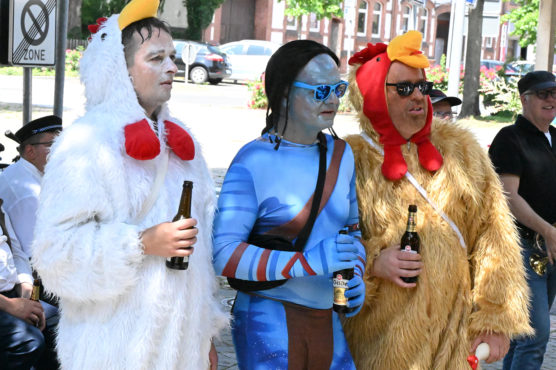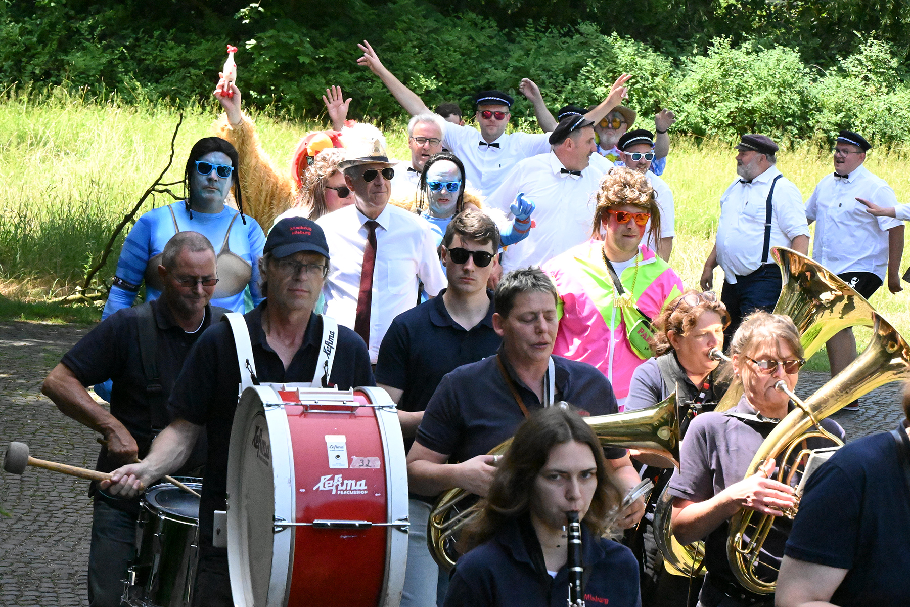 Schließlich zog der Tross zum Schützenhaus, mit einem Zwischenstopp im REWE-Markt, wo Marktleiter Daniel Fricke den Junggesellen ebenso eine Gabe überreichte. Zuvor ging es mit Musik einmal durch den gesamten Markt.