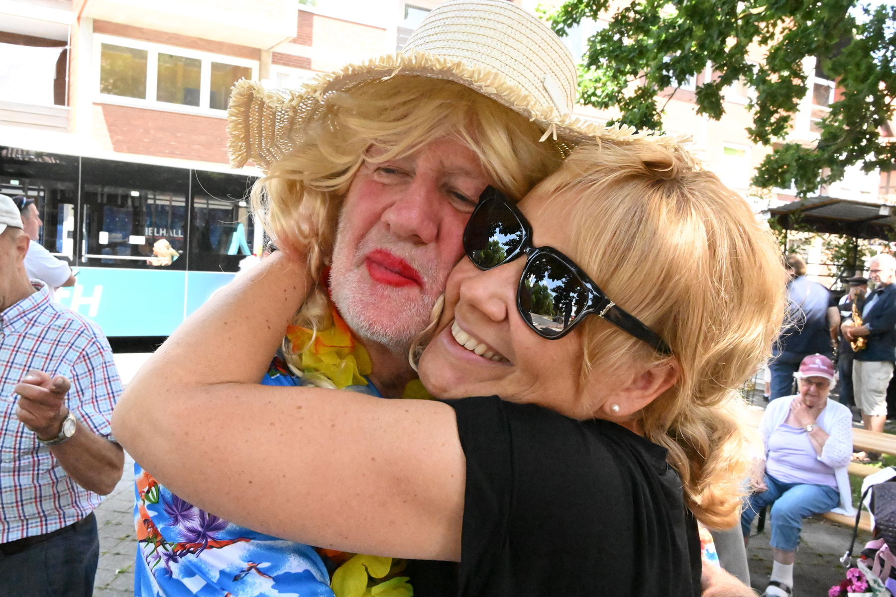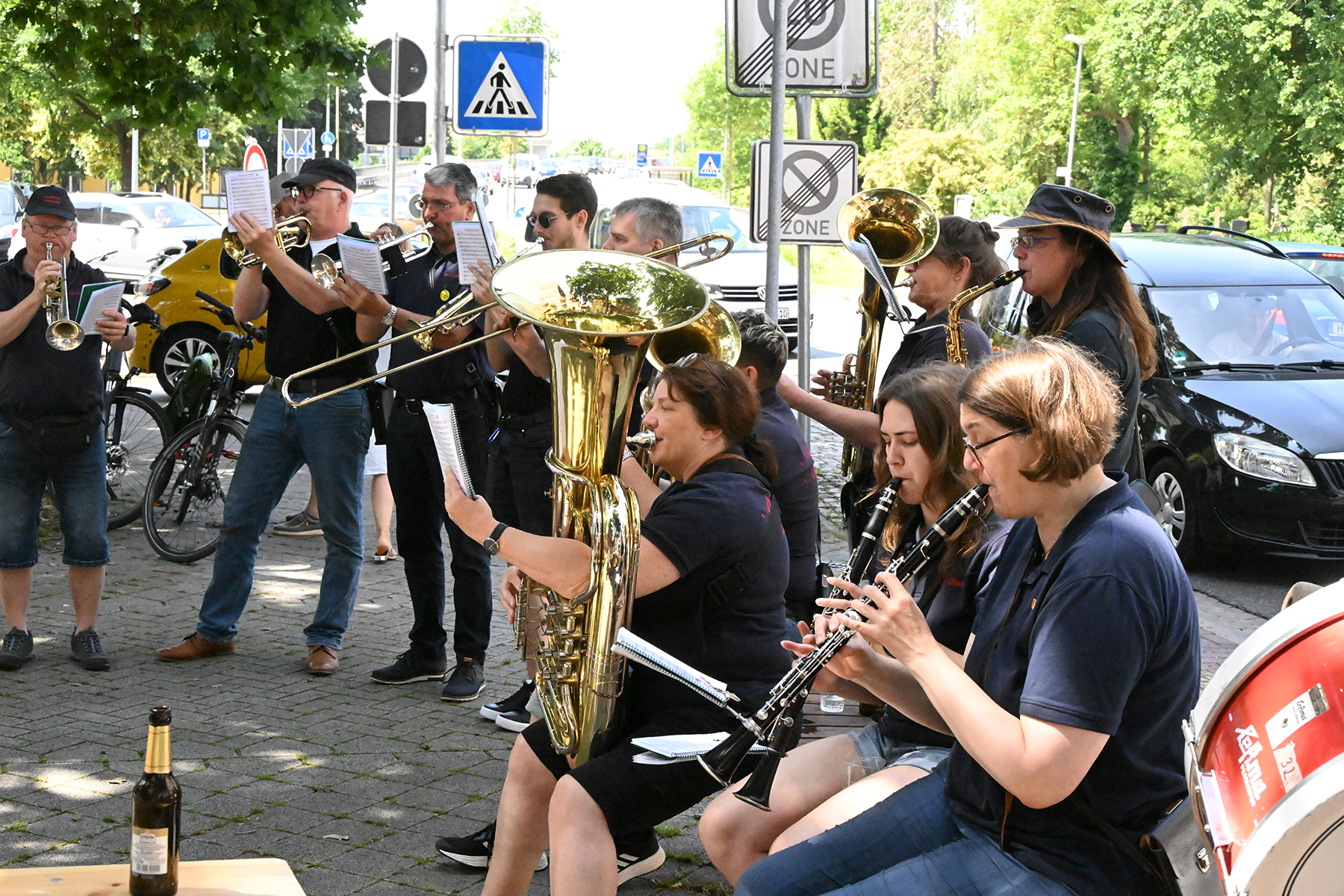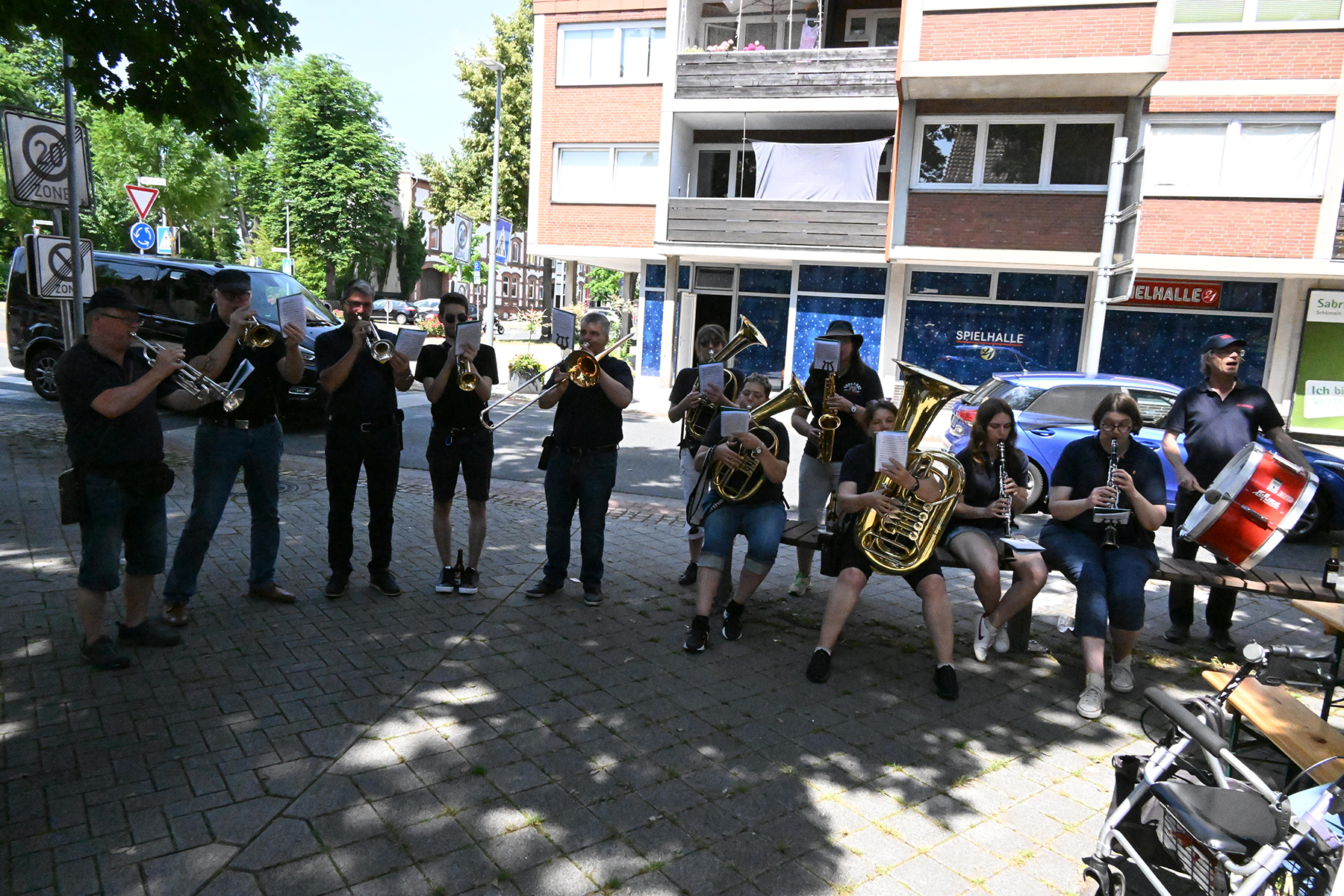 Unter der Begleitung des Feuerwehrmusikzuges Misburg ging es in das Gebäude. Dort kredenzte Bürgermeister Armin Pollehn, begleitet durch seine Frau Nicole und Tochter Roxana-Isabella, den Gästen kalte Getränke und überreichte ebenso ein Geschenk, wie es die Sammeltradition erfordert.