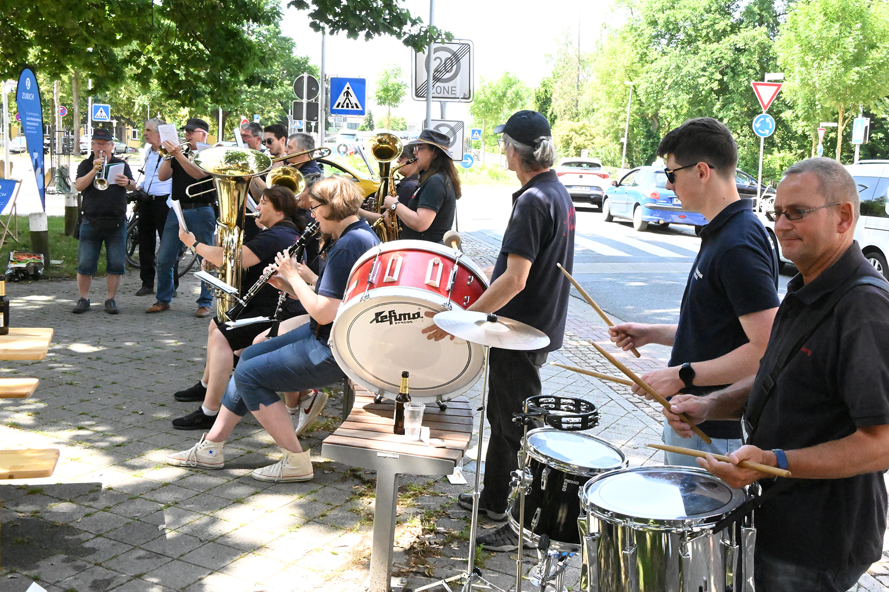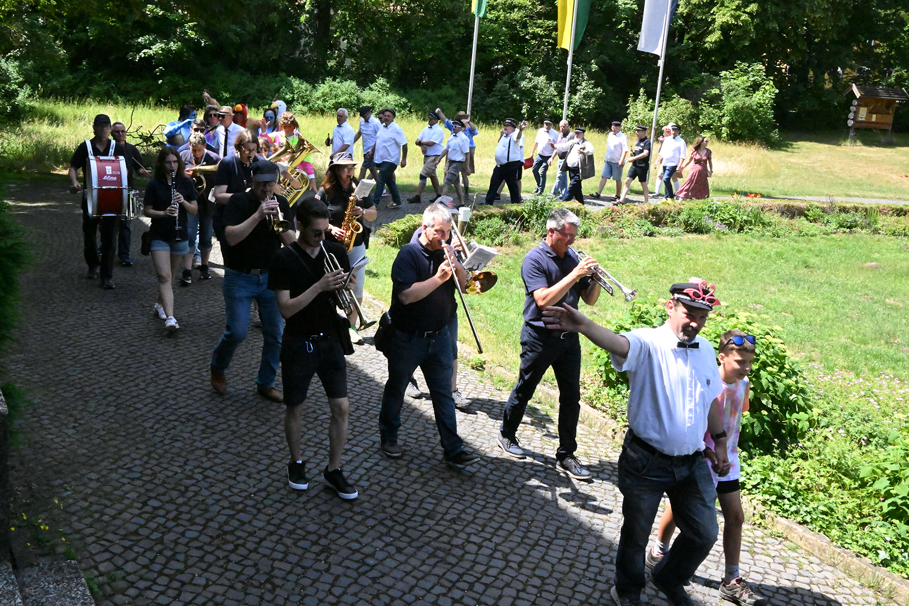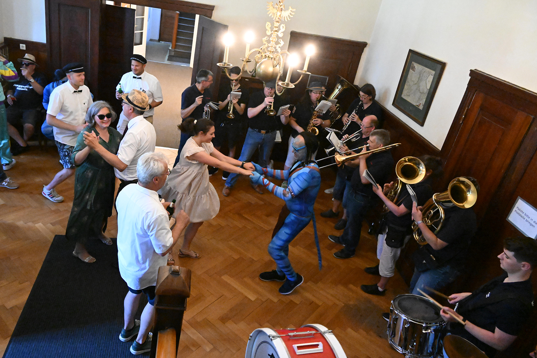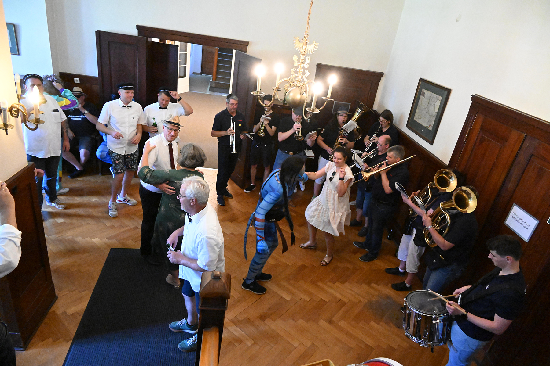 Unter der Begleitung des Feuerwehrmusikzuges Misburg ging es in das Gebäude. Dort kredenzte Bürgermeister Armin Pollehn, begleitet durch seine Frau Nicole und Tochter Roxana-Isabella, den Gästen kalte Getränke und überreichte ebenso ein Geschenk, wie es die Sammeltradition erfordert.
