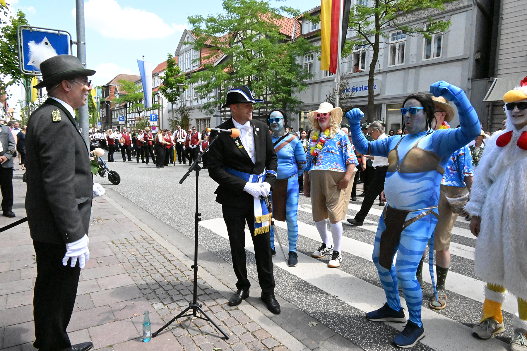 Von drei Umzügen mussten zwei ausfallen. Aber wenigstens der wichtigste Umzug zum Burgdorfer Volks- und Schützenfest konnte stattfinden. Und statt Regenschirmen, wie am Donnerstag und Freitag, waren am heutigen Sonntag, 25. Juni 2023, zum großen Festumzug Sonnenschirme notwendig. Bei 28 Grad im Schatten kamen nicht nur die Teilnehmer ins Schwitzen, sondern auch die zahlreichen Zuschauer am Rande des Umzugswegs. Teilnehmer wie Zsuchauer waren am Ende begeistert von den Feierlichkeiten.