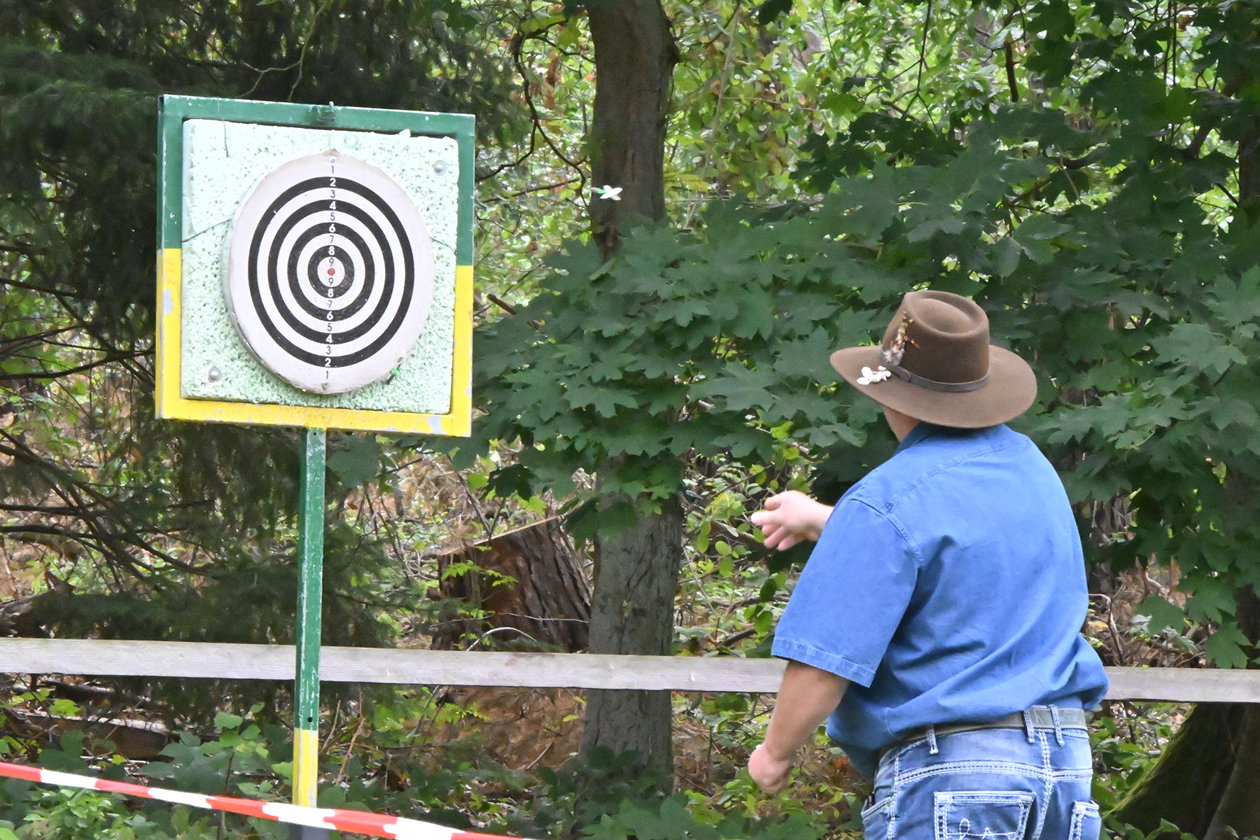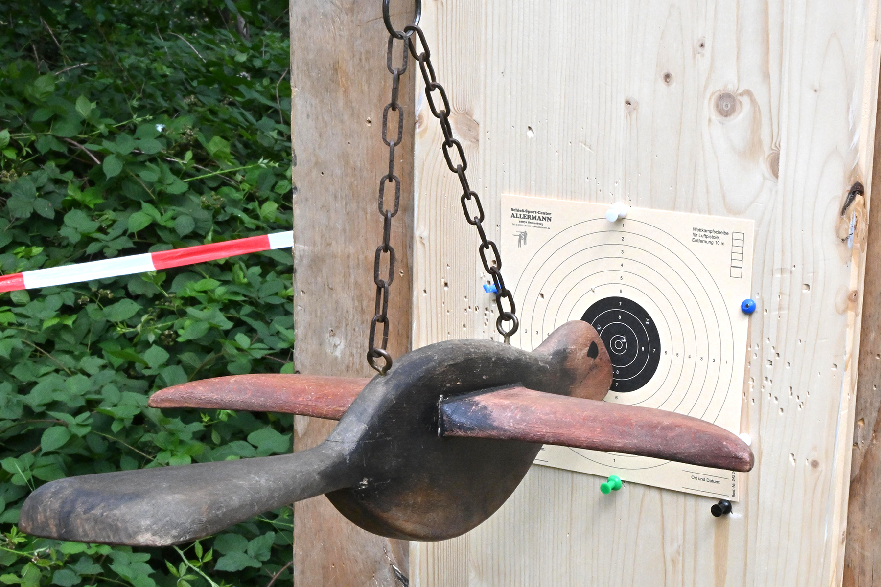 Bei Vogelstechen musste ein an einer Schnur befestigter Vogel an die Wurflinie herangezogen und schließlich im freien Fall mit der Spitze in die Mitte einer Scheibe gesetzt werden. Eine Aufgabe, die zwar zunächst einfach aussah, aber dann doch nicht so einfach zu bewerkstelligen war. Zu sehen an den "Einschlägen", die am Ende des Wettkampfs neben der Scheibe lagen und dsamit weit außerhalb des wertbaren Bereichs.