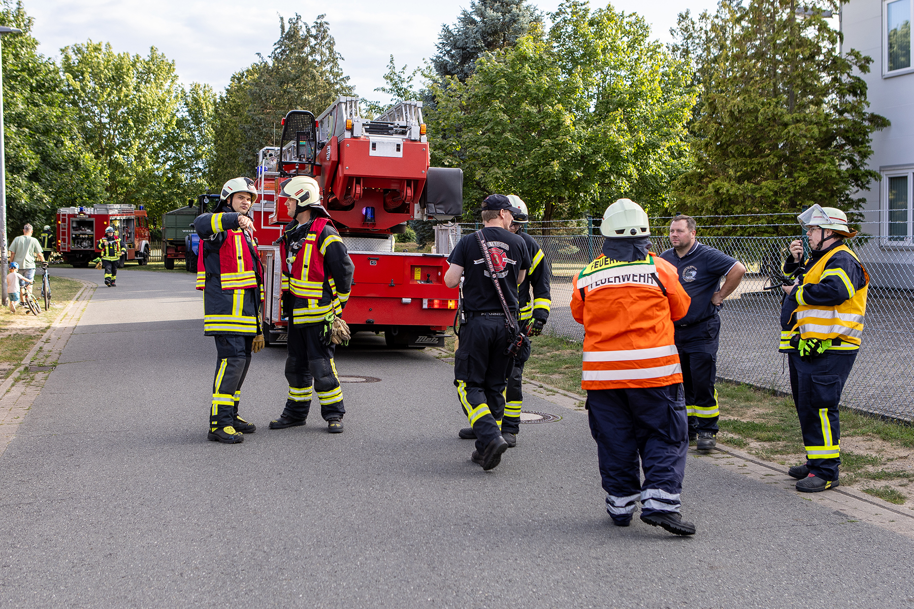 Eine weitere Herausforderung war für die ehrenamtlichen Feuerwehrkräfte die Wasserversorgung. Denn sämtliche Unterflurhydranten im Zunftweg waren nach Vorgaben des Übungsszenarios durch die Detonation beschädigt worden und somit defekt. Es musste daher auf den Weidendamm ausgewichen werden. Durch Hinzuziehen eines Löschwasserbrunnens und eines Unterflurhydranten konnten insgesamt 2000 Liter Wasser pro Minute in der Leitung gefördert werden, so dass ausreichend Löschwasser vor Ort zur Verfügung stand.