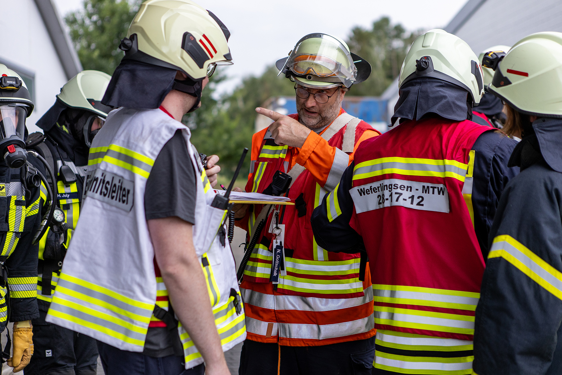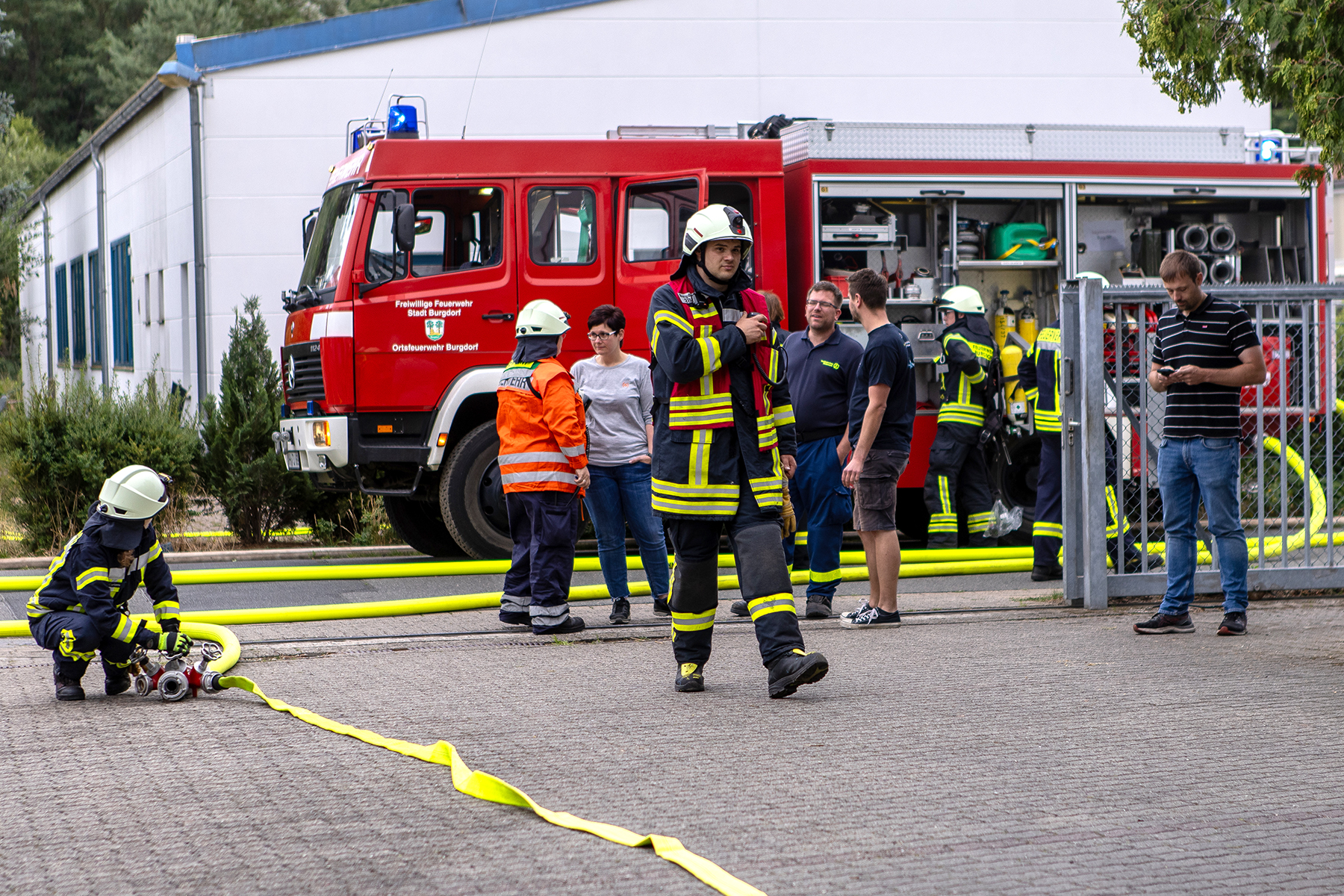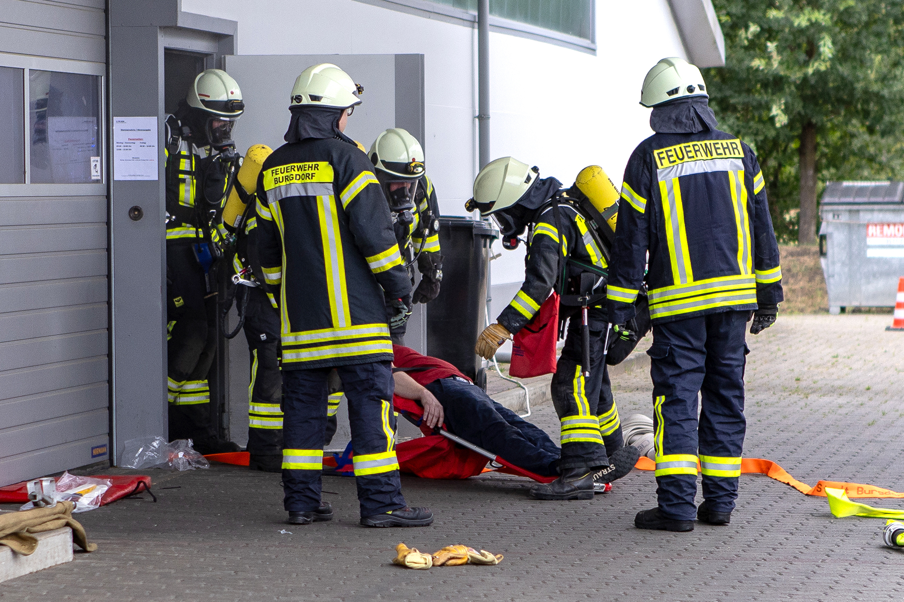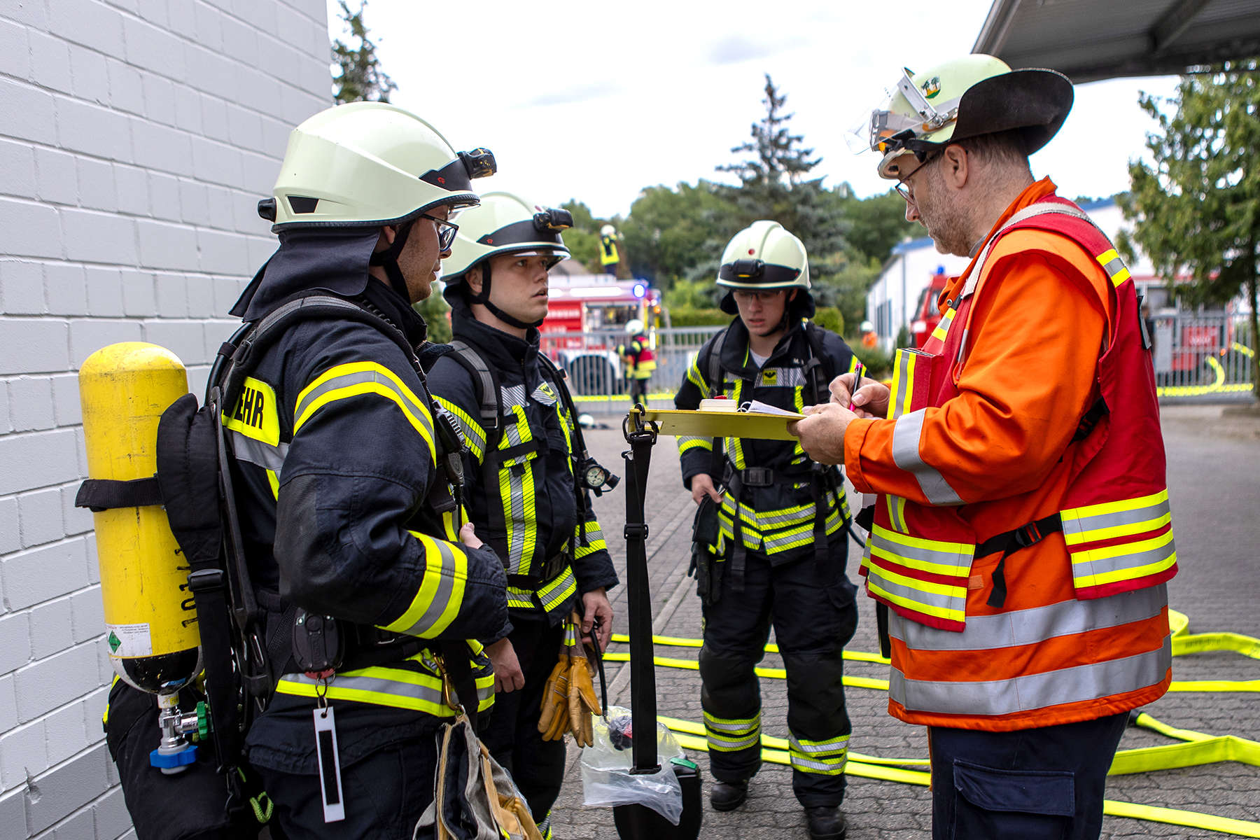 Am heutigen Montag, 17. Juli 2023 um 18:08 Uhr alarmierte die Regionsleitstelle Hannover die Freiwilligen Feuerwhren aus Ramlingen-Ehlershausen und Burgdorf zu einem Mittelbrand in einer Gasumfüllstation im Zunftweg nach Ehlershausen. Stadtbrandmeister Dennis Heuer, der auch die Einsatzleiter übernommen hatte, erkundete sofort nach seinem Eintreffen die Lage und erhöhte die Alarmstufe auf B3, so dass auch die Ortsfeuerwehren Otze und Weferlingsen zur Unterstützung alarmiert wurden. Für das Einsatzszenario waren es jedoch immer noch zu wenig Einsatzkräfte, woraufhin er die Ortsfeuerwehren Dachtmissen und Hülptingsen nachalarmieren ließ. Was nur wenige wussten: Es handelte sich um eine Einsatzübung der Stadtfeuerwehr.