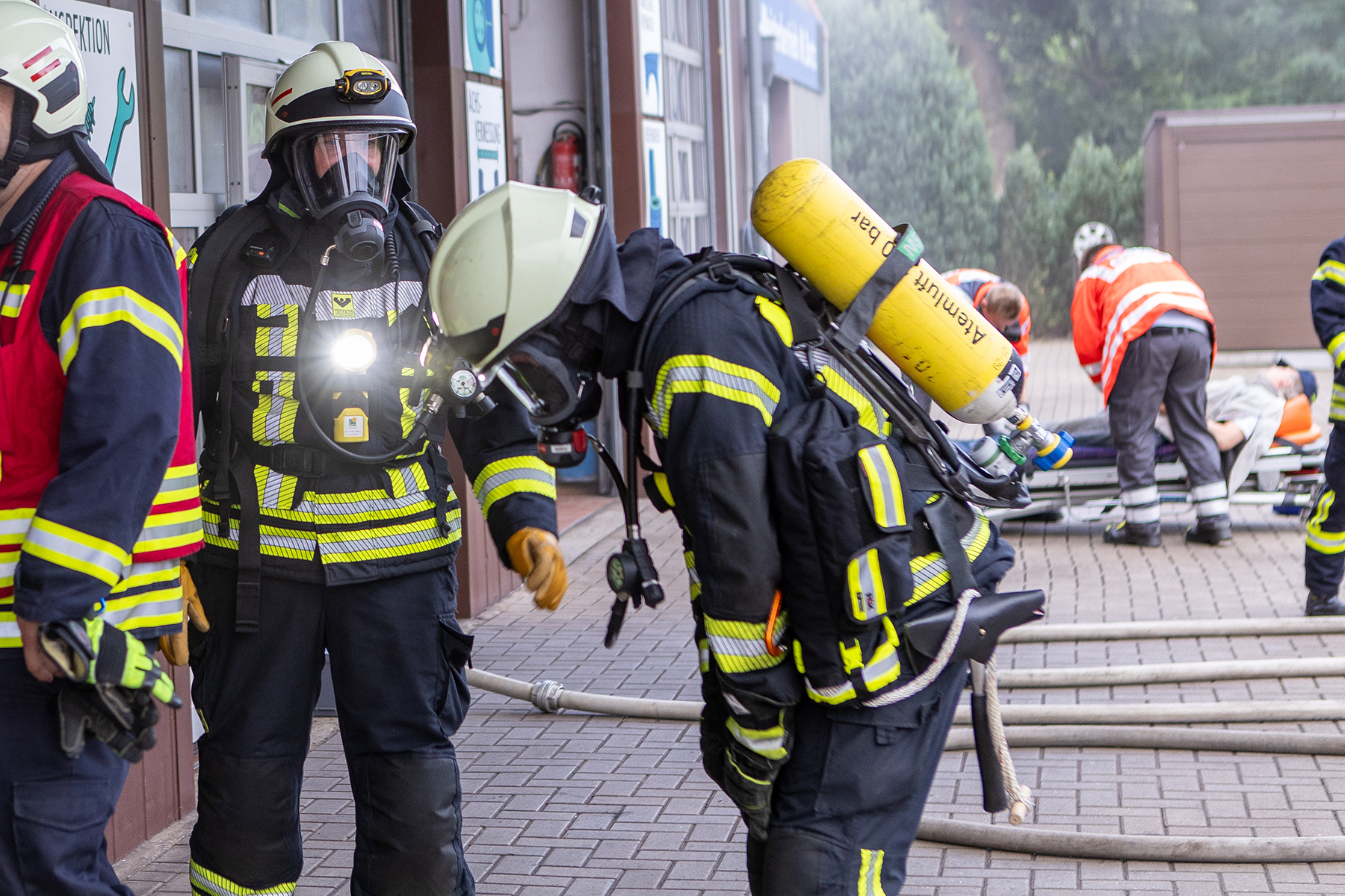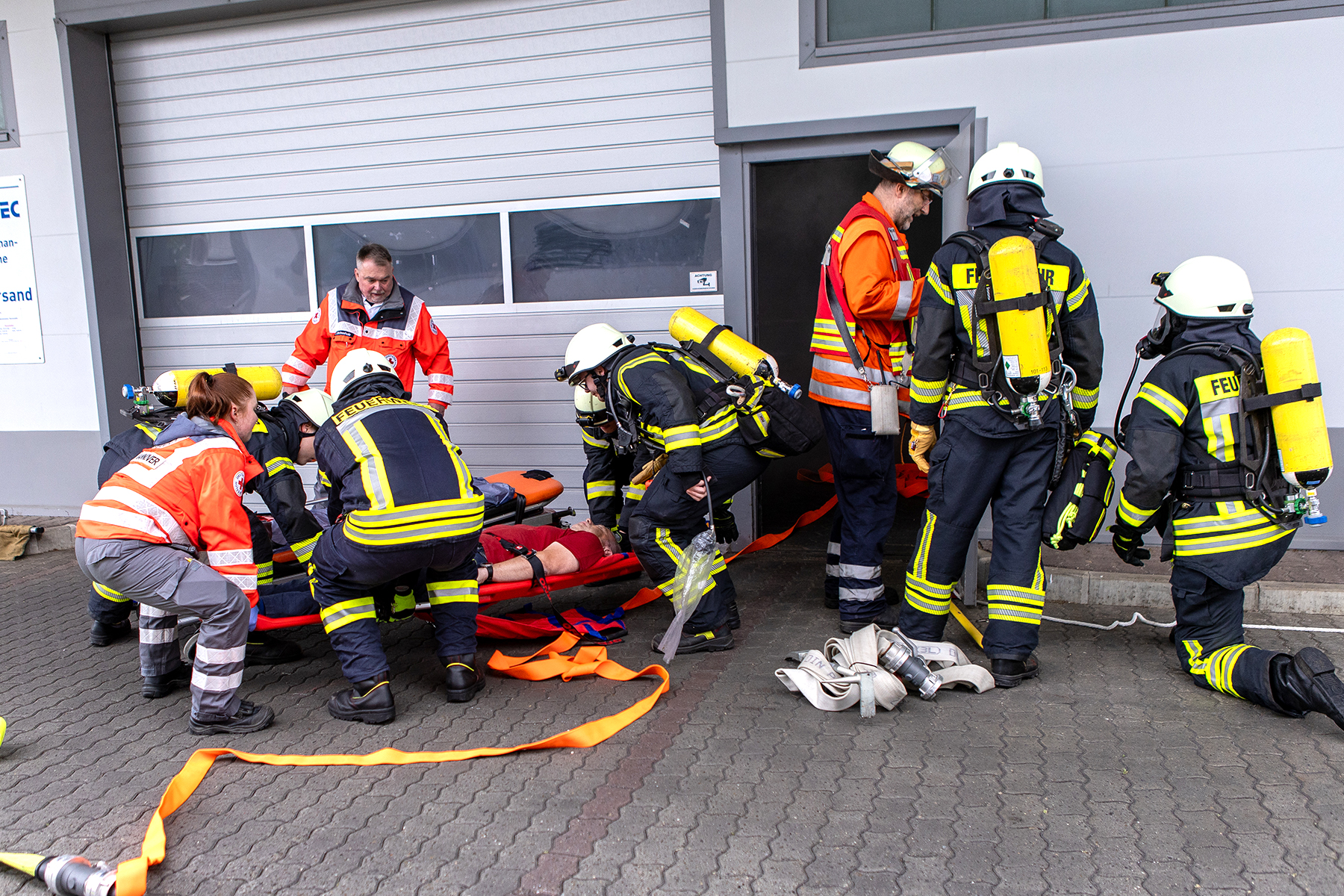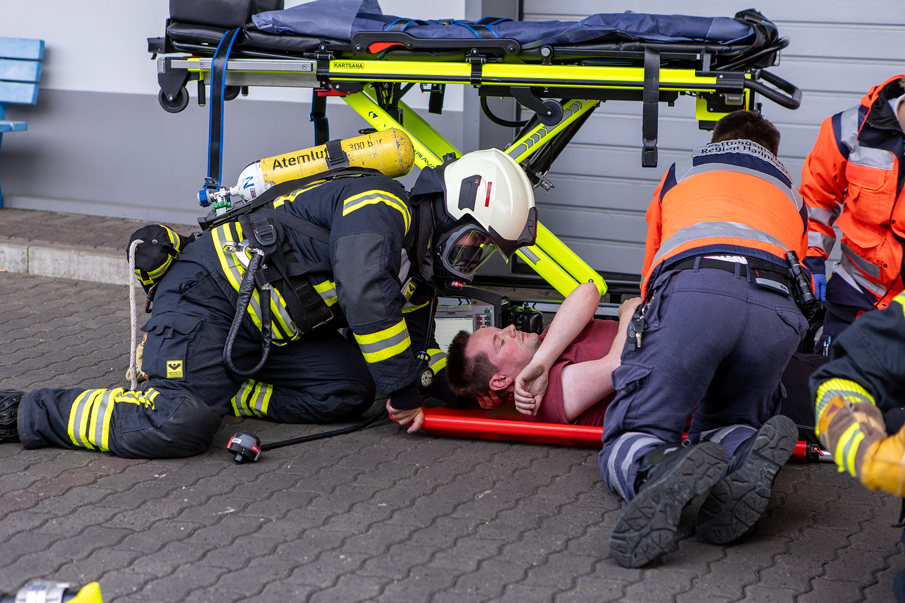 Vor Ort bot sich den insgesamt 102 Feuerwehrkräften eine im ersten Augenblick recht unübersichtliche Lage. Durch die mutmaßliche Verpuffung waren Betonteile durch die Luft geschleudert worden und hatten eine Person unter sich begraben, die durch die Feuerwehrkräfte schnell und gut befreit sowie gerettet werden und an den Rettungsdienst übergeben werden konnten.
